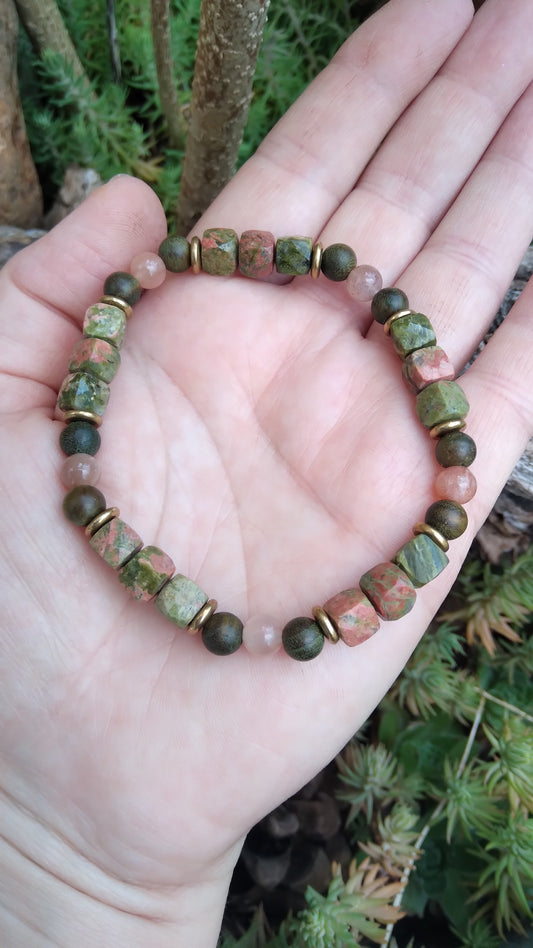 Bracelet en unakite, pierre de soleil et bois de santal "Empuissancement"