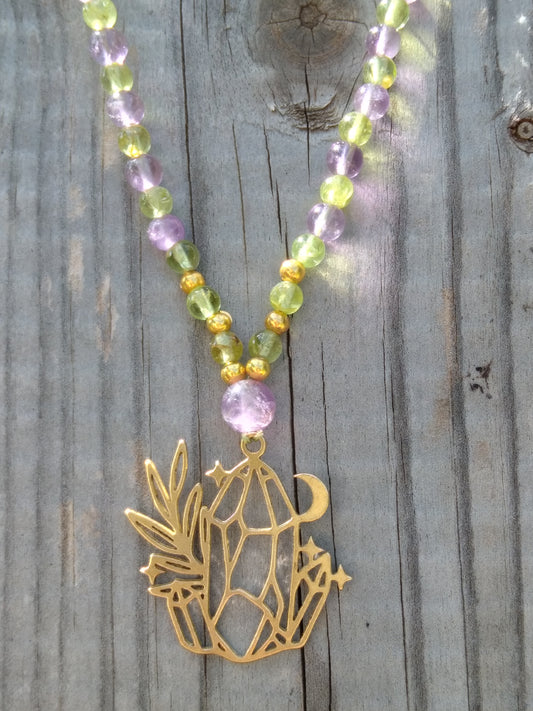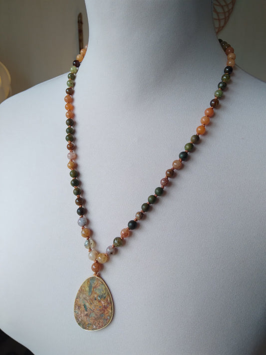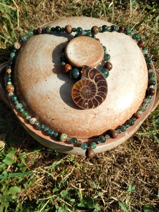 Collier mala en agate mousse, jade et ammonite "Mystère"
