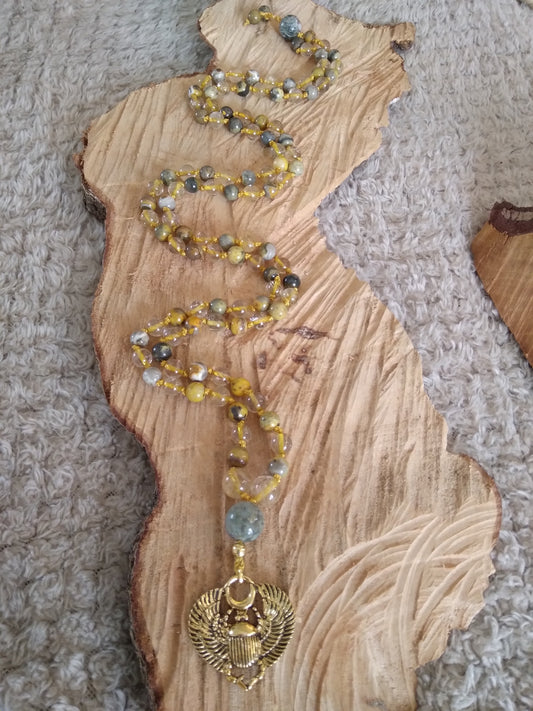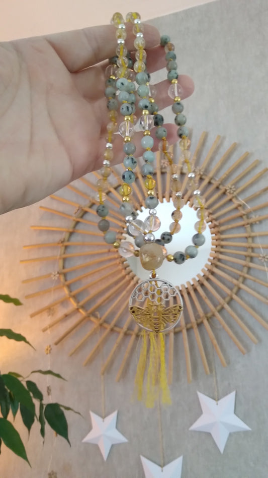 Mala "Le miel de la Vie" en quartz rutile, ambre, cristal de roche et jaspe kiwi