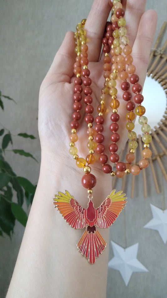 Mala personnalisé Phénix en jaspe rouge, aventurine orange, cornaline et opale jaune
