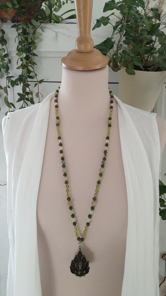 Mala "Ganesh" en jade, calcite verte et ambre vert