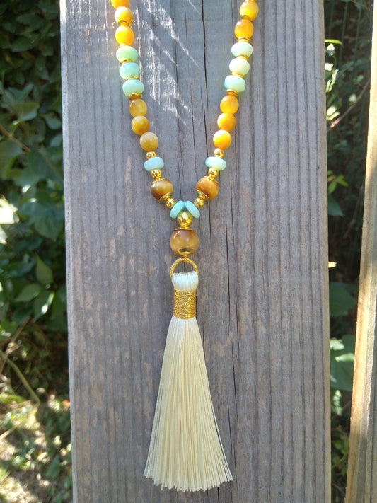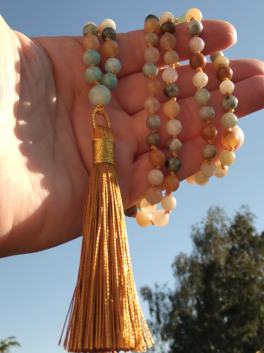 Mala en jadéite, aventurine jaune et amazonite "Cheminement"
