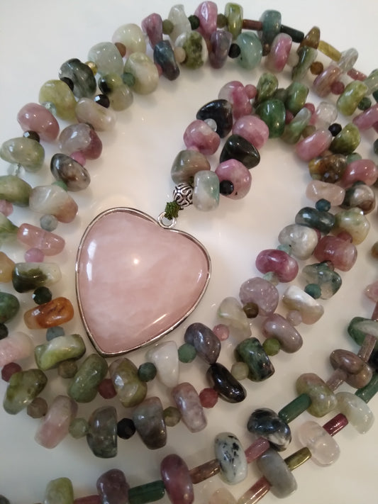 Mala en tourmaline, pendentif cœur en quartz rose "Réconfort"