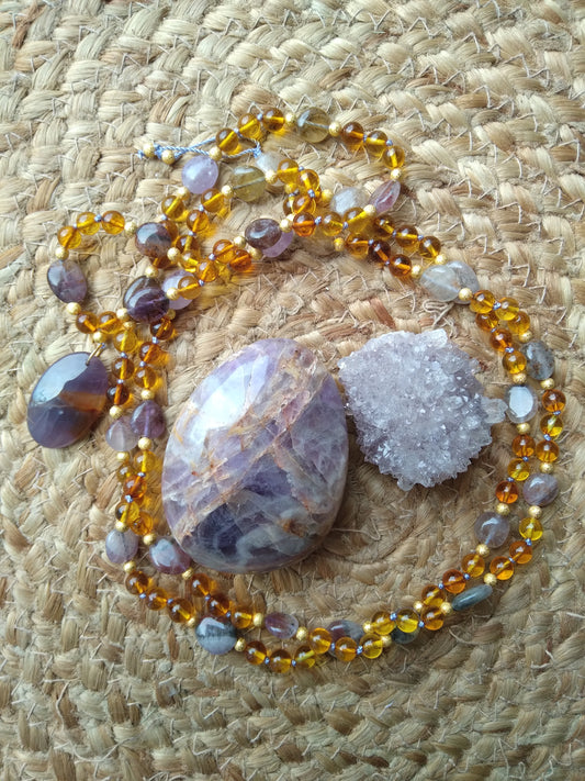 Mala en ambre et améthyste à inclusions "Bien-être"