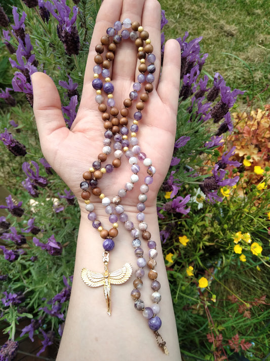 Mala en améthyste, charoïte et bois de santal "Isis"