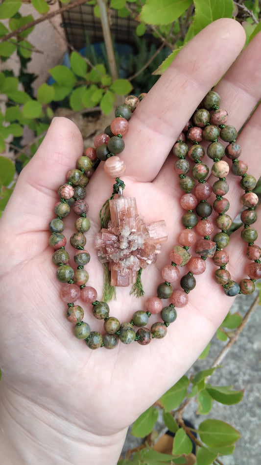 Mala en unakite, pierre de soleil, santal et aragonite "Empuissancement"