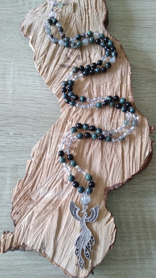 Mala phénix en jaspe kambaba, obsidienne noire, quartz lodolite et cristal de roche