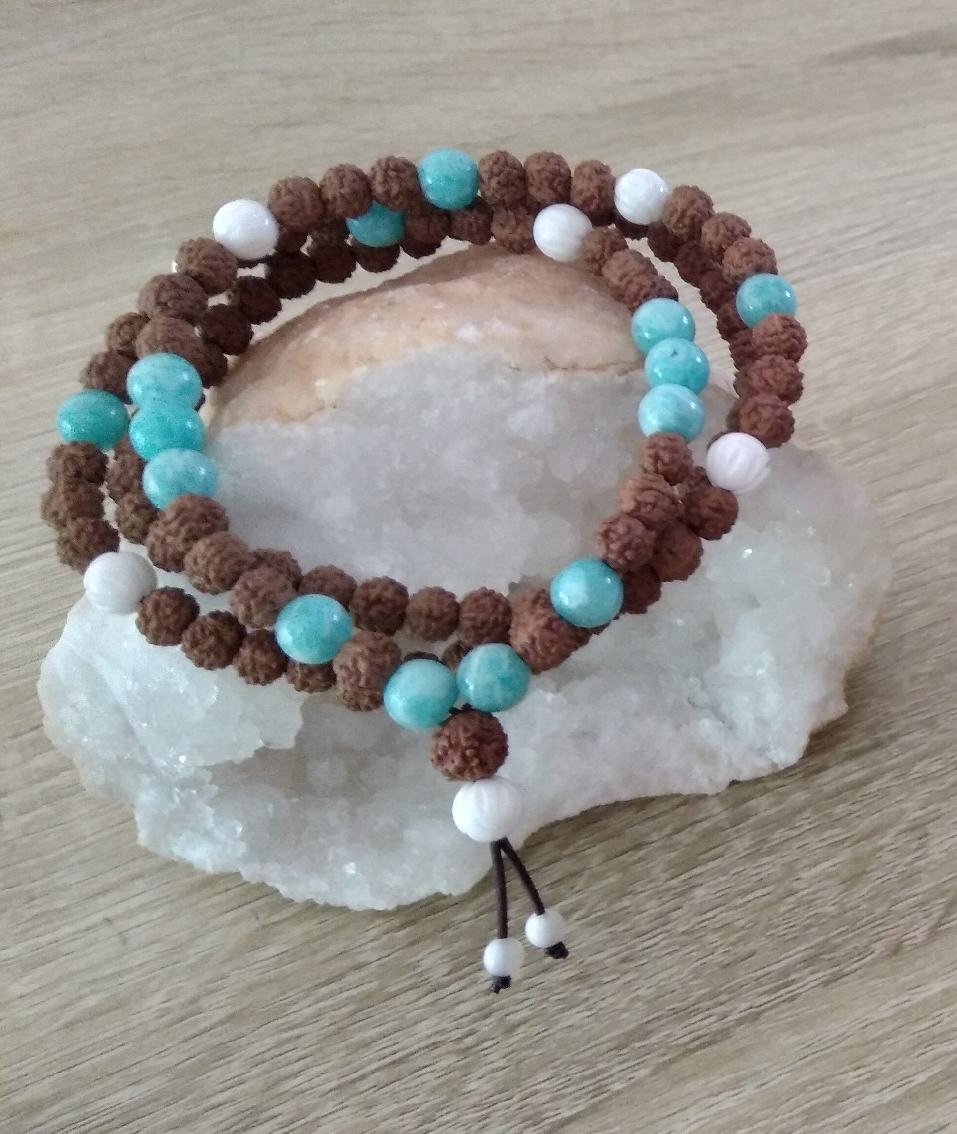 Bracelet mala en amazonite, perles de bénitier et graines de rudraksha "Lâcher-prise"