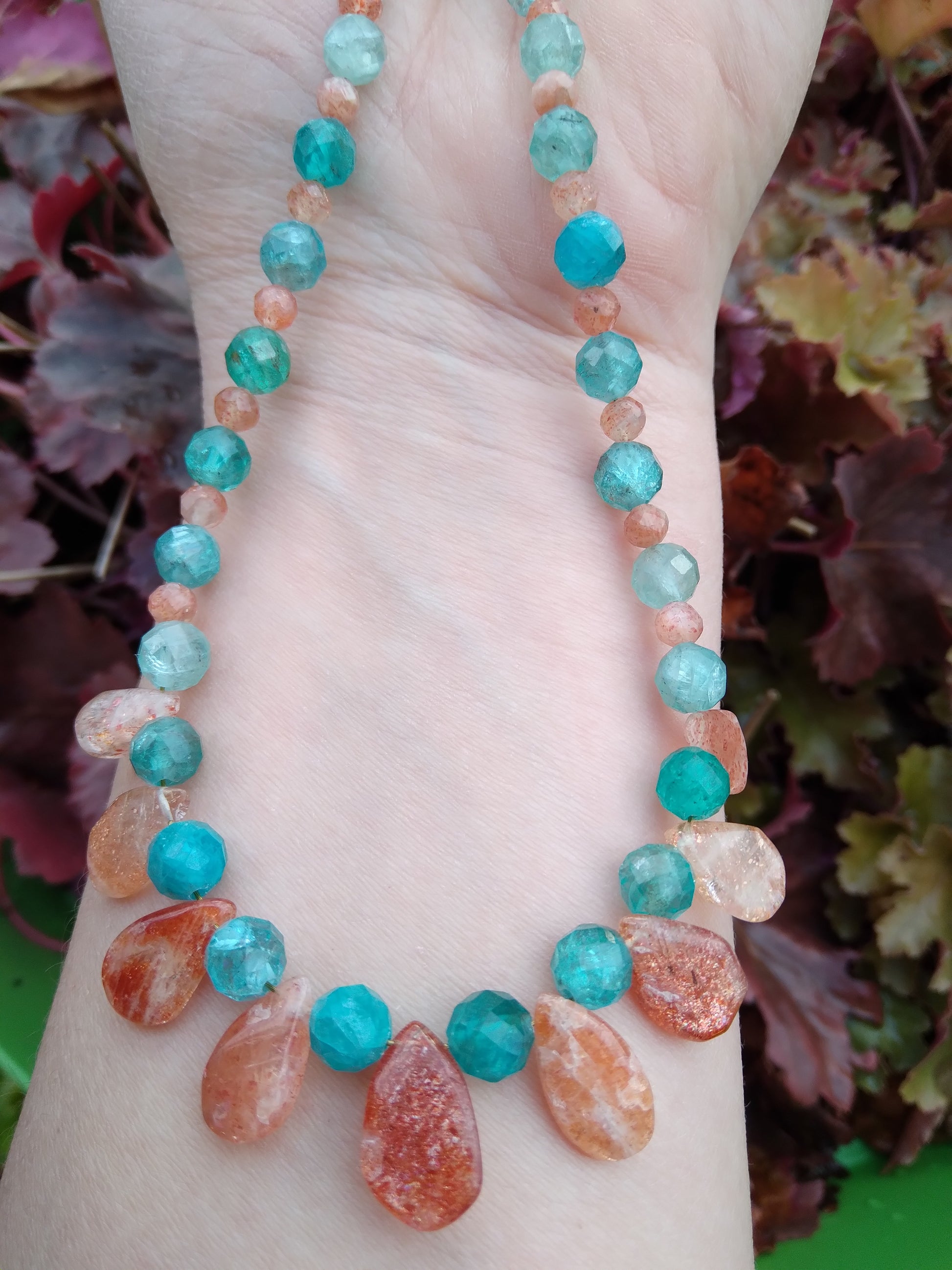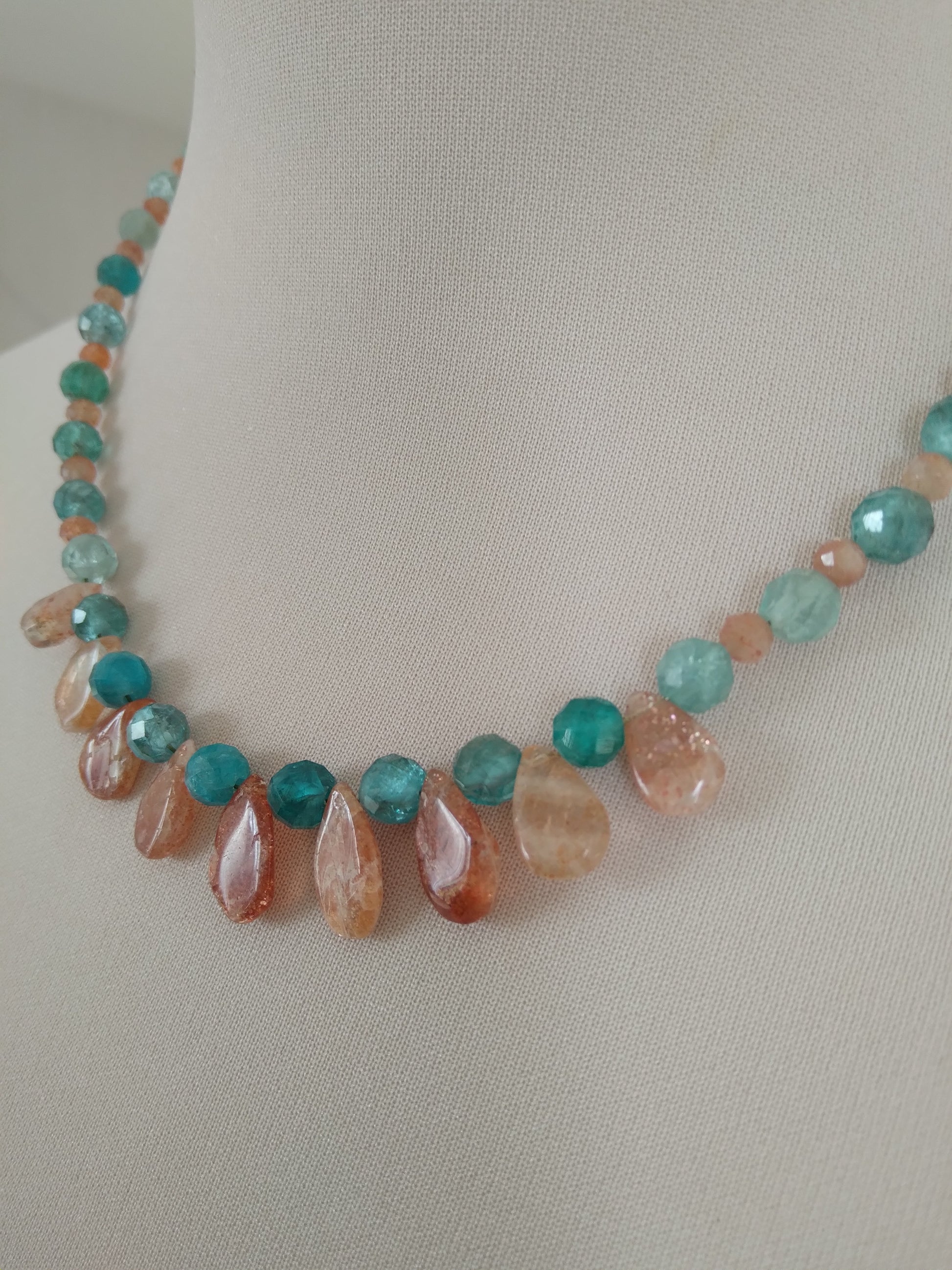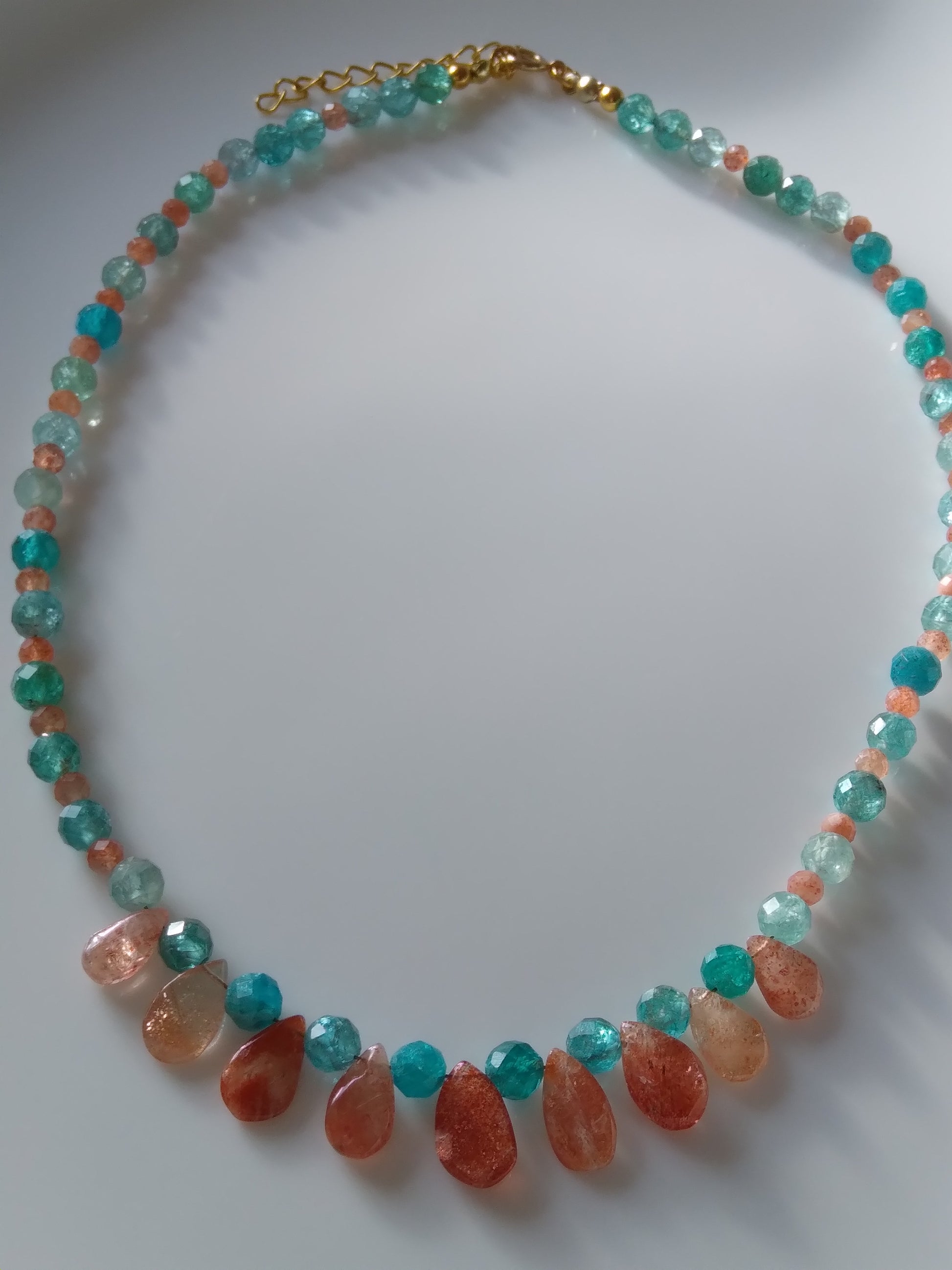 Unique model of blue apatite necklace (excellent for developing intuition, mental clarity and any new project) and sunstone (supports joie de vivre, spontaneity, creativity, laughter)