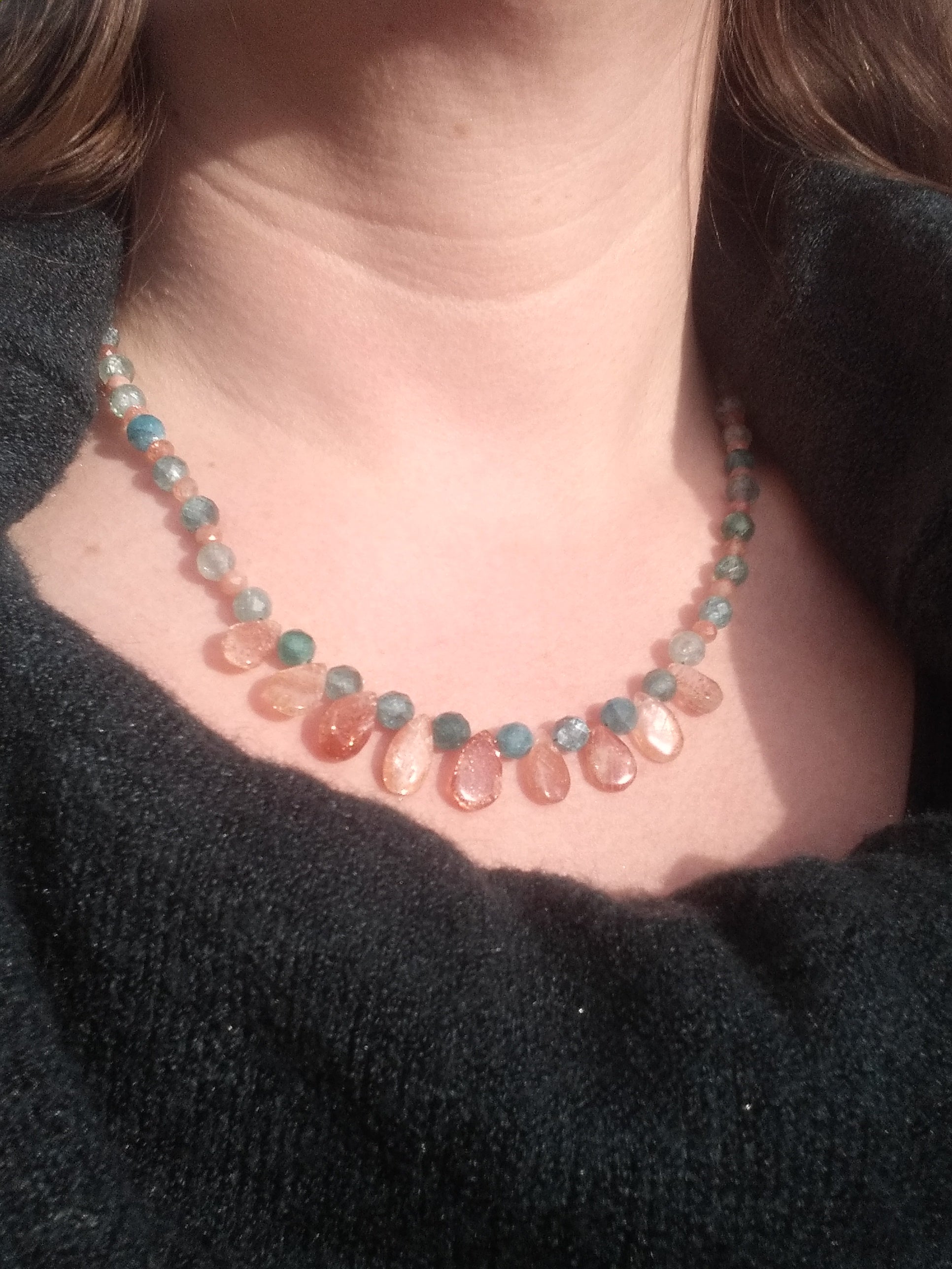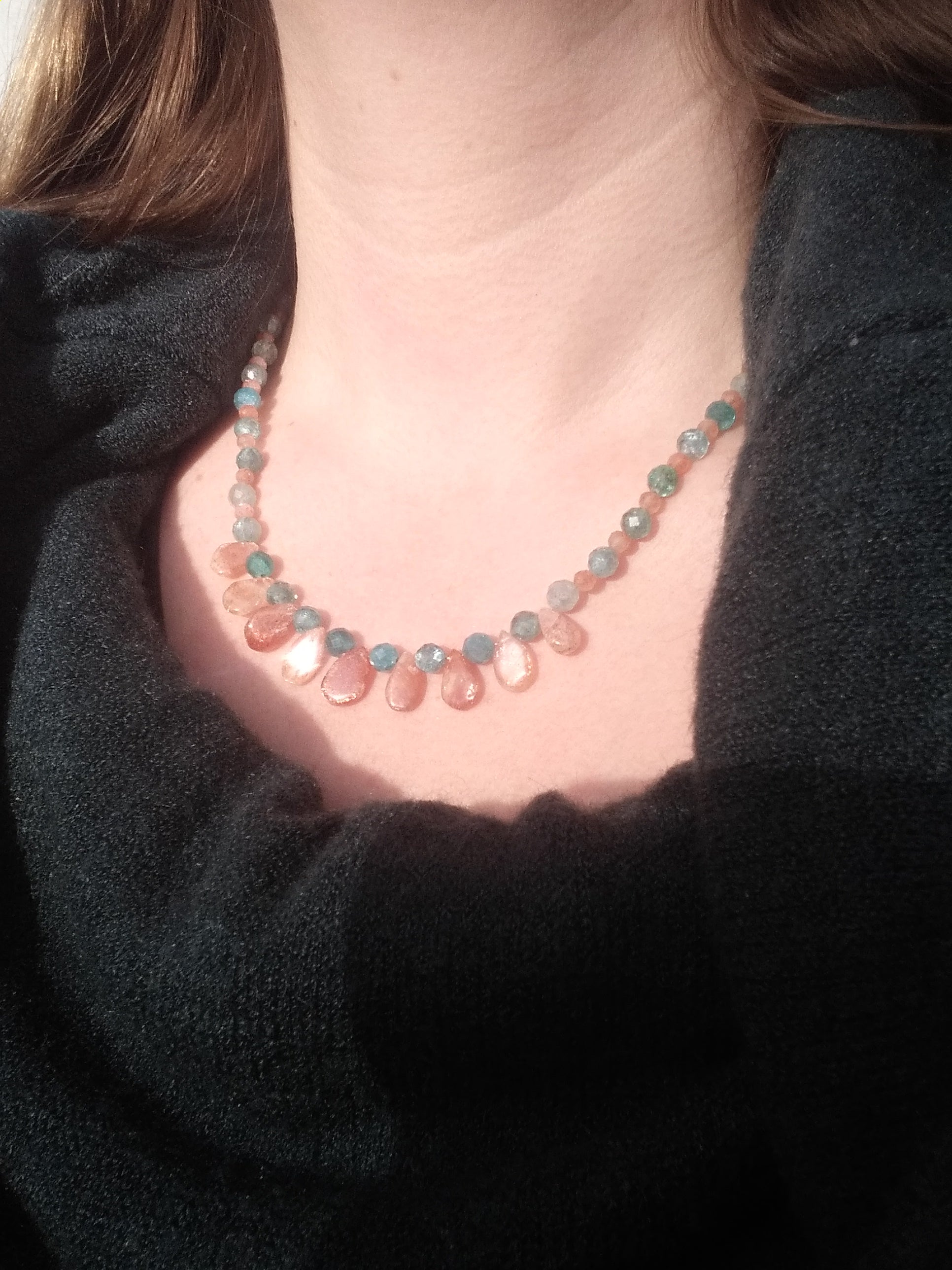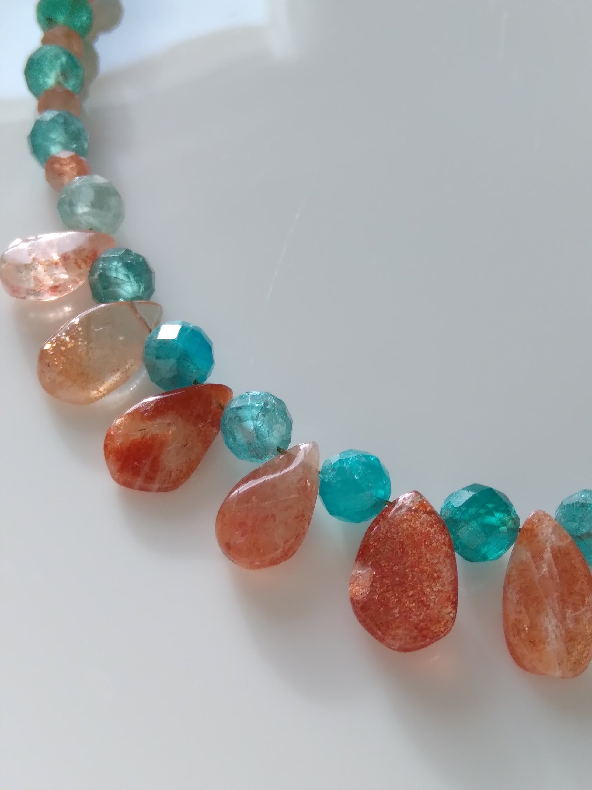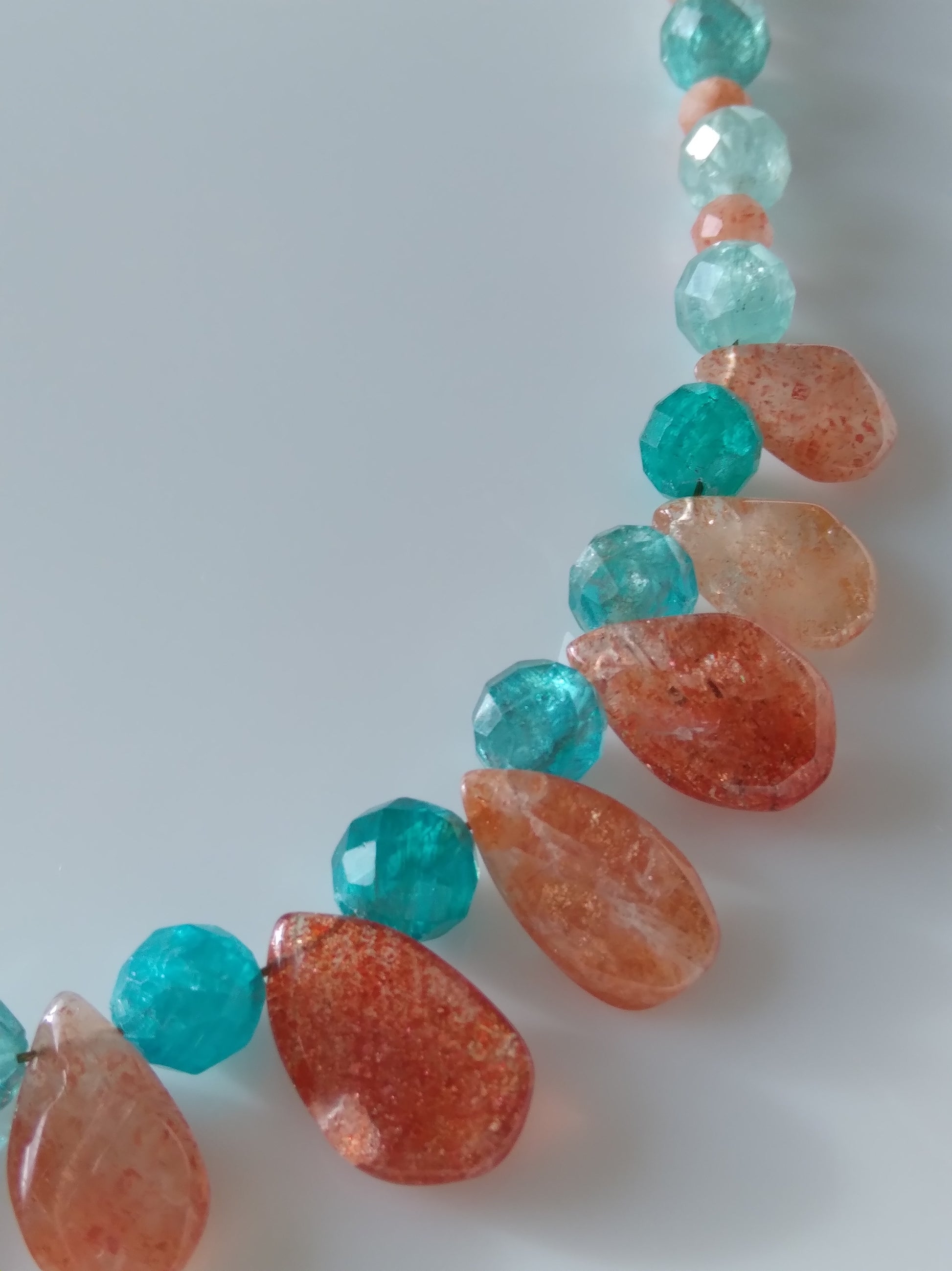 Unique model of blue apatite necklace (excellent for developing intuition, mental clarity and any new project) and sunstone (supports joie de vivre, spontaneity, creativity, laughter)