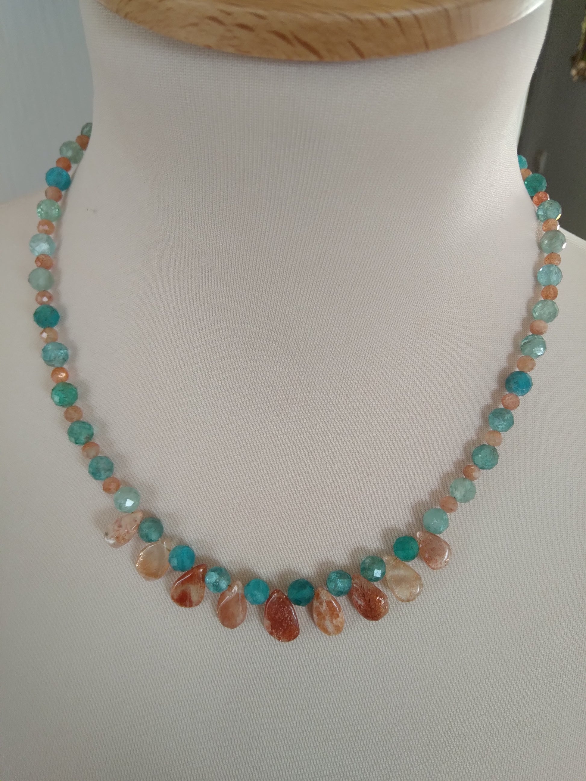 Modèle unique de collier en apatite bleue (excellente pour développer l'intuition, la clarté mentale et tout nouveau projet) et en pierre de soleil (soutient la joie de vivre, la spontanéité, la créativité, le rire)
