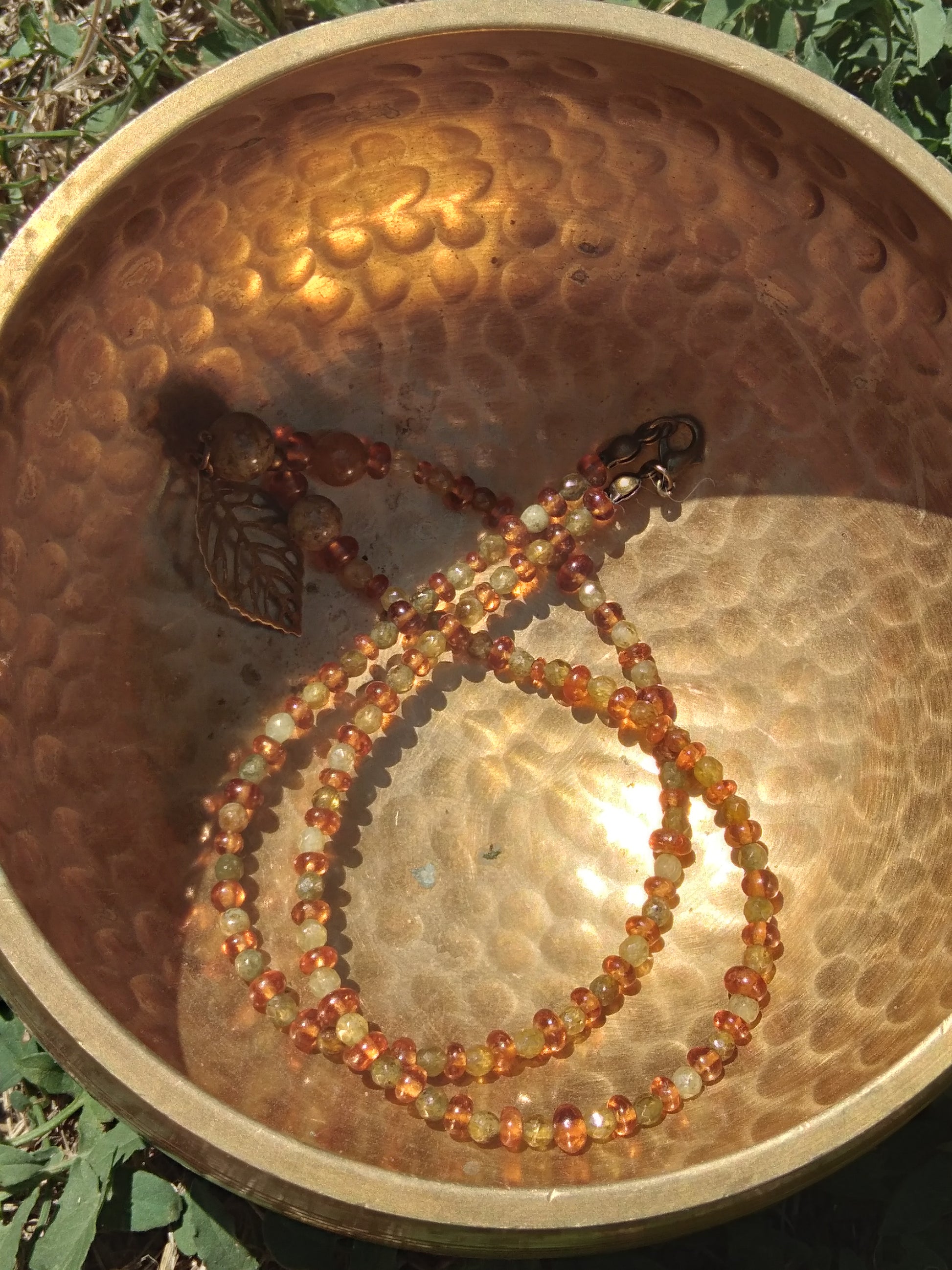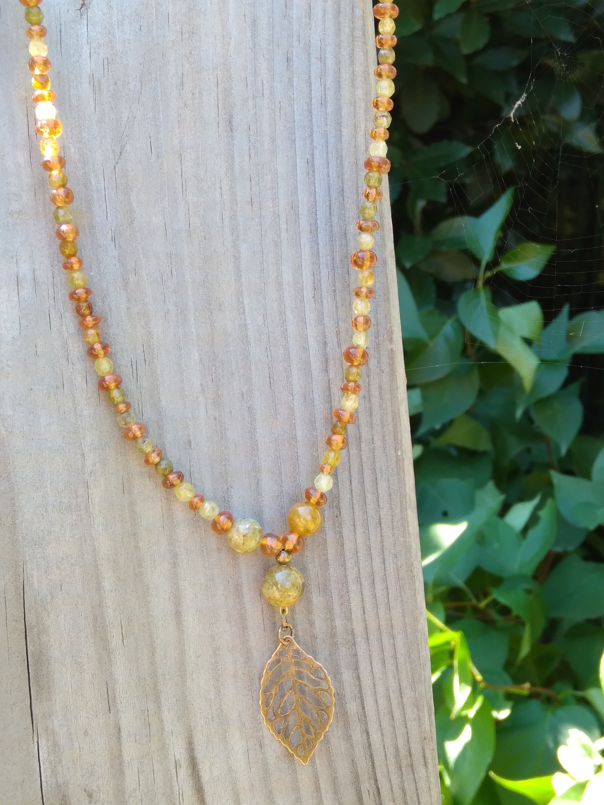 Ce collier est composé de petites perles rondelles en grenat hessonite de 3-4 mm et de perles facettées en grenat vert de 3 mm. Elles sont montées sur un fil en métal câblé doré et associées à une breloque feuille de 2,35 cm tout en finesse.