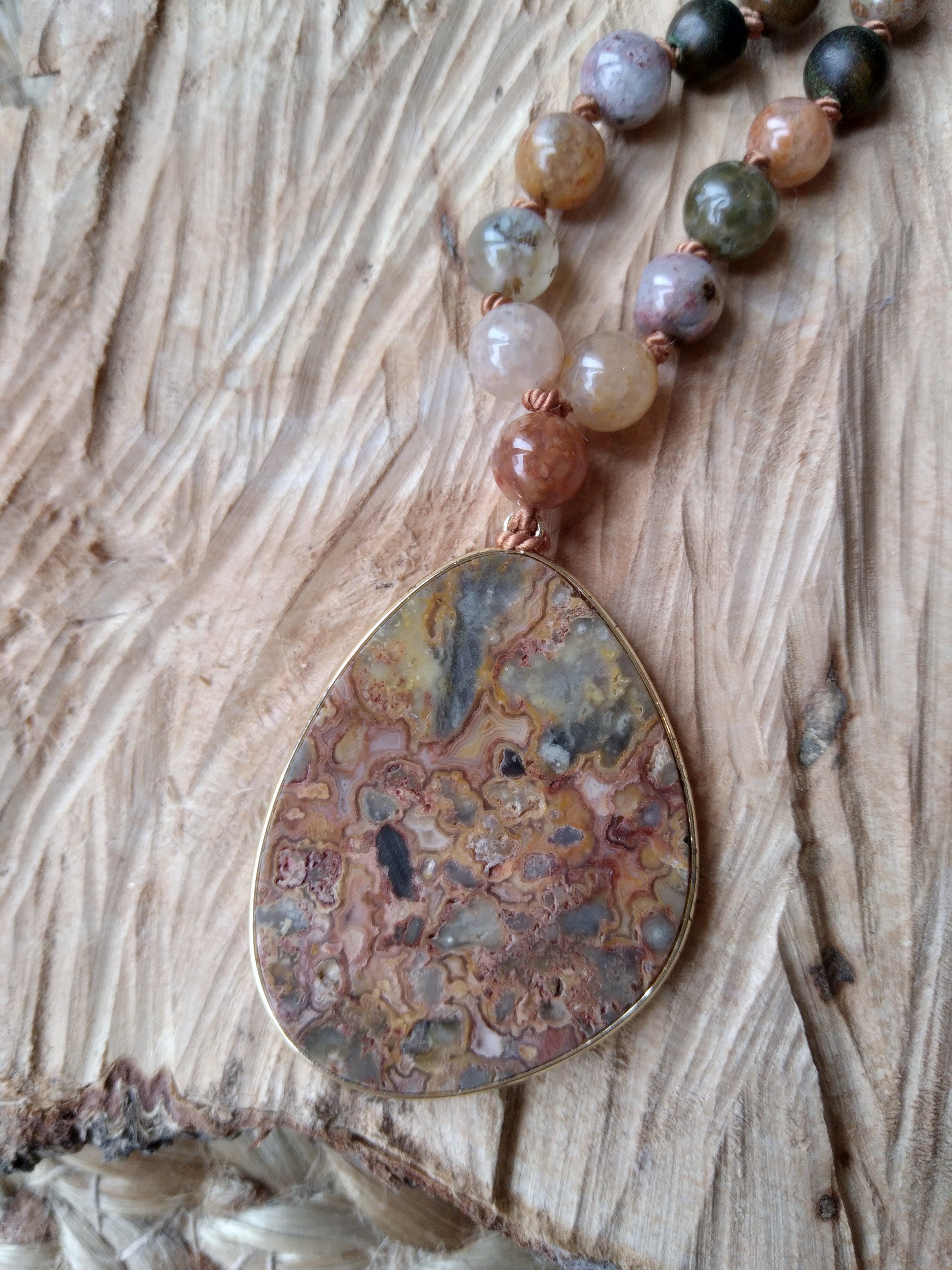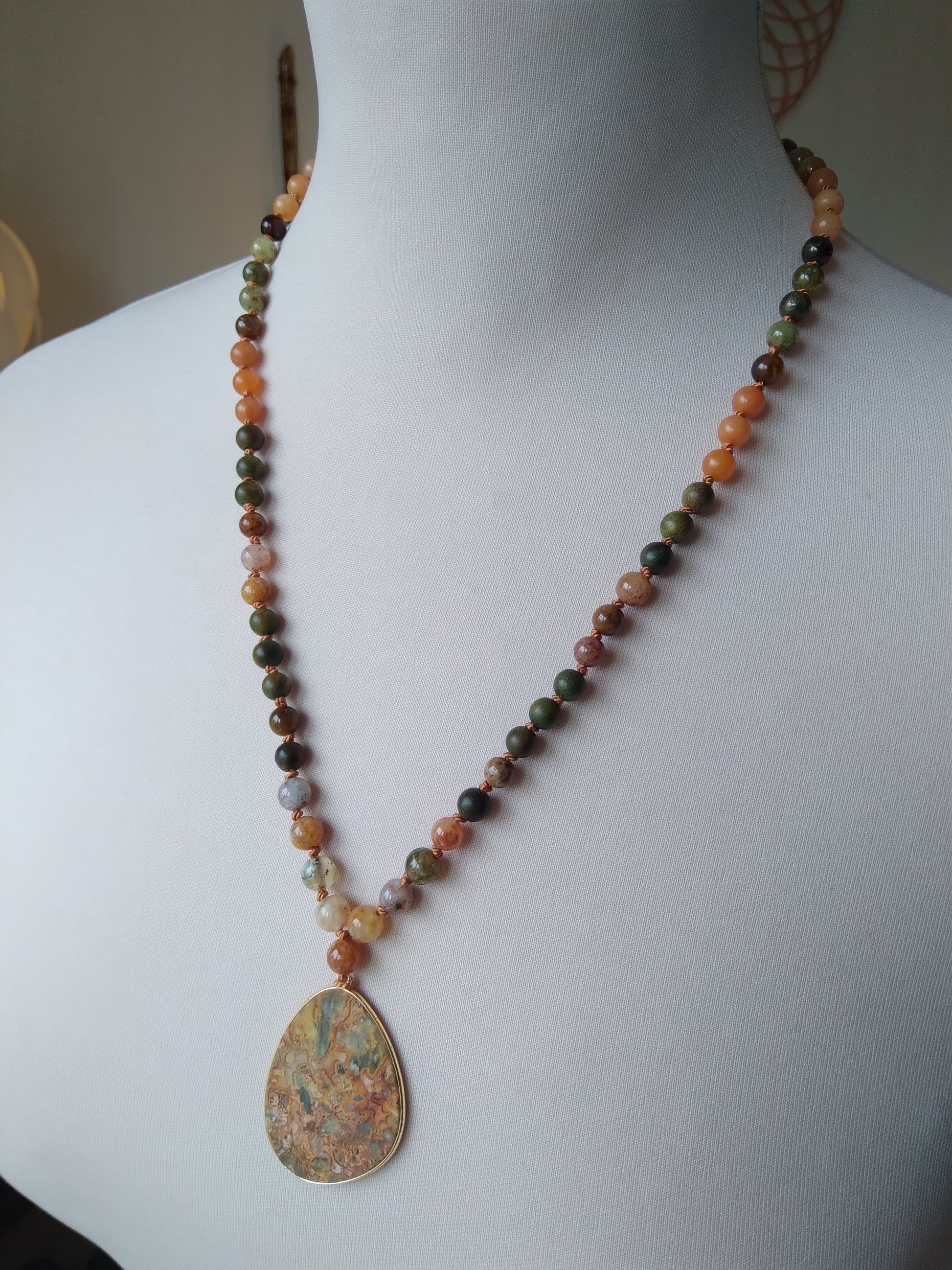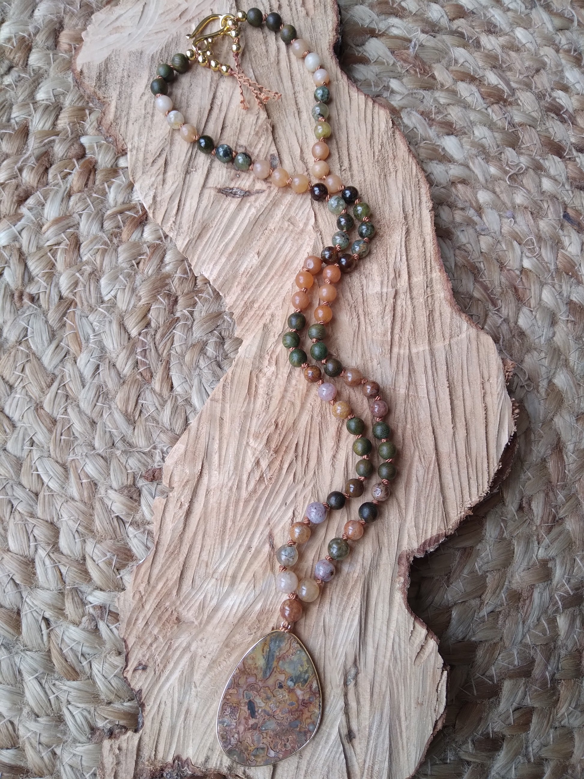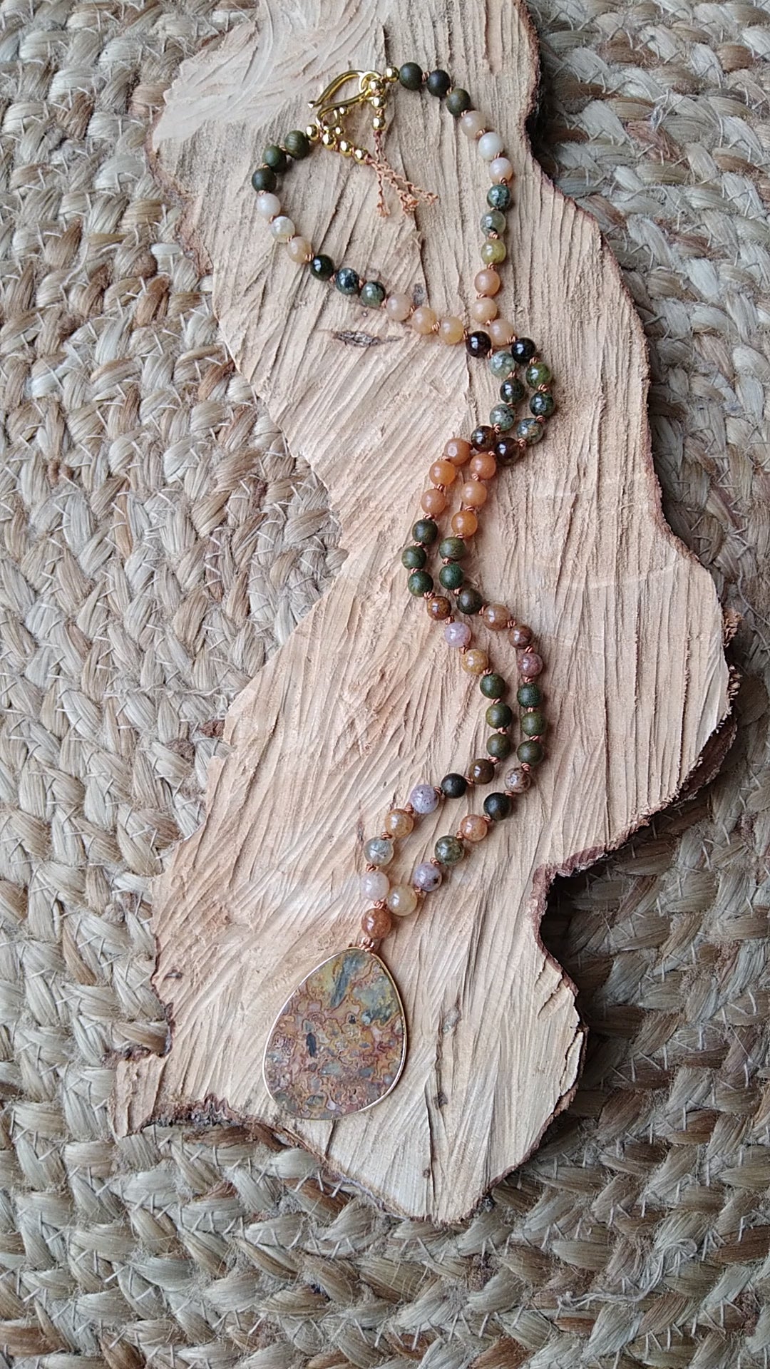 Un collier composé de perles en jaspe océan, aventurine orange, grenat vert et bois de santal vert accompagné d'un pendentif en agate crazy lace