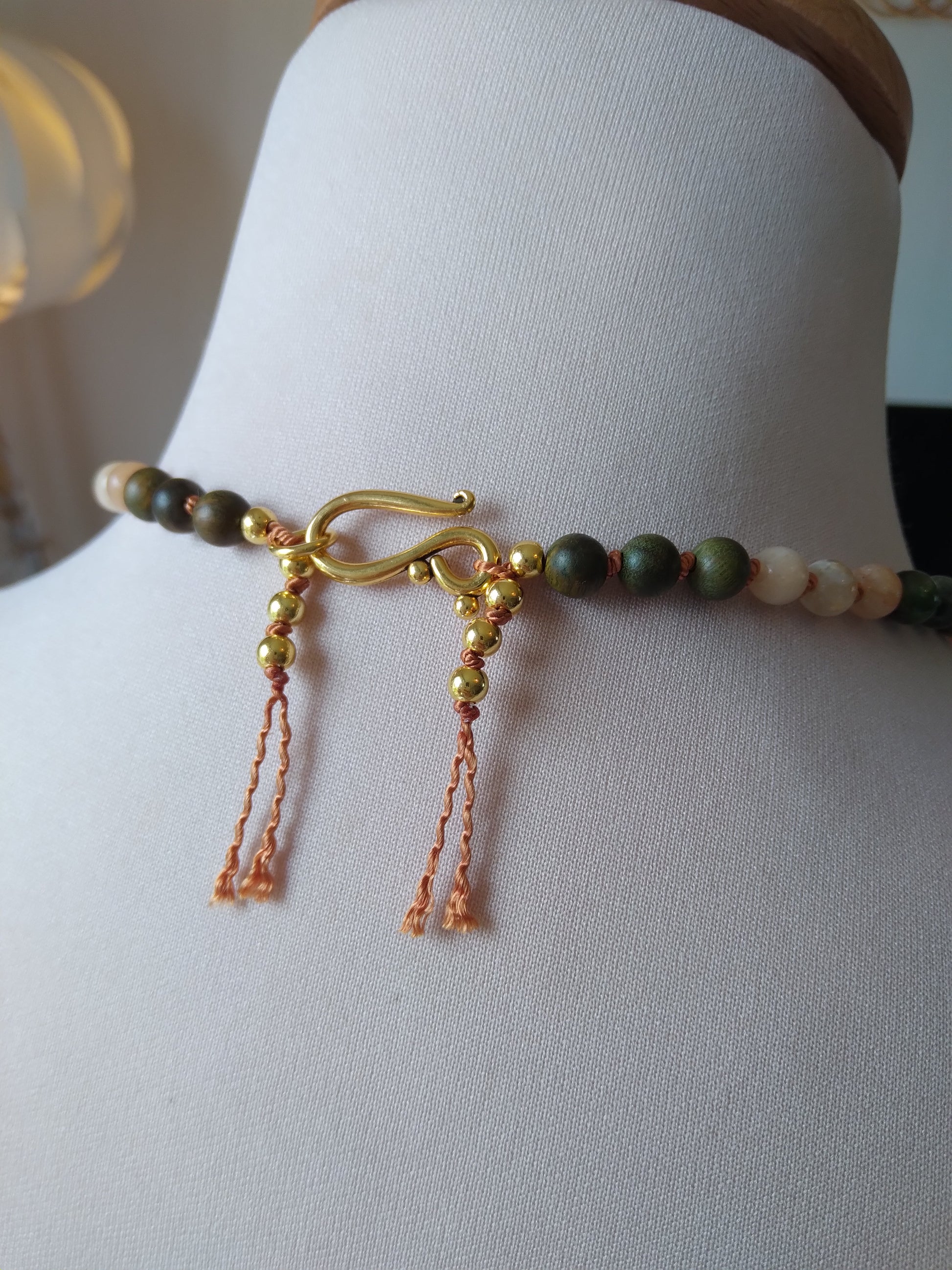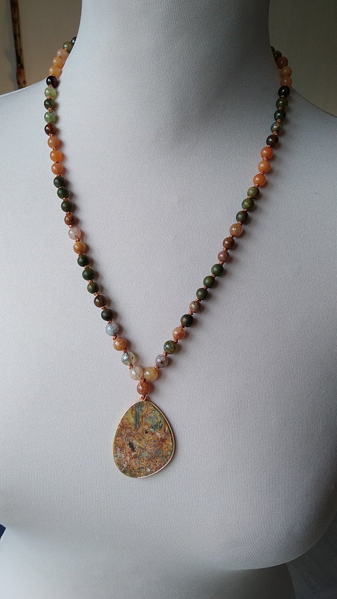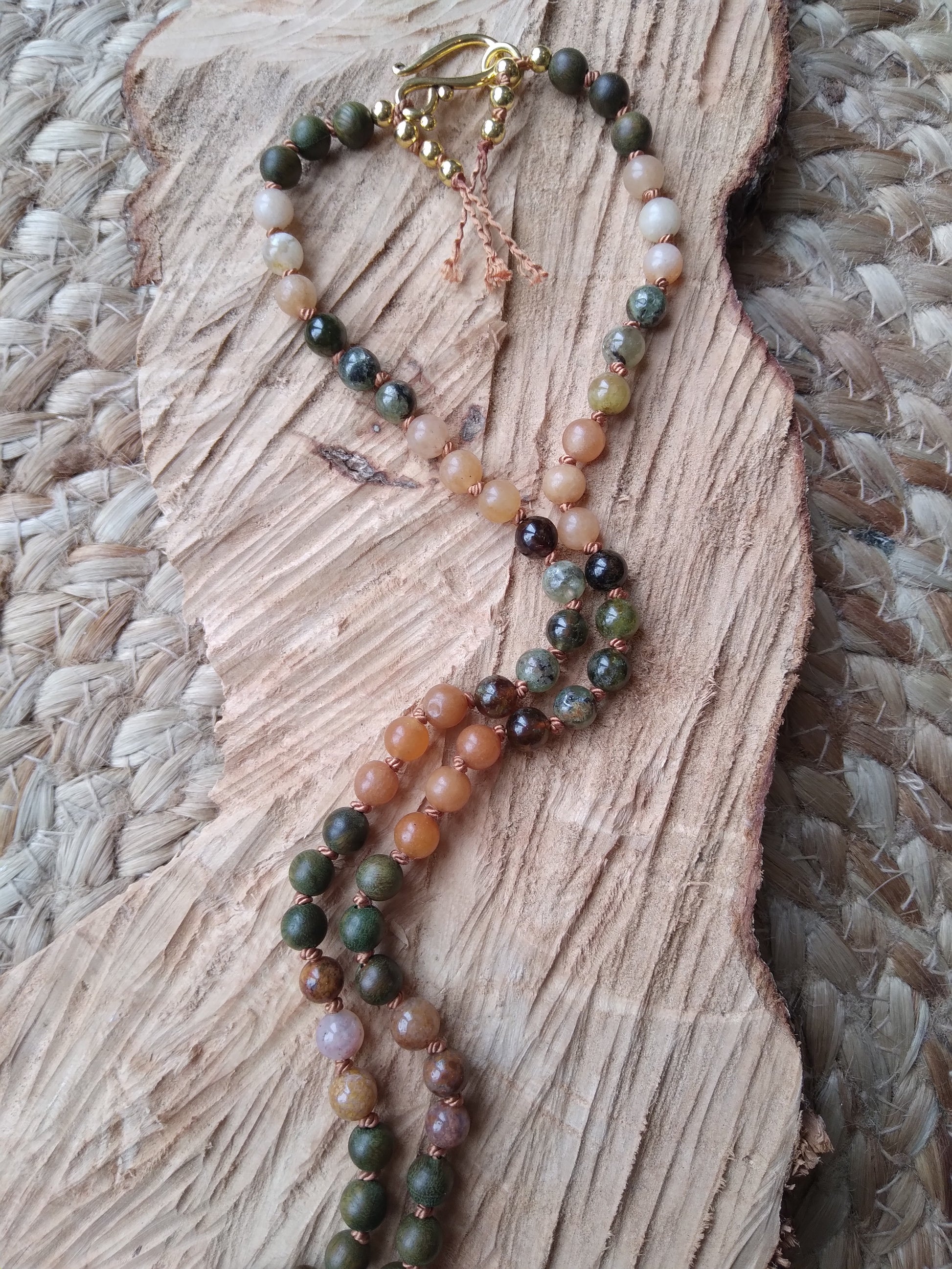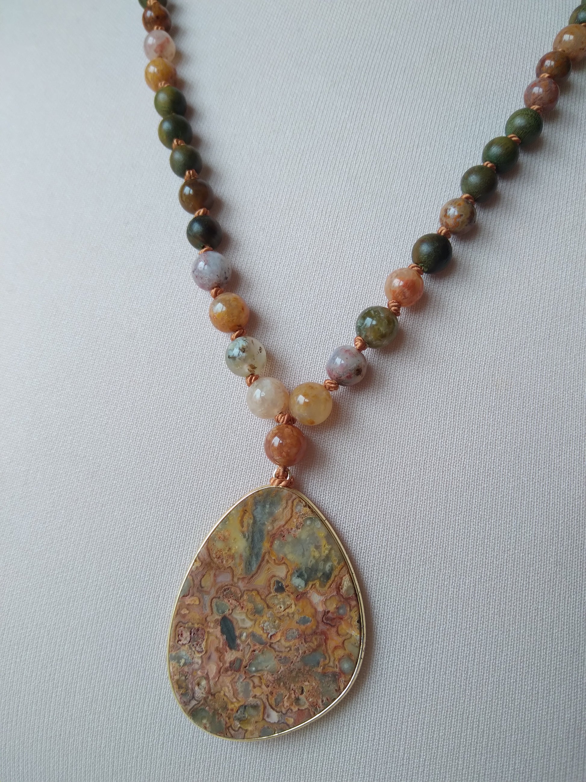 Un collier composé de perles en jaspe océan, aventurine orange, grenat vert et bois de santal vert accompagné d'un pendentif en agate crazy lace