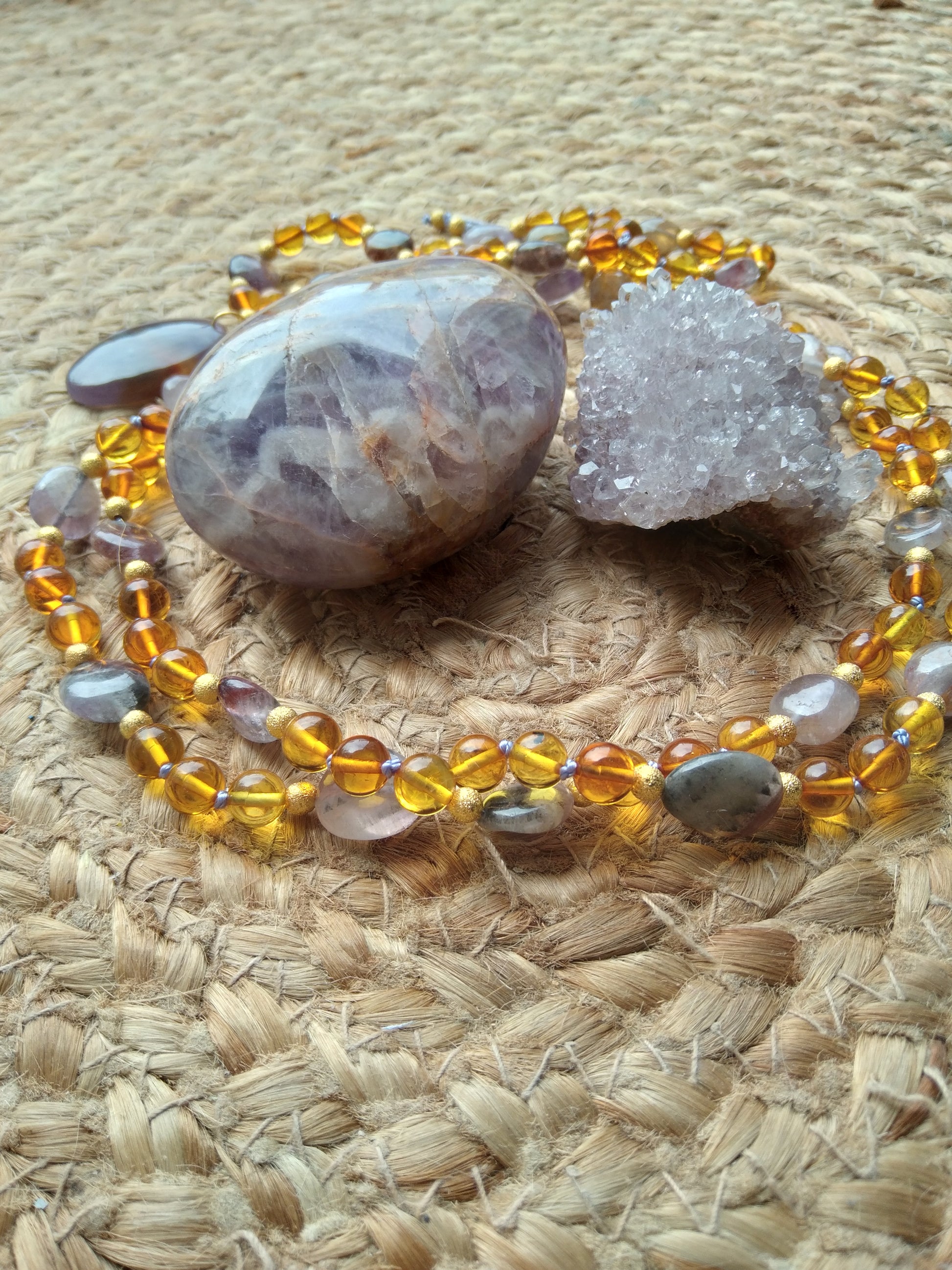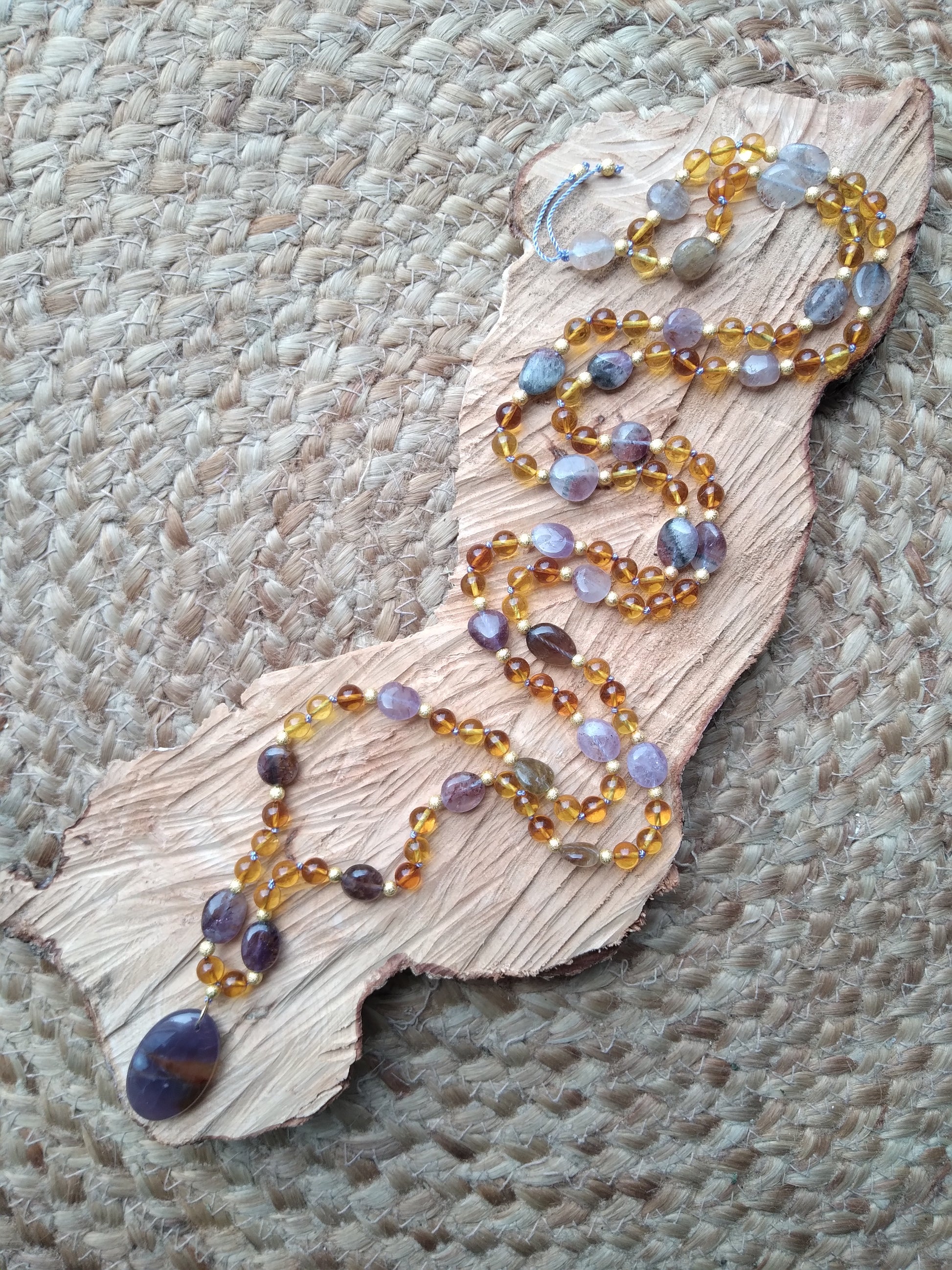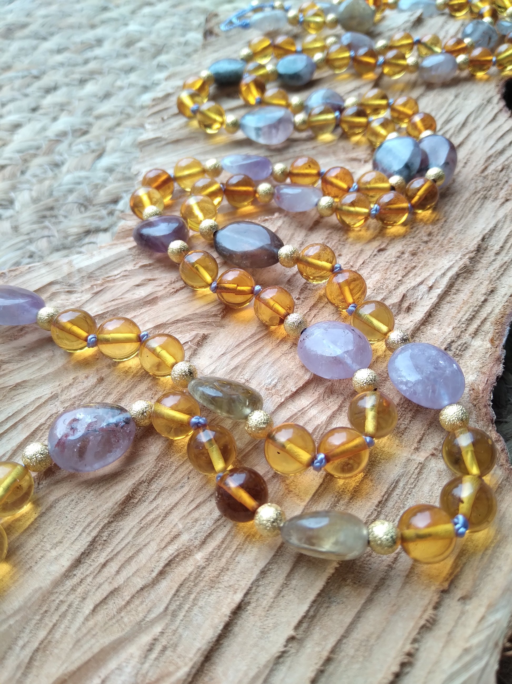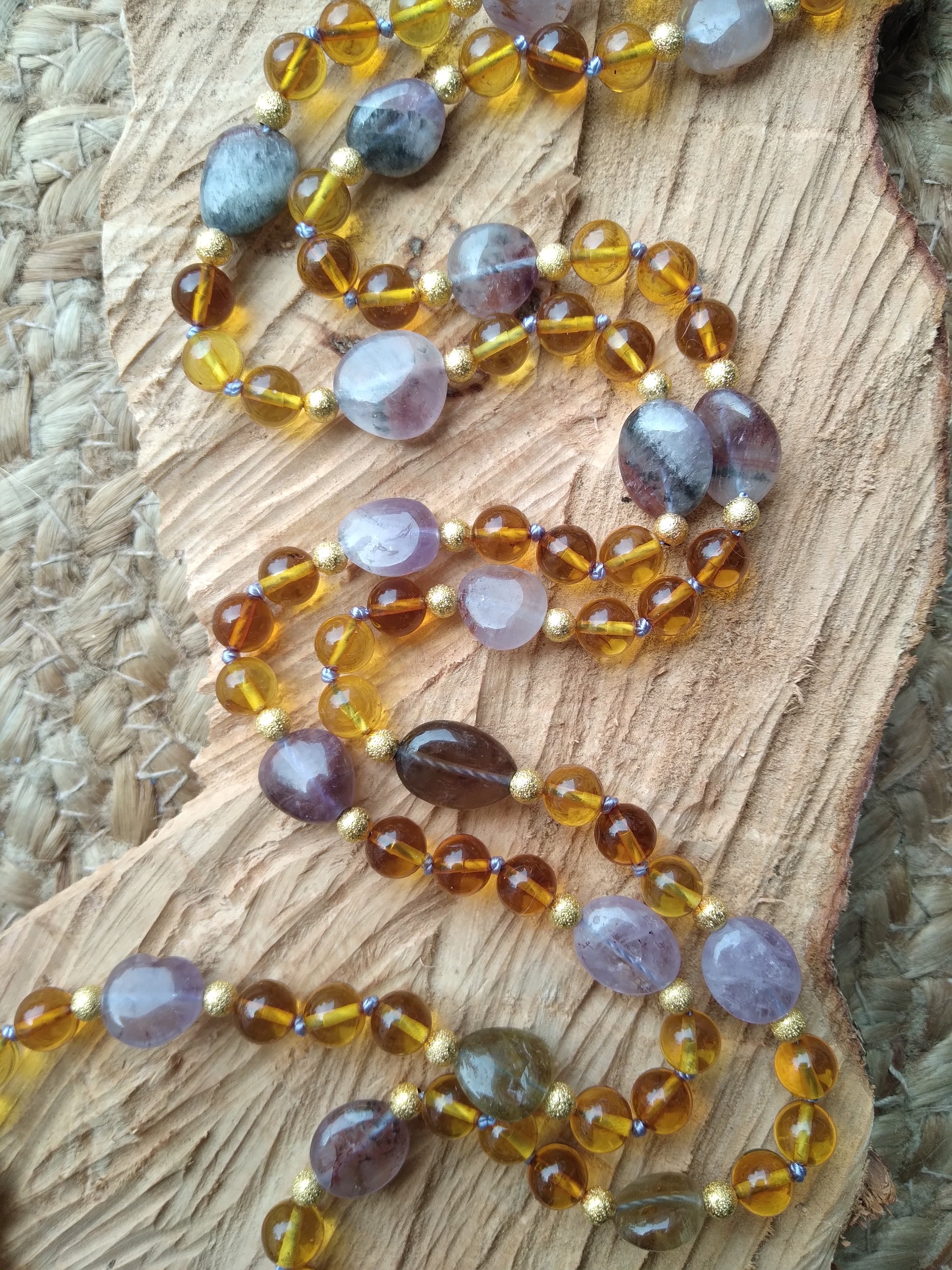 Je te présente l'alliance à la fois douce et chaleureuse de l'ambre et de l'améthyste. C'est un joli mala pour l'automne.