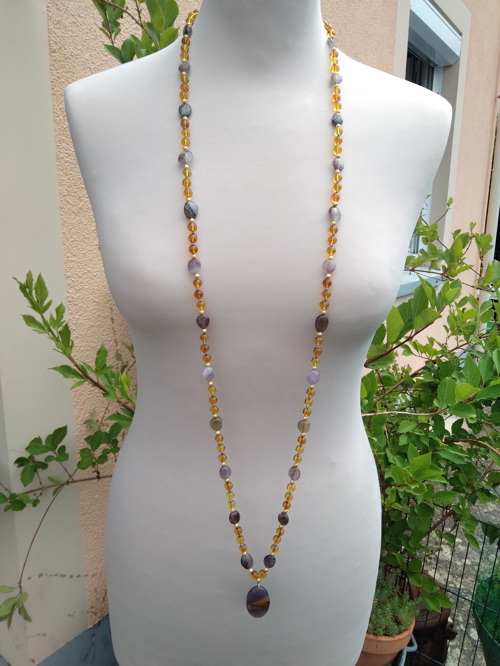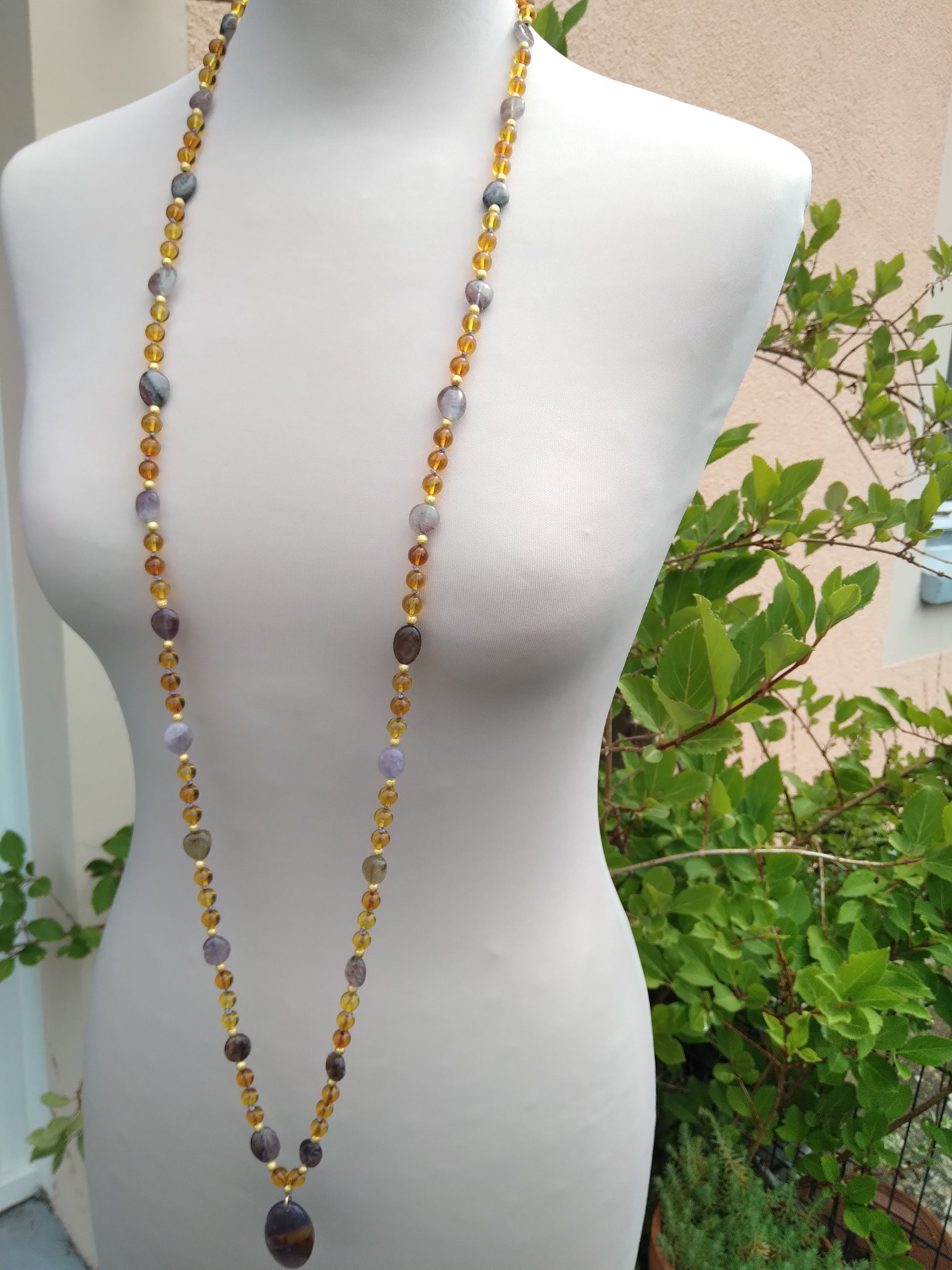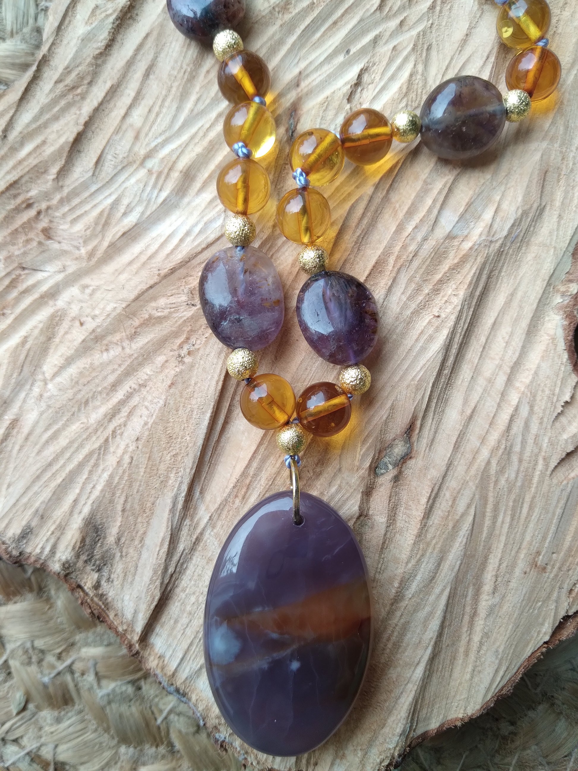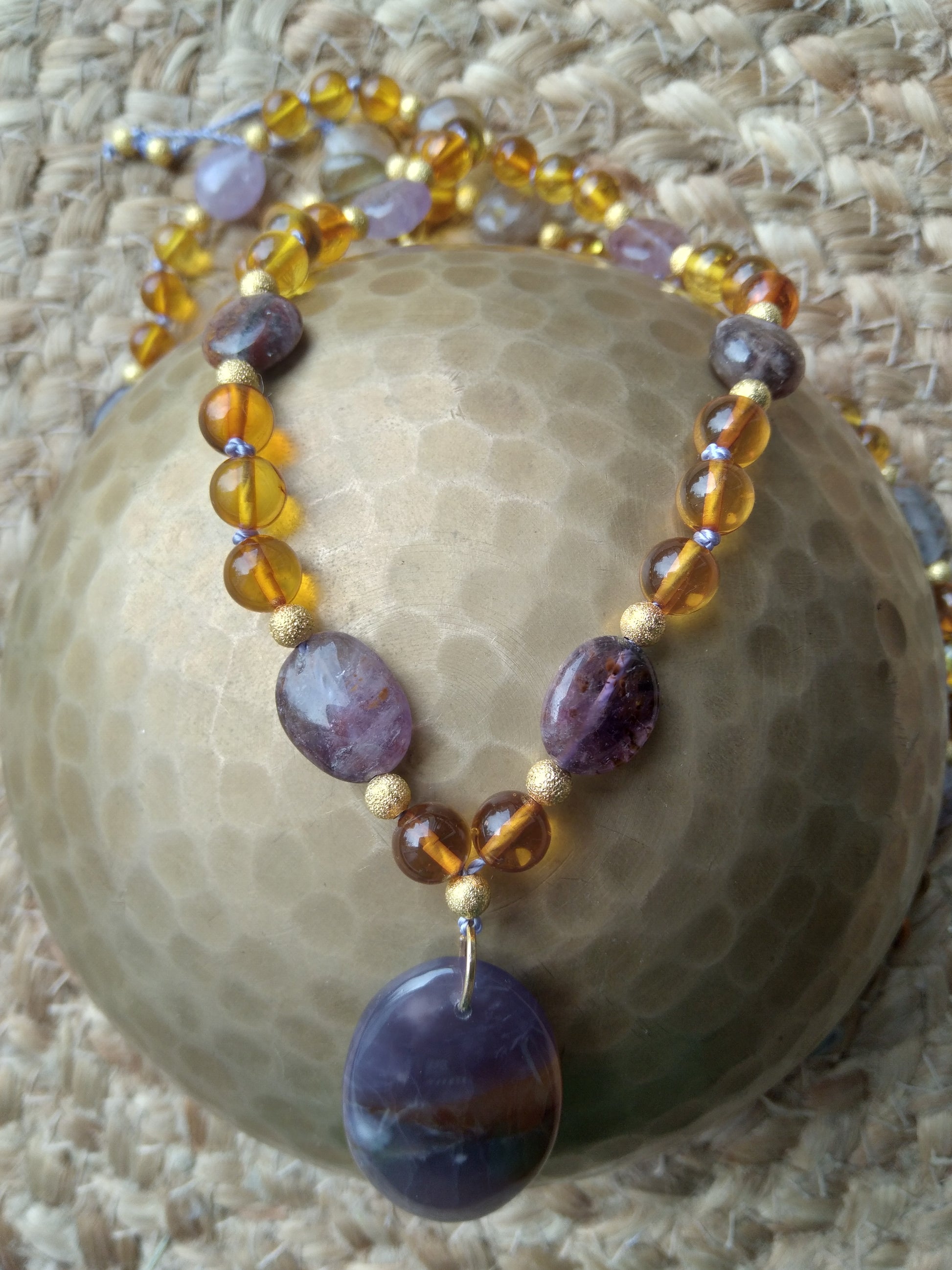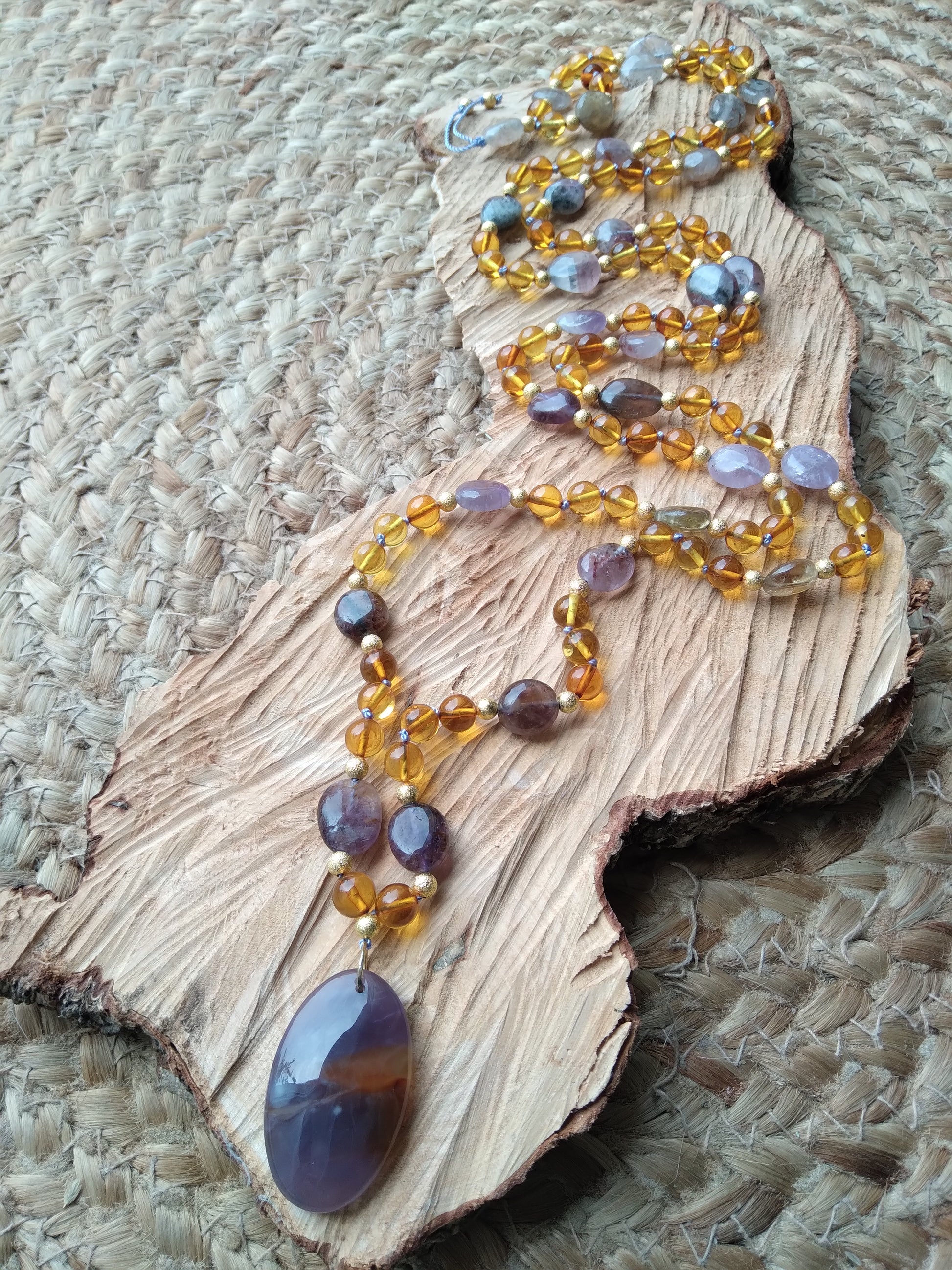 Je te présente l'alliance à la fois douce et chaleureuse de l'ambre et de l'améthyste. C'est un joli mala pour l'automne.