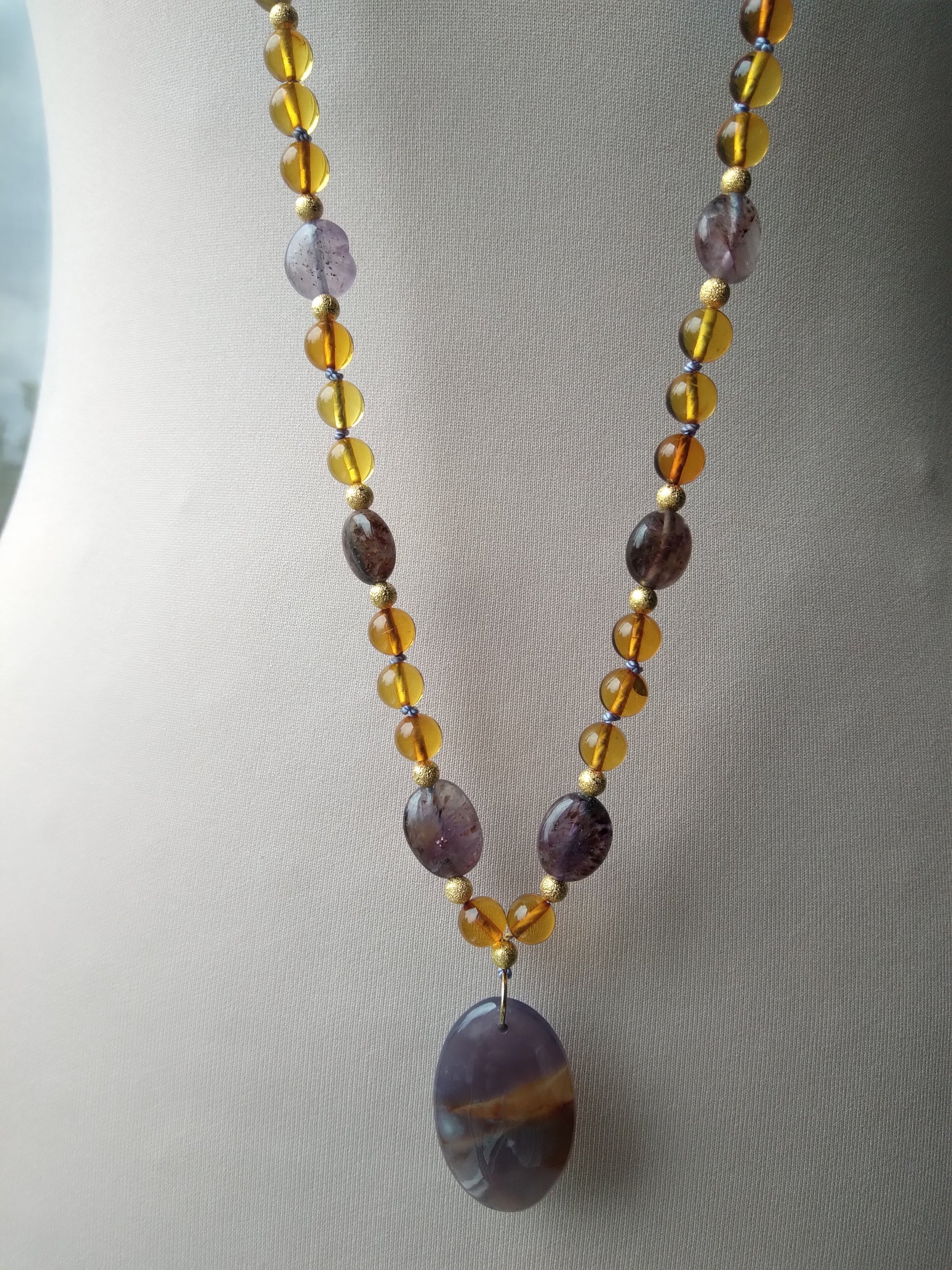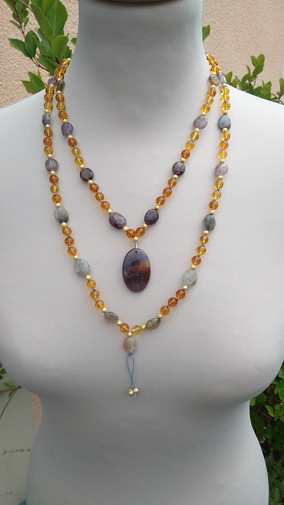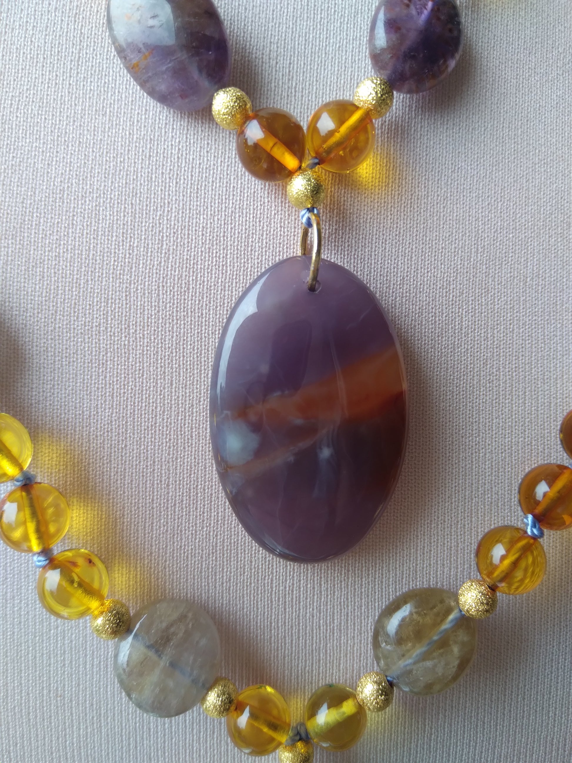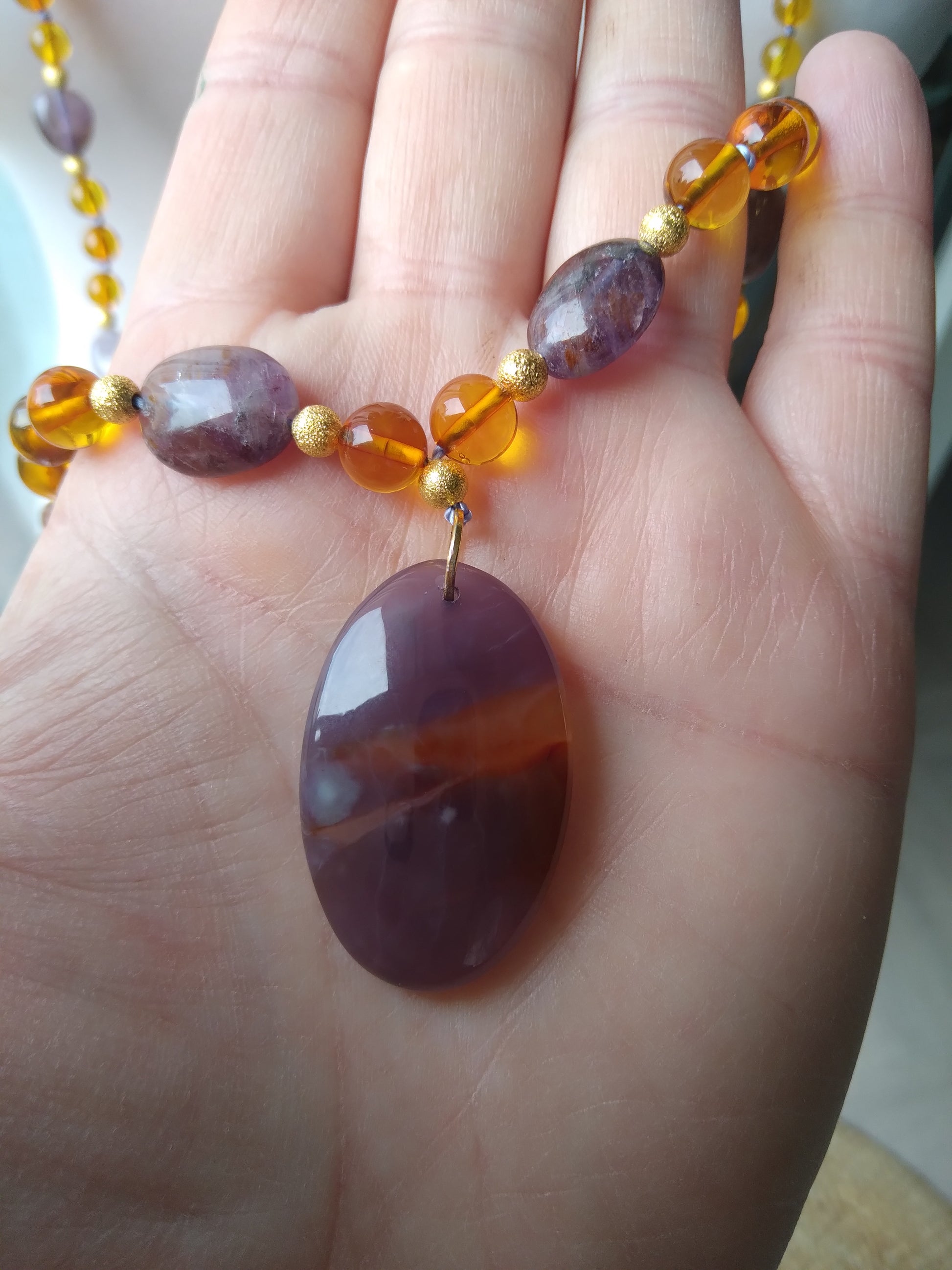 Je te présente l'alliance à la fois douce et chaleureuse de l'ambre et de l'améthyste. C'est un joli mala pour l'automne.