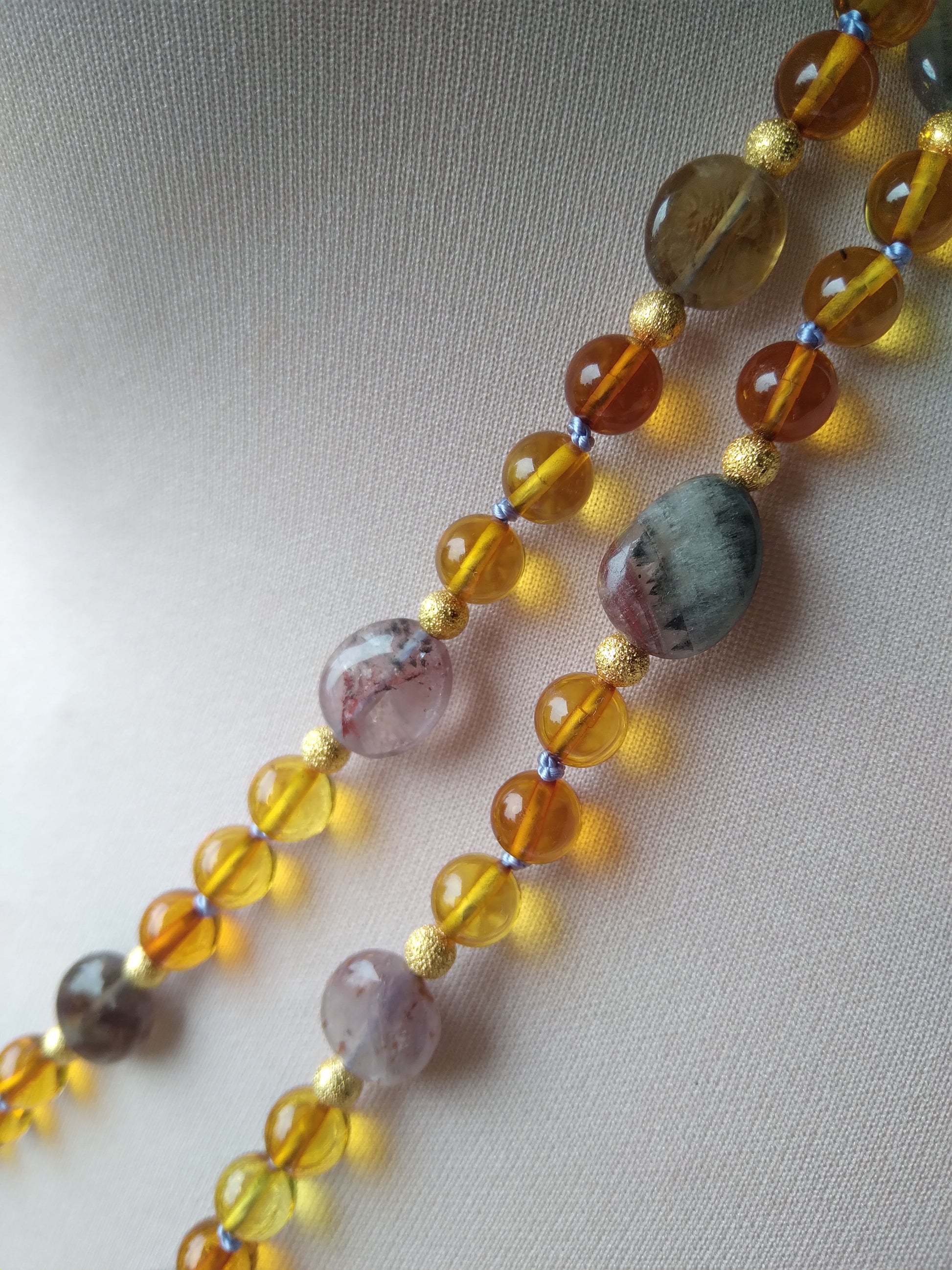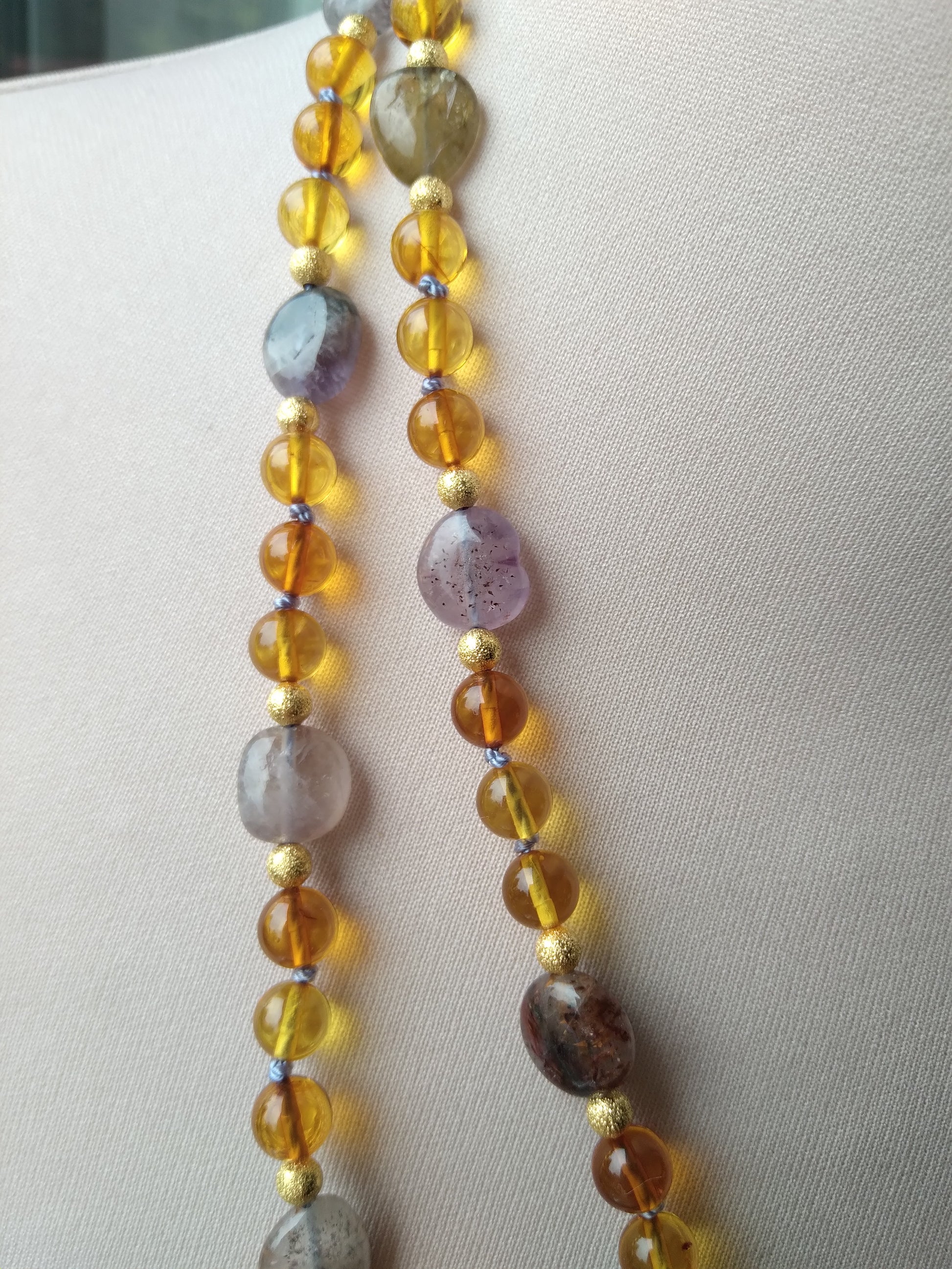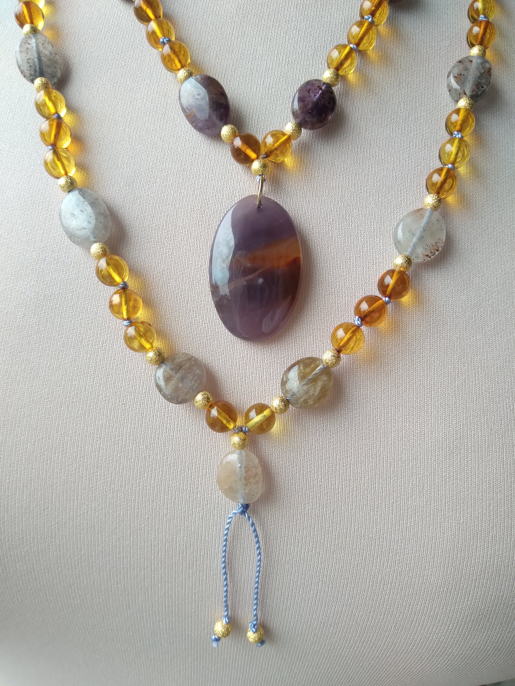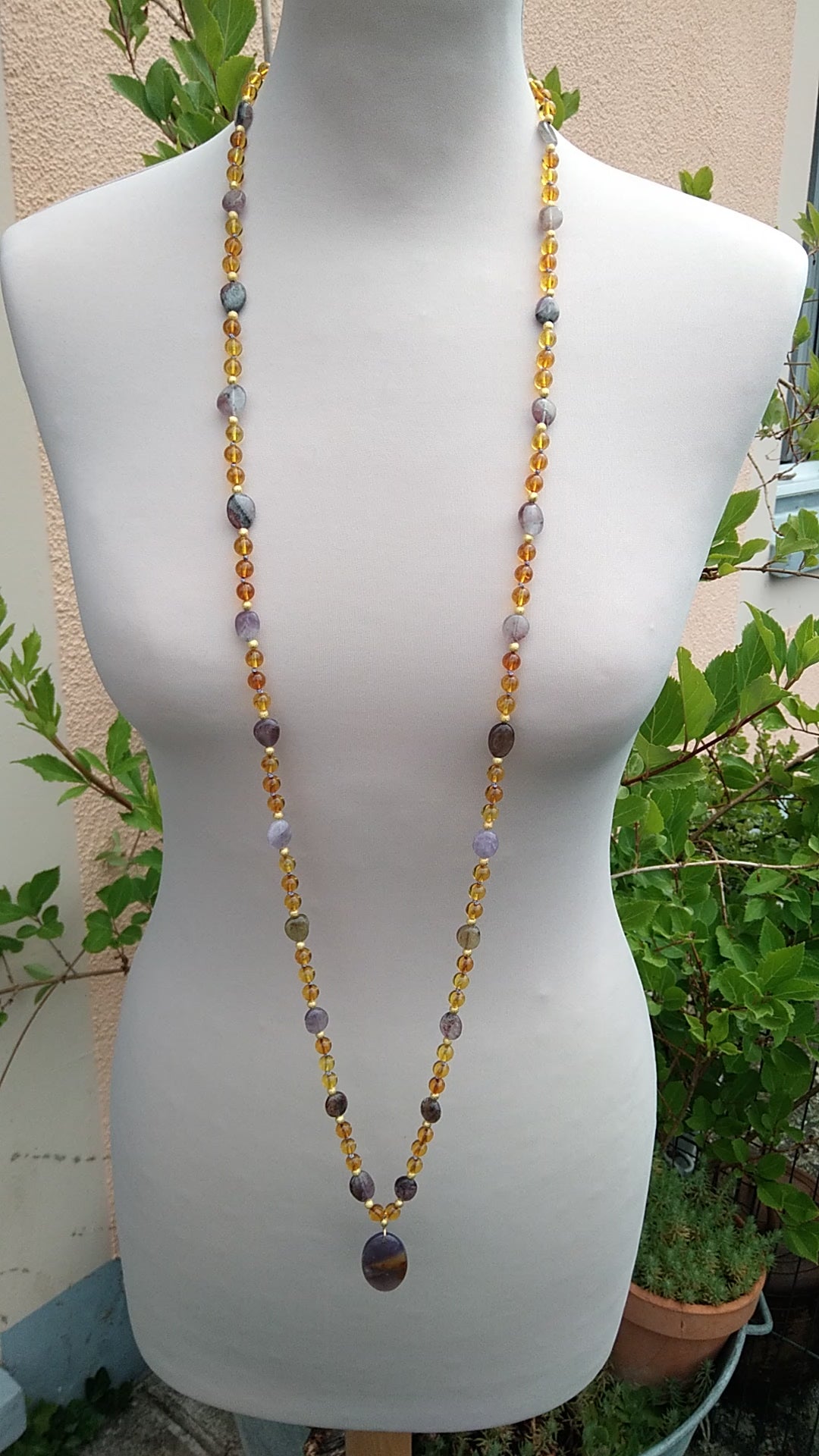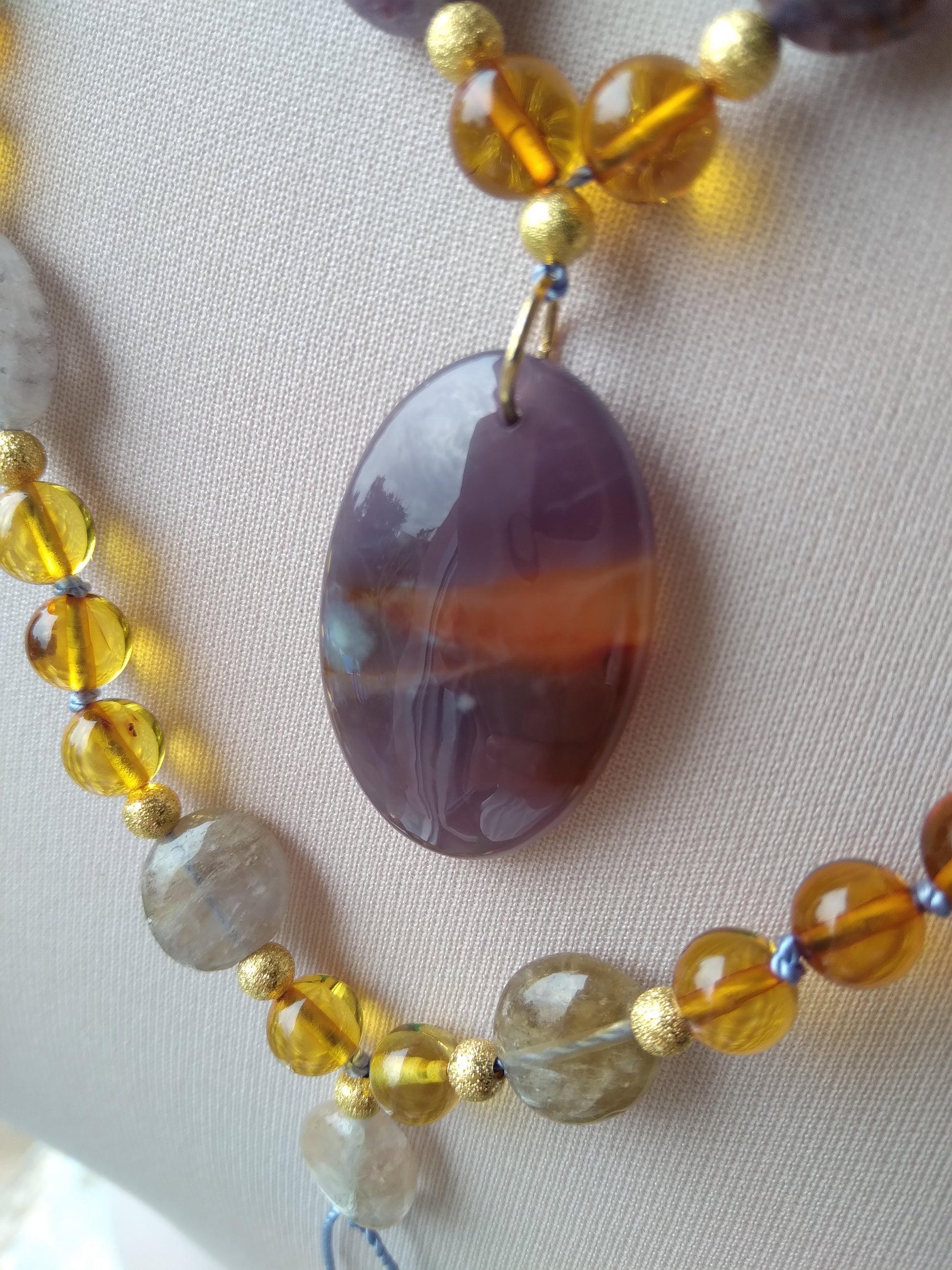 Je te présente l'alliance à la fois douce et chaleureuse de l'ambre et de l'améthyste. C'est un joli mala pour l'automne.