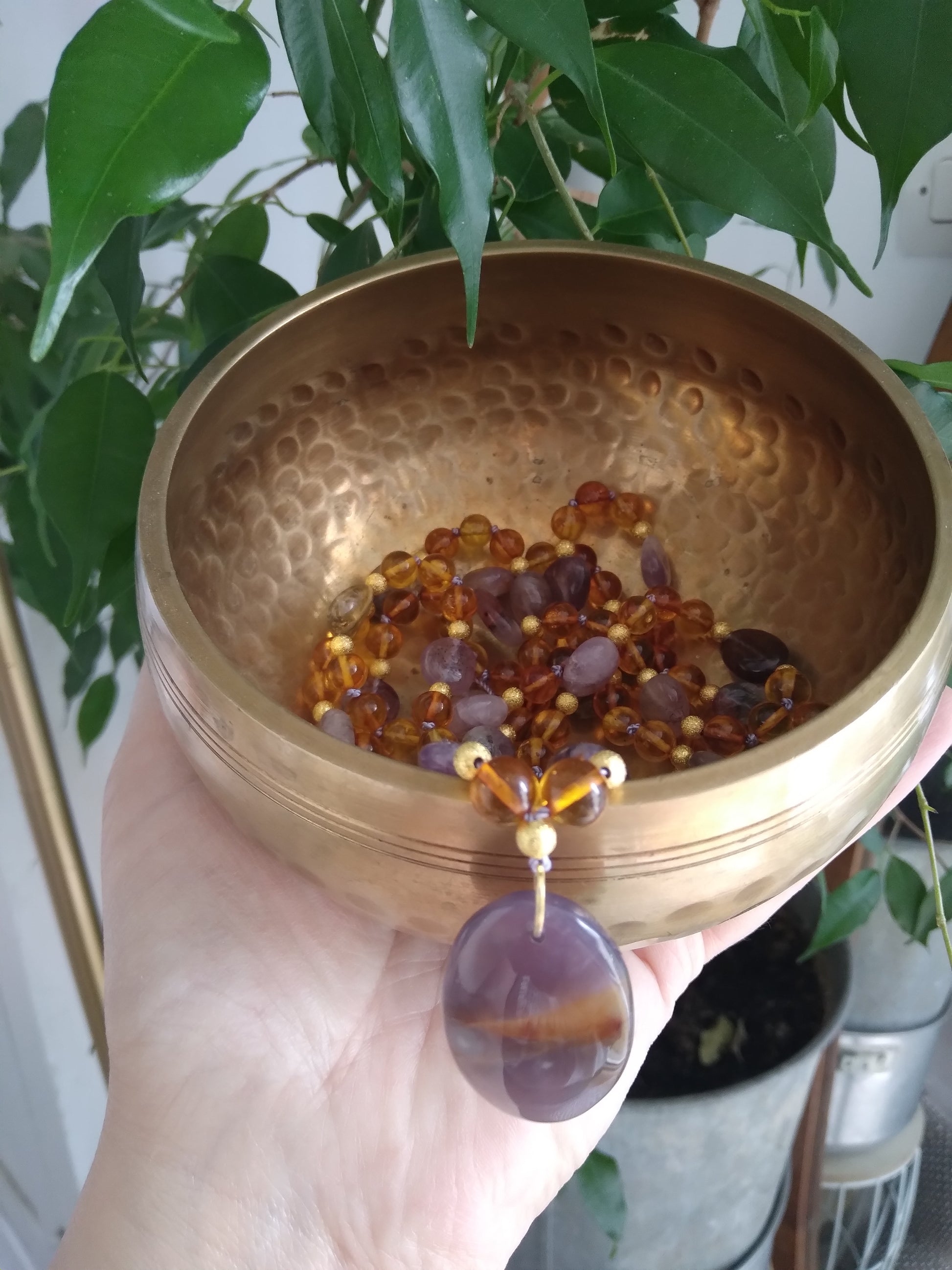 Mala en ambre et améthyste à inclusions "Bien-être"
