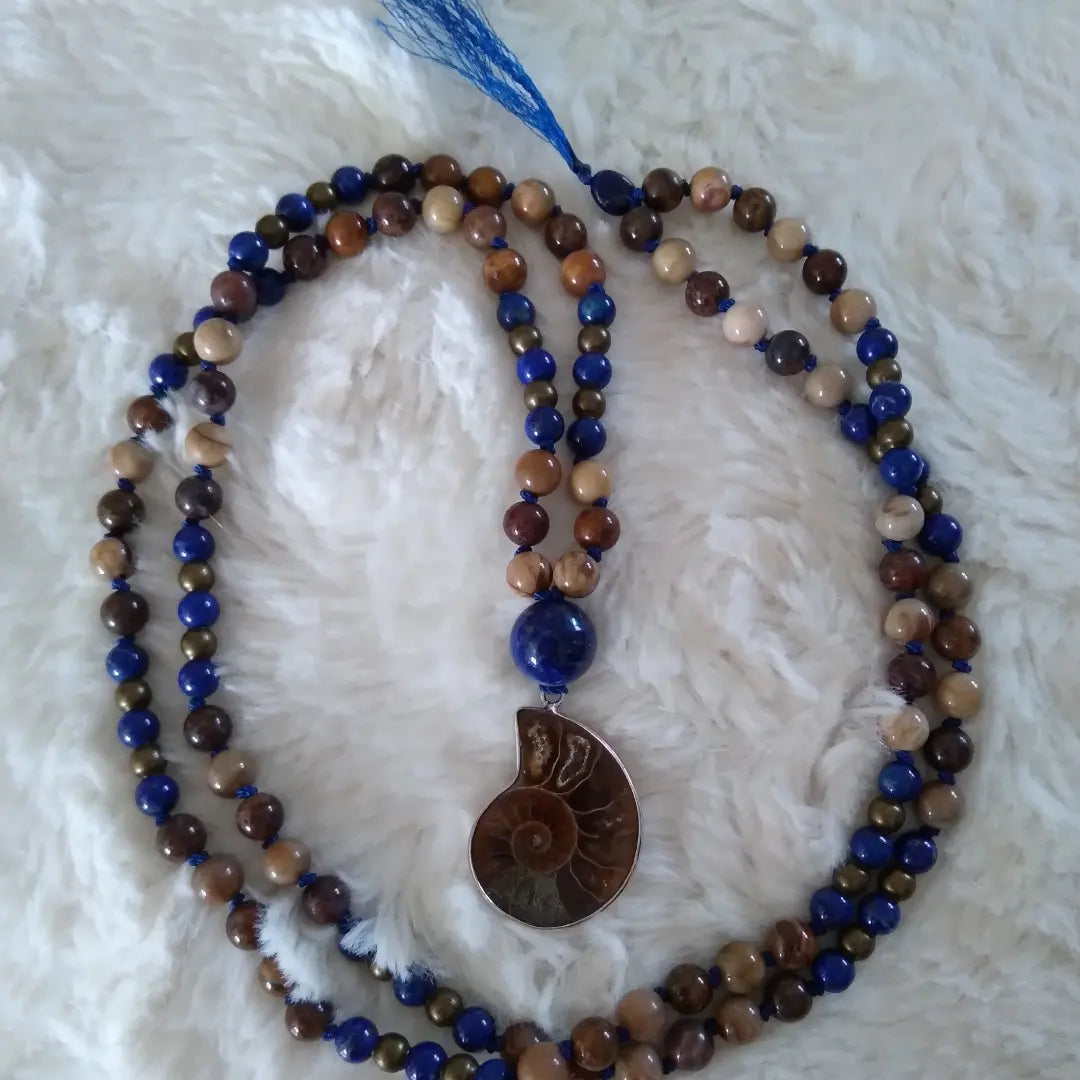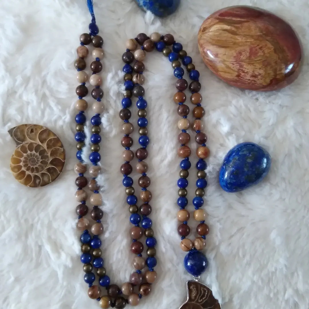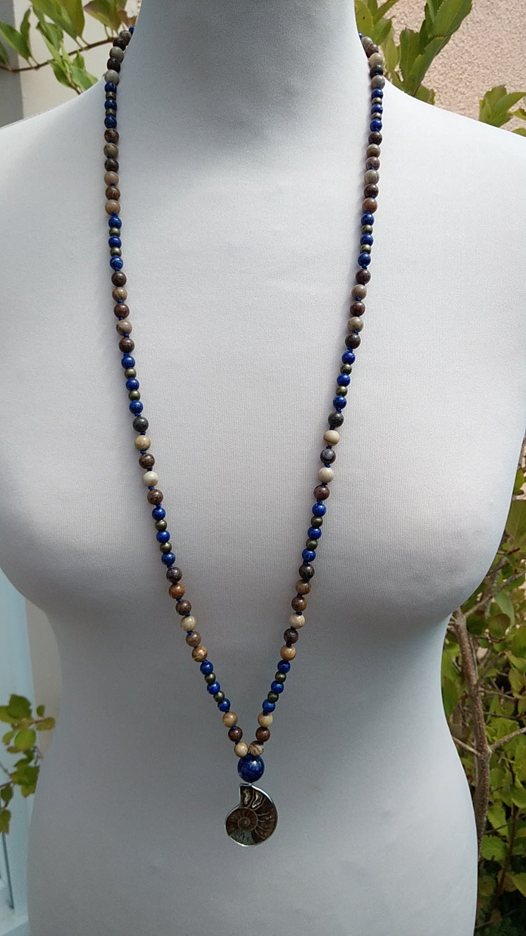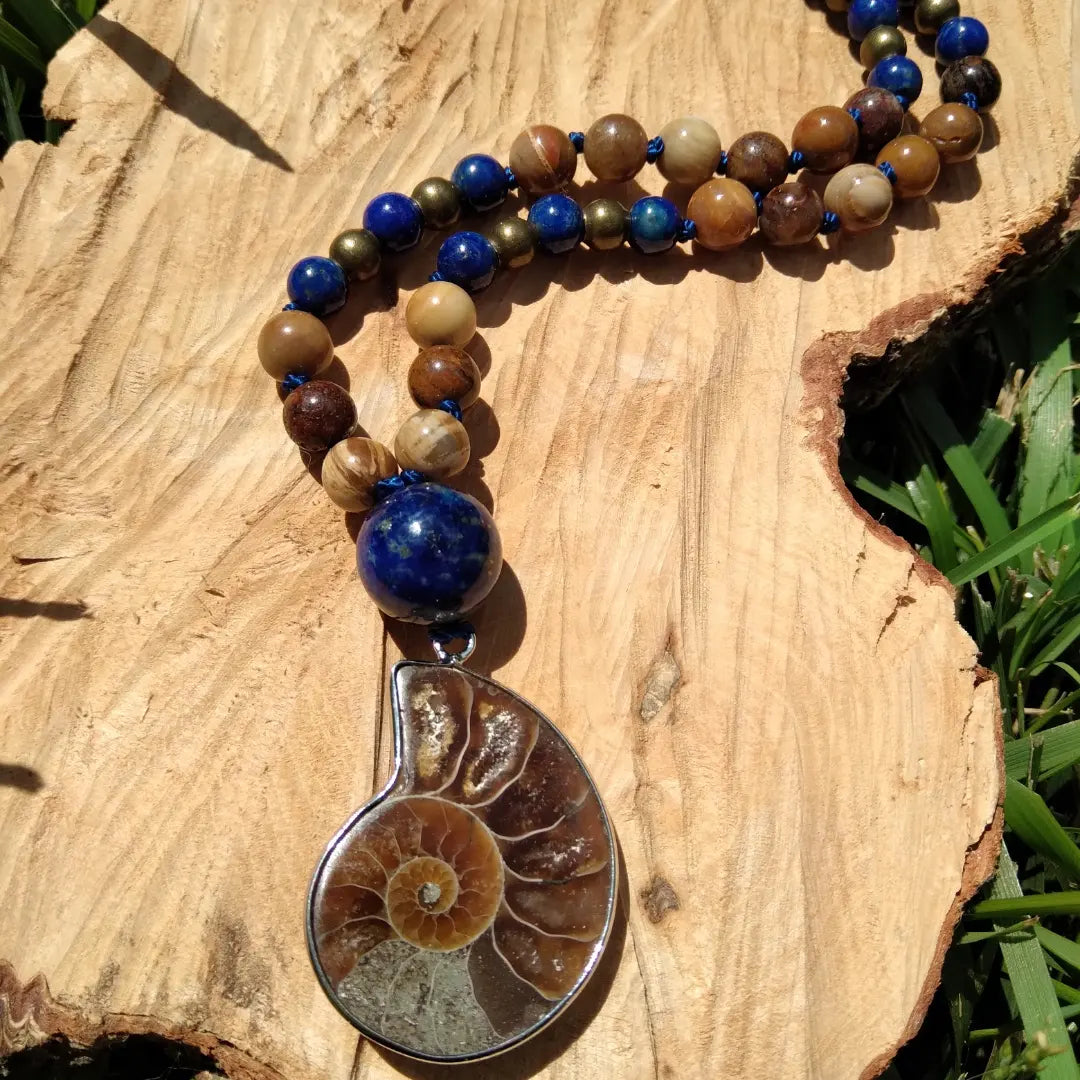 Mala en lapis-lazuli, piétersite, bois fossilisé et ammonite