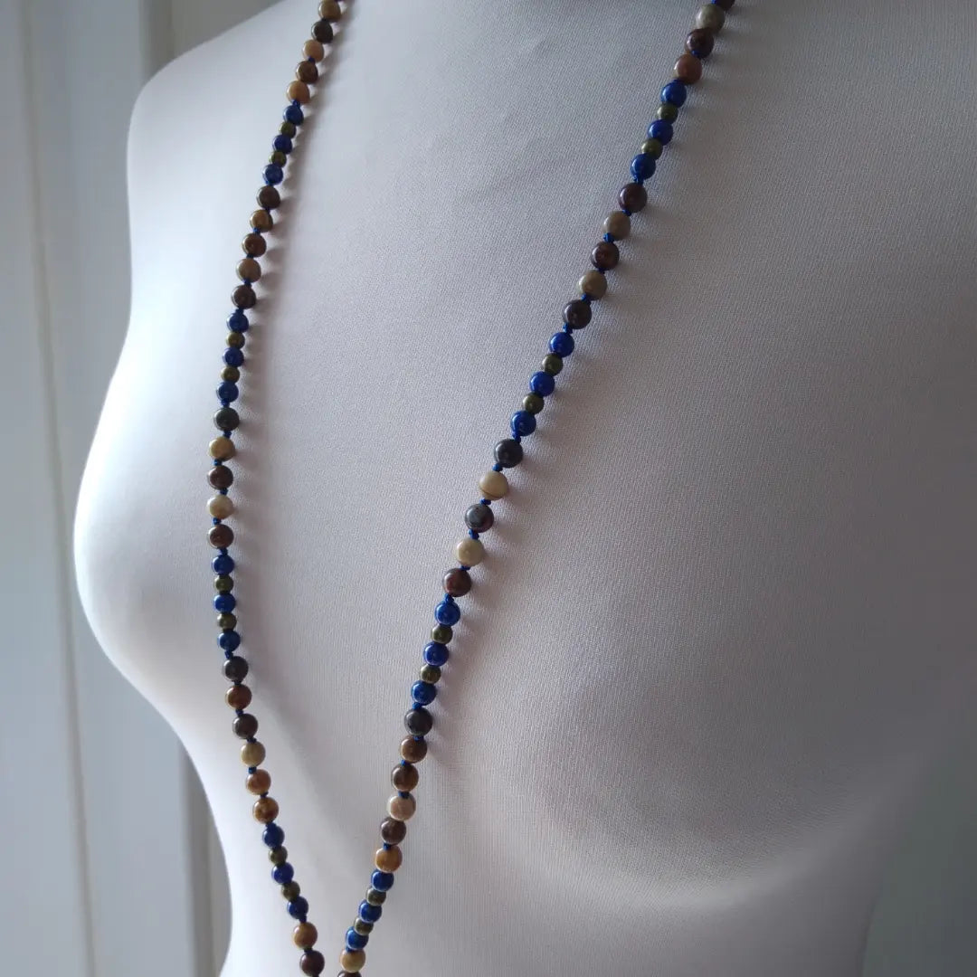 L'alliance du lapis-lazuli, de la piétersite, du bois fossilisé et de l'ammonite te permet de travailler ton ancrage, tes racines, ton calme, ta force et ta sécurité 🤎💙🤎
