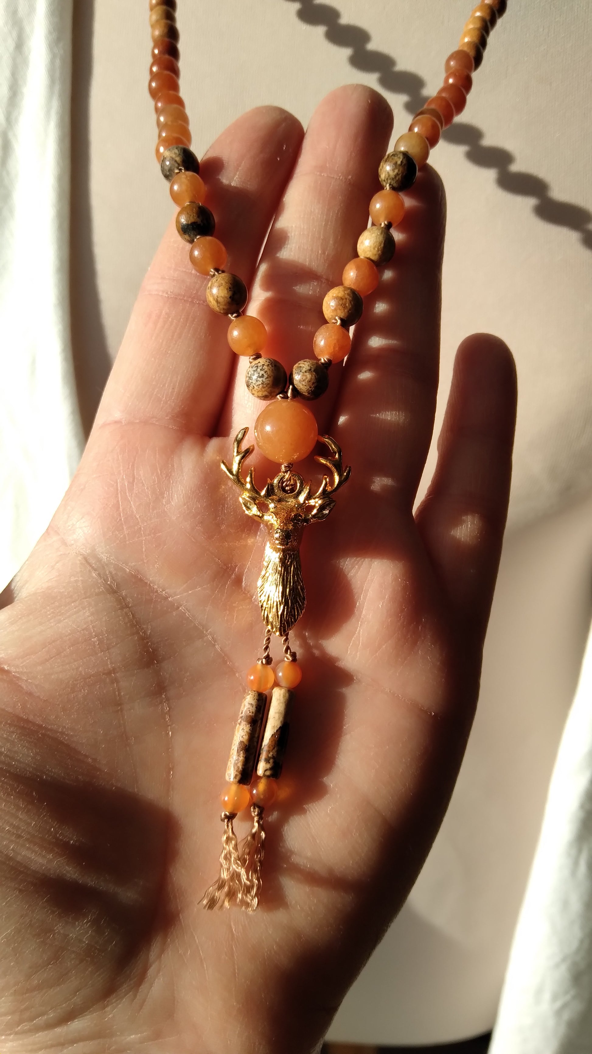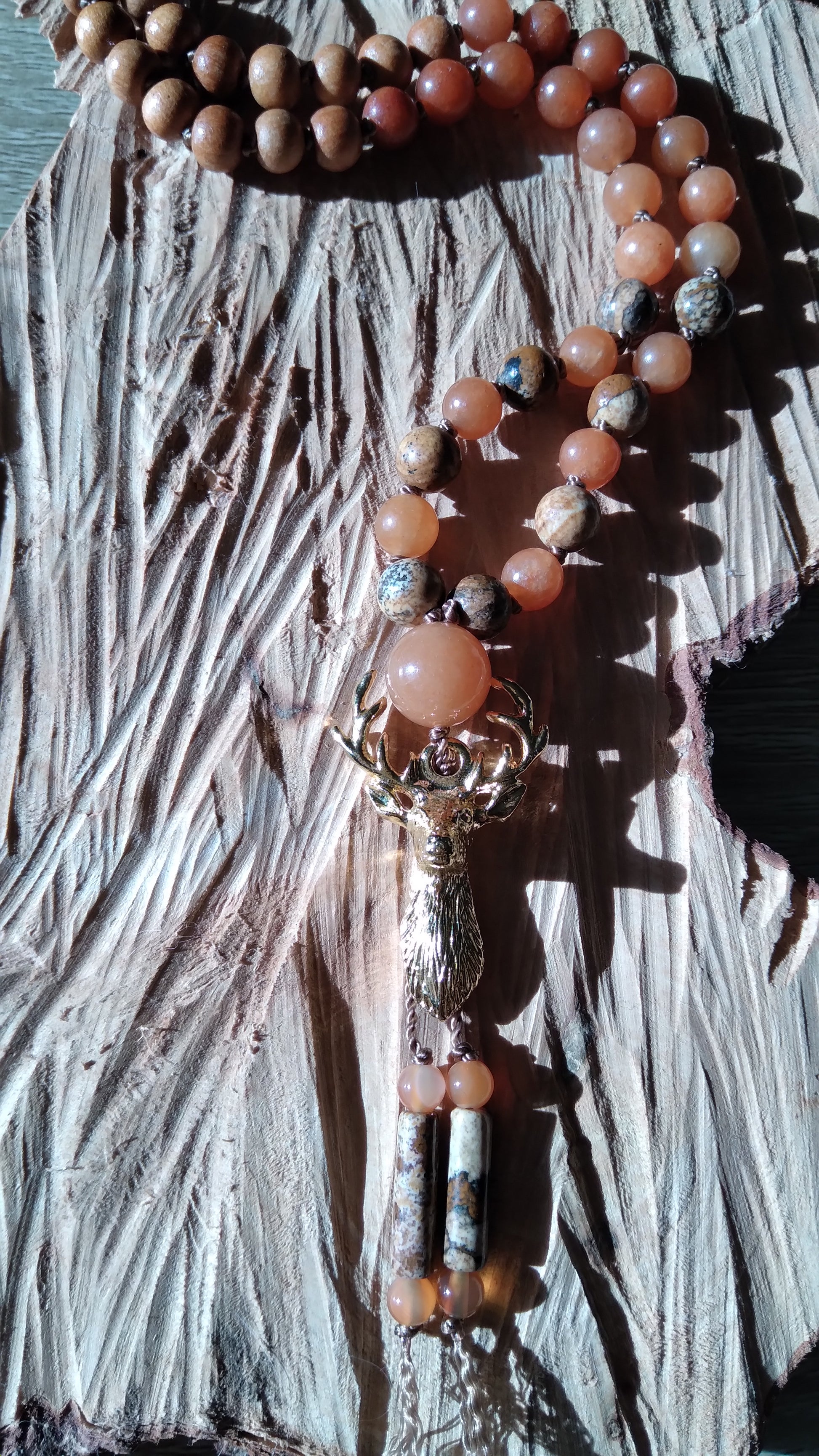 Mala cerf en aventurine orange, jaspe paysage et bois