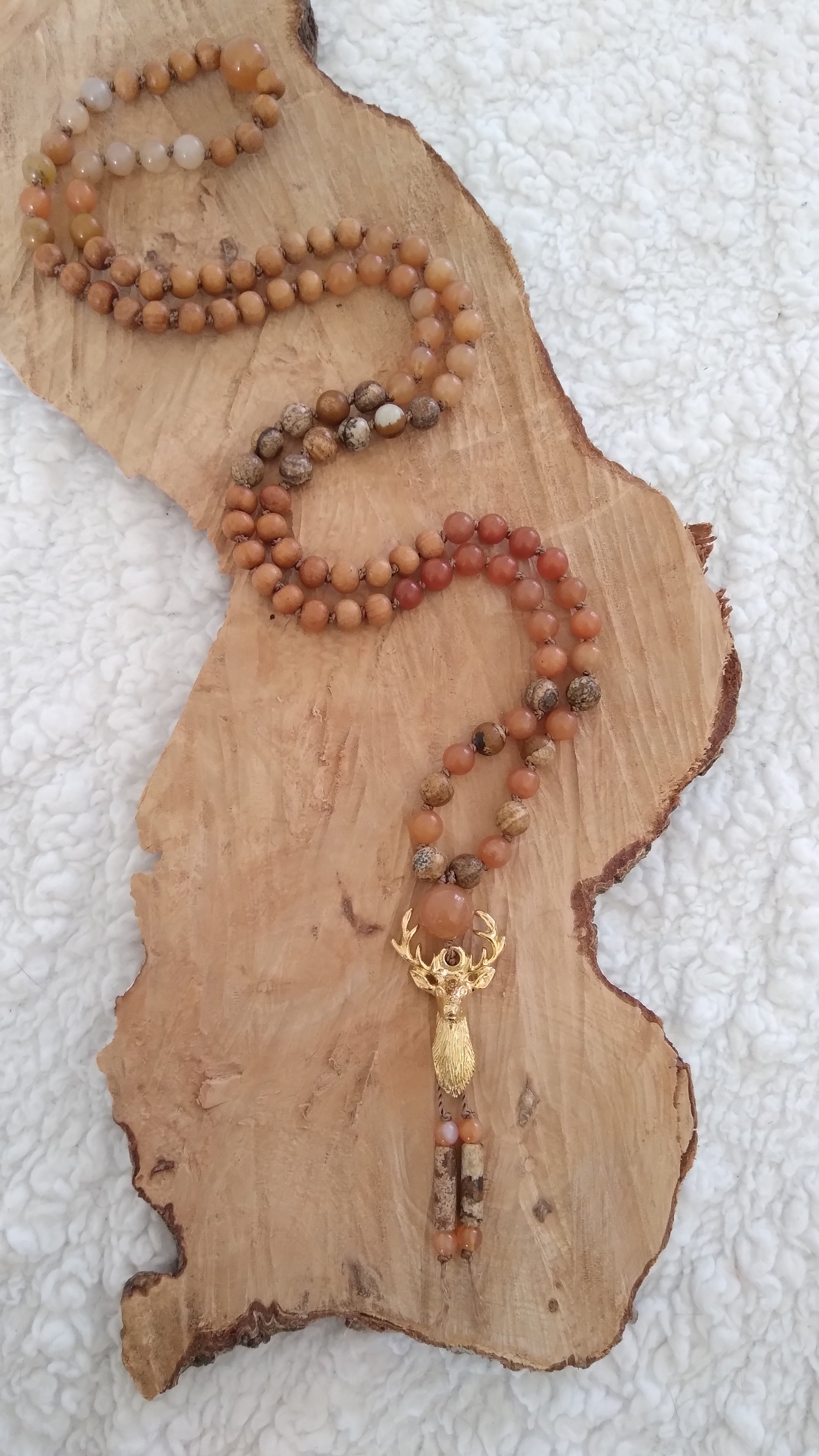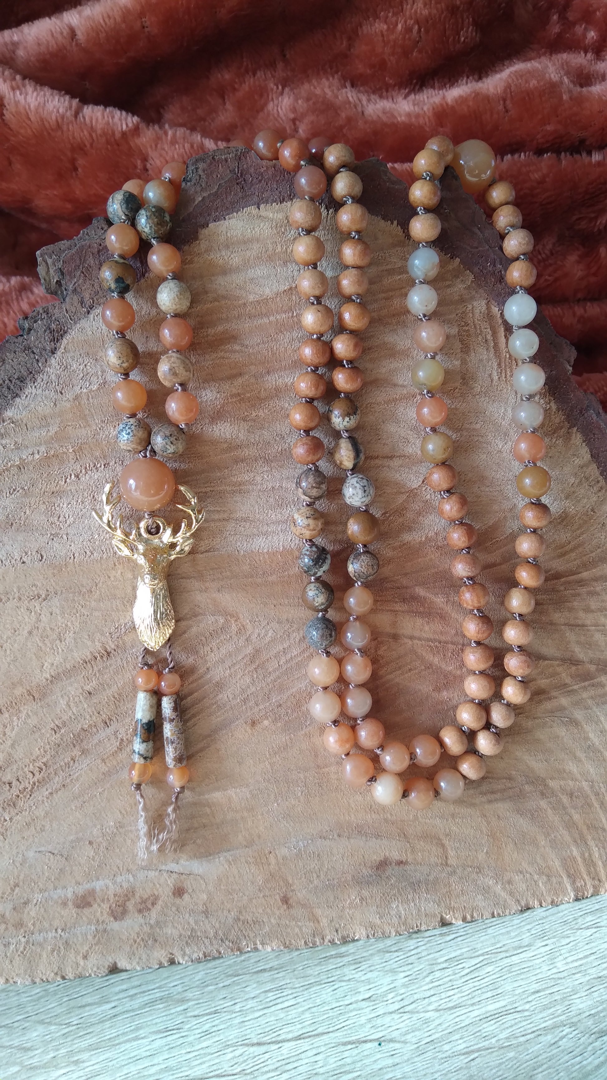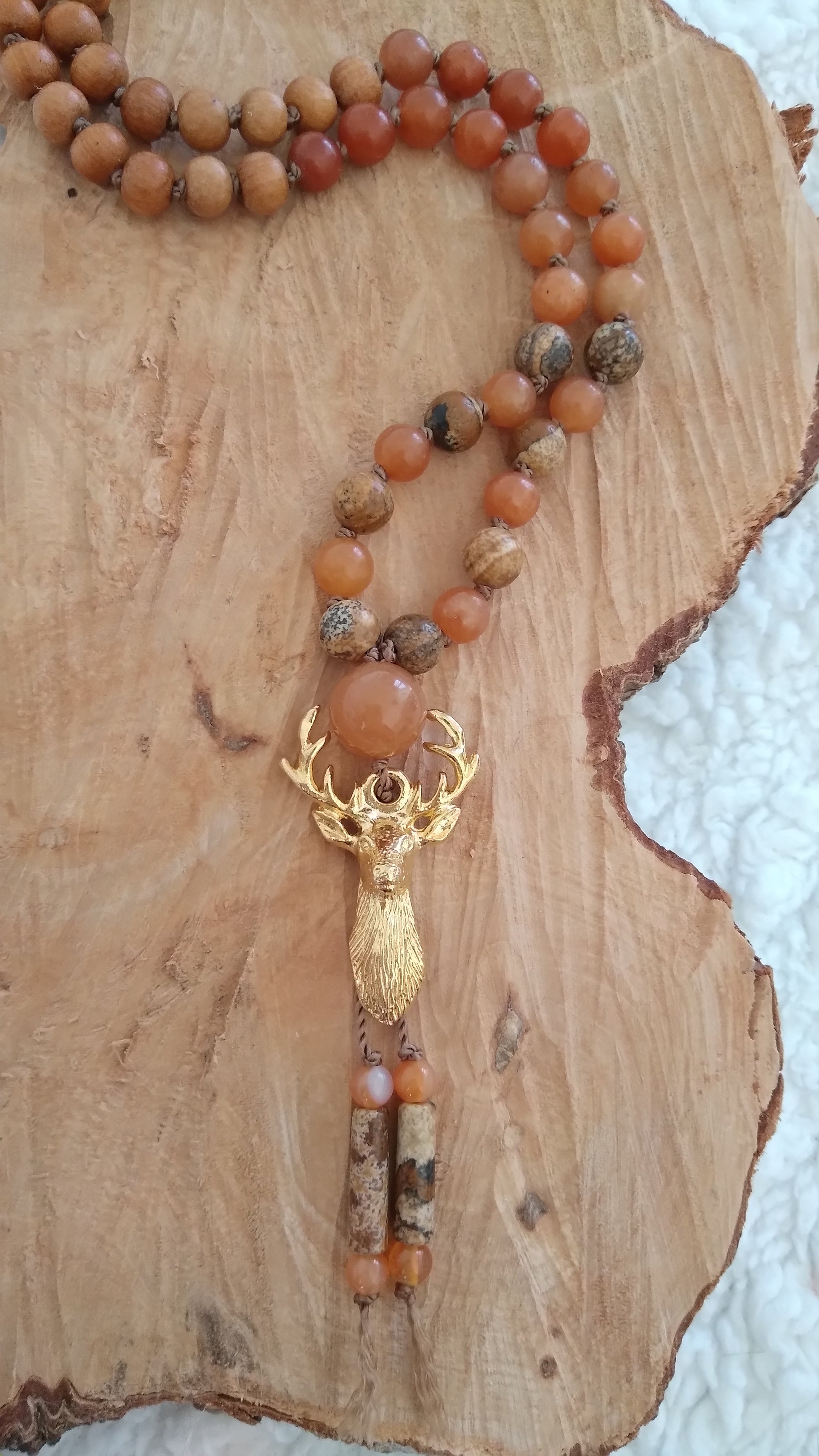 Je te présente le mala animal totem cerf. Il est composé de perles en pierres naturelles en aventurine orange, jaspe paysage et cornaline. Il comporte également des perles en bois.