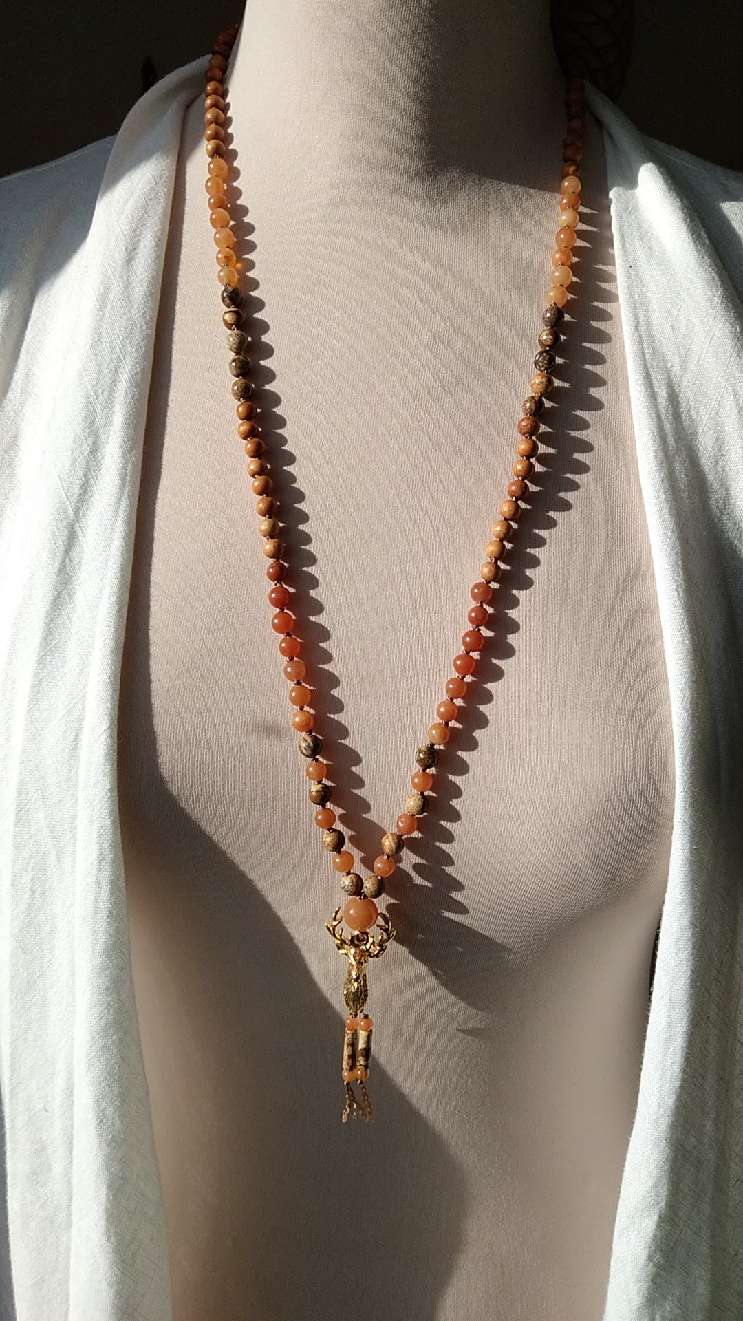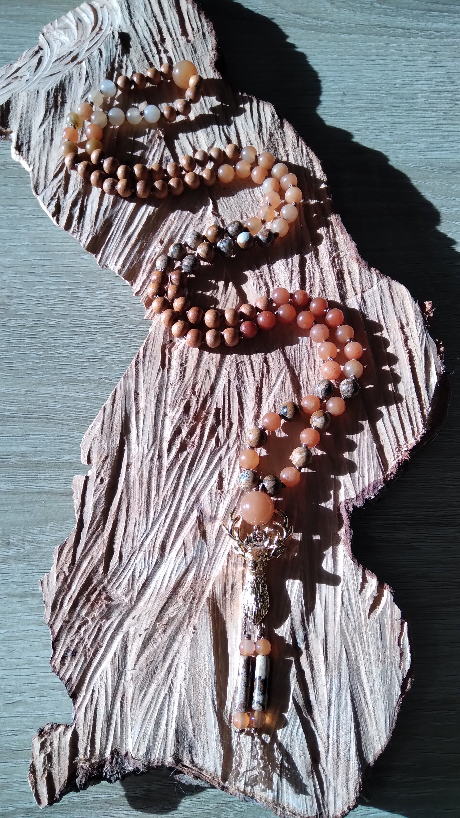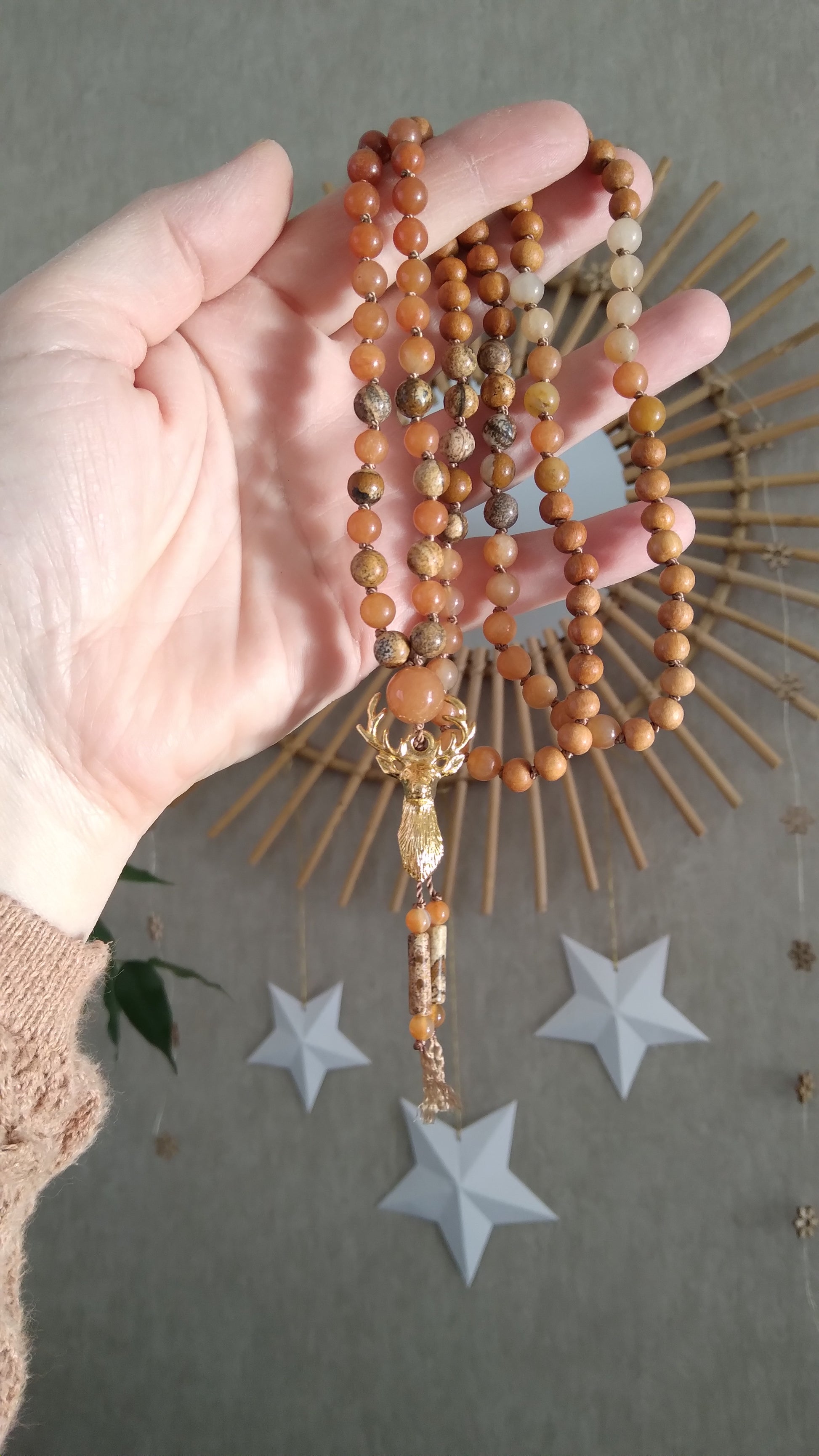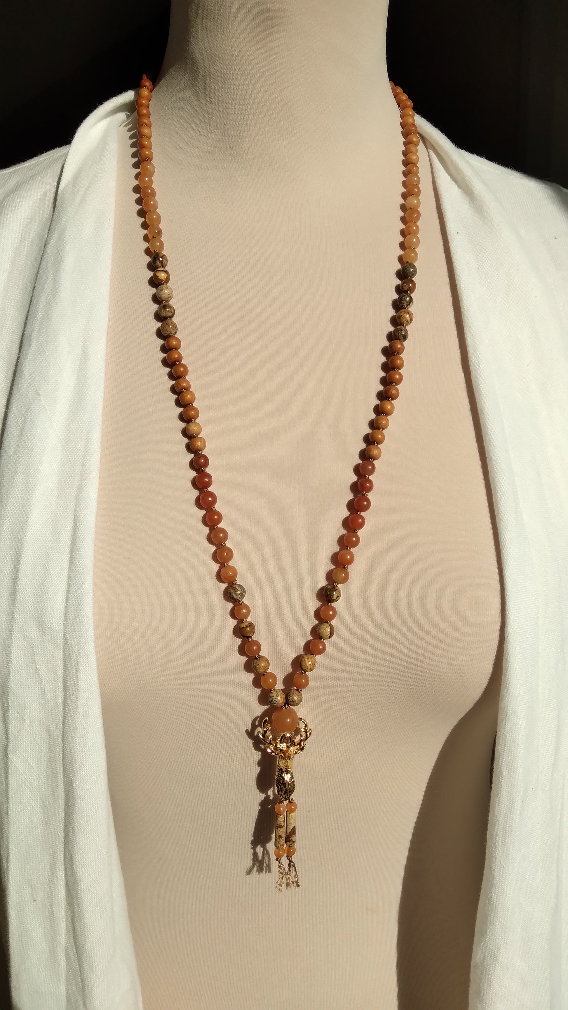 Je te présente le mala animal totem cerf. Il est composé de perles en pierres naturelles en aventurine orange, jaspe paysage et cornaline. Il comporte également des perles en bois.
