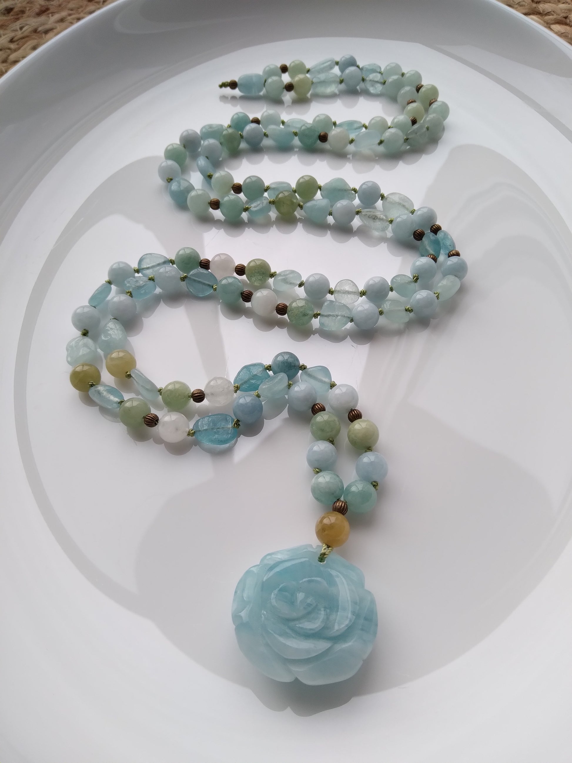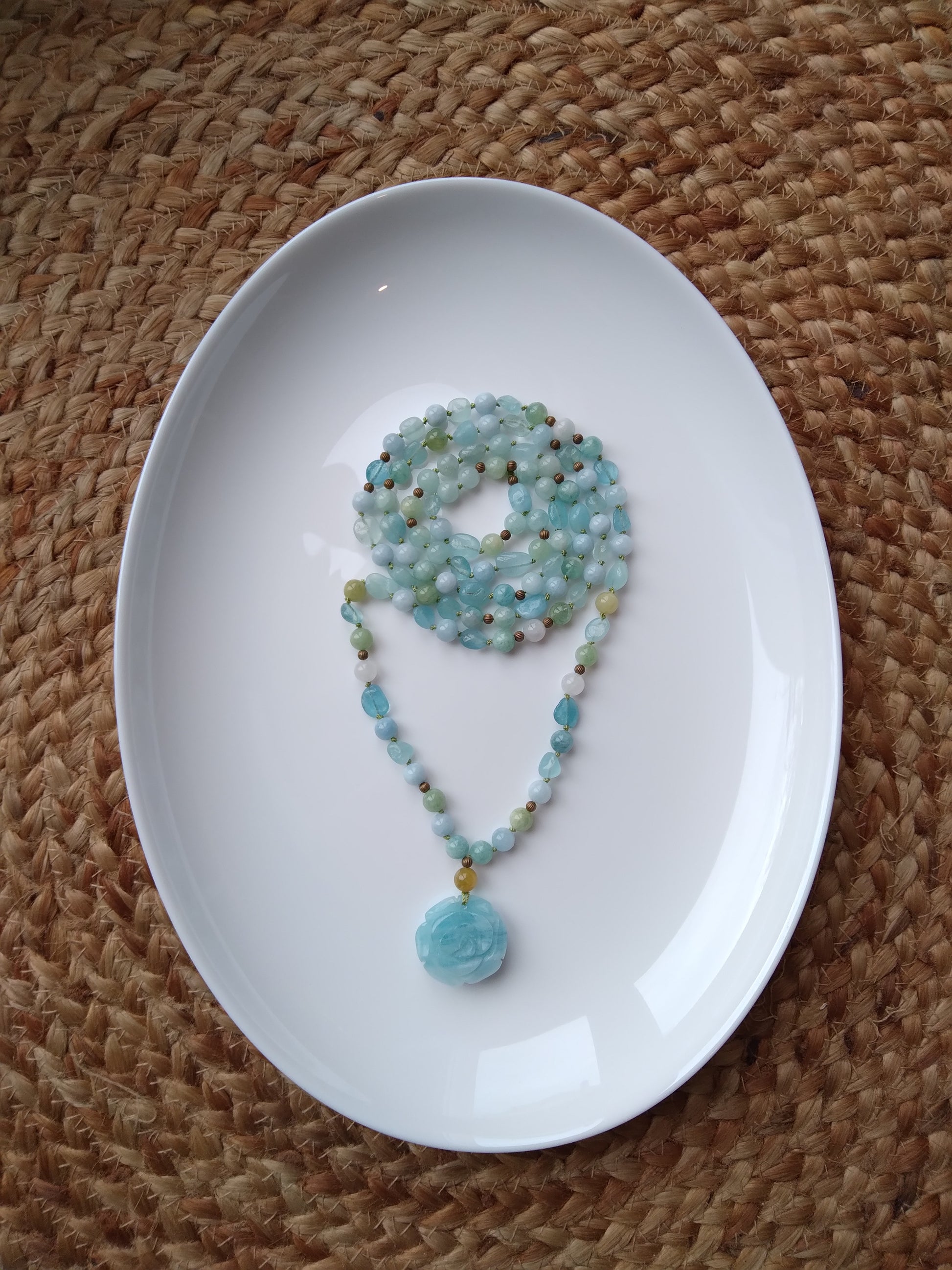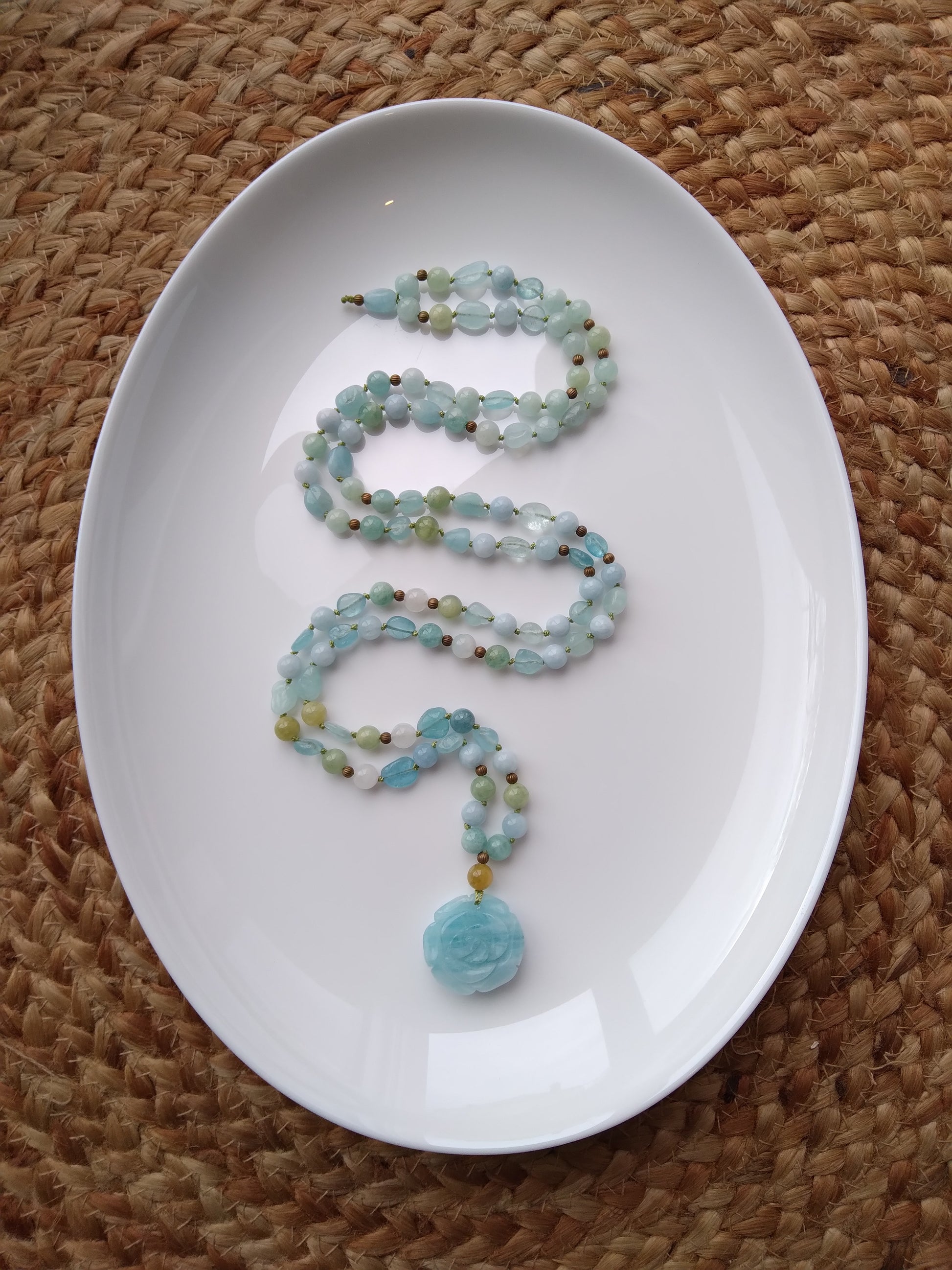 Traditional "Depths" mala composed of 108 natural aquamarine stone beads