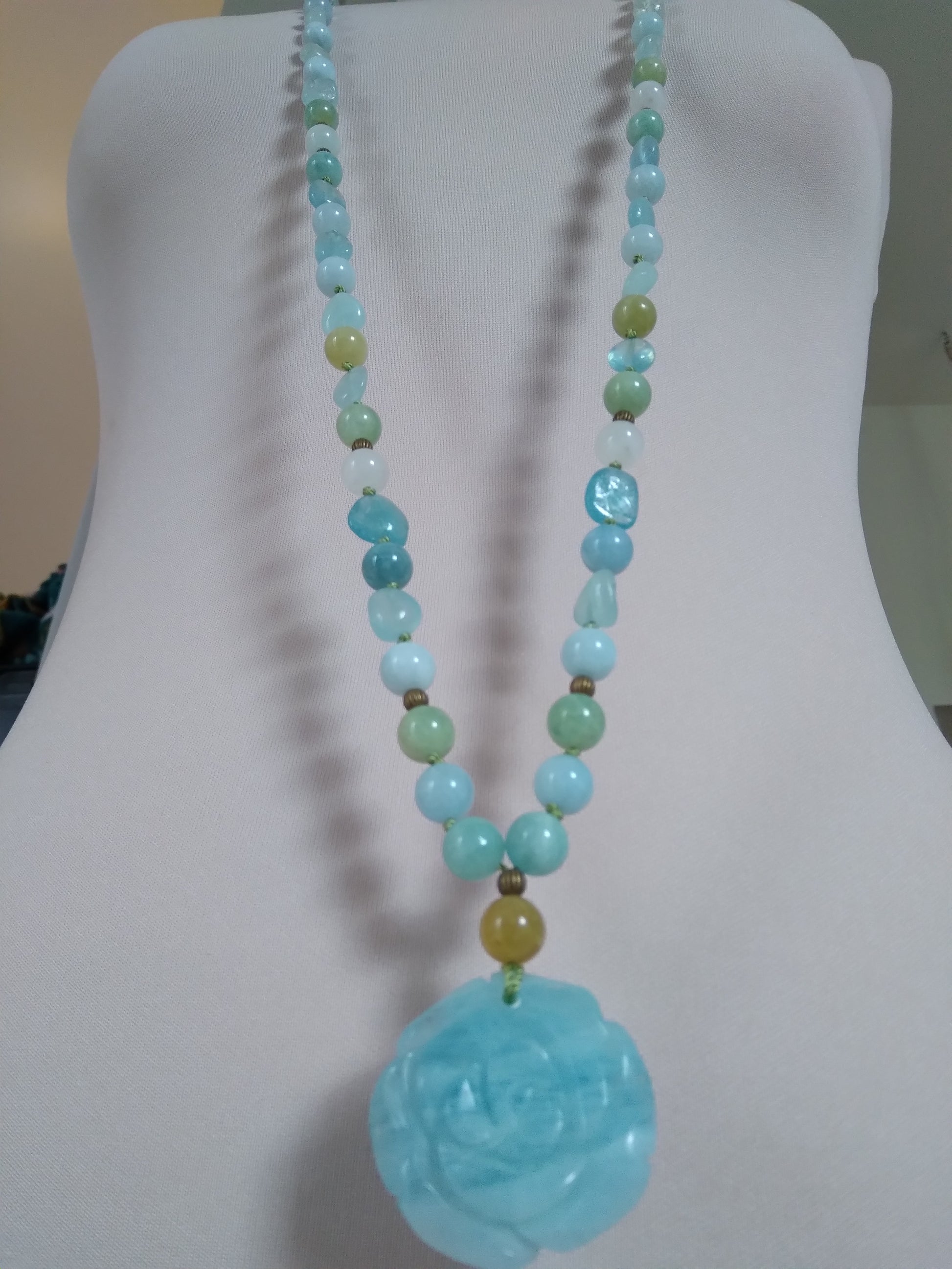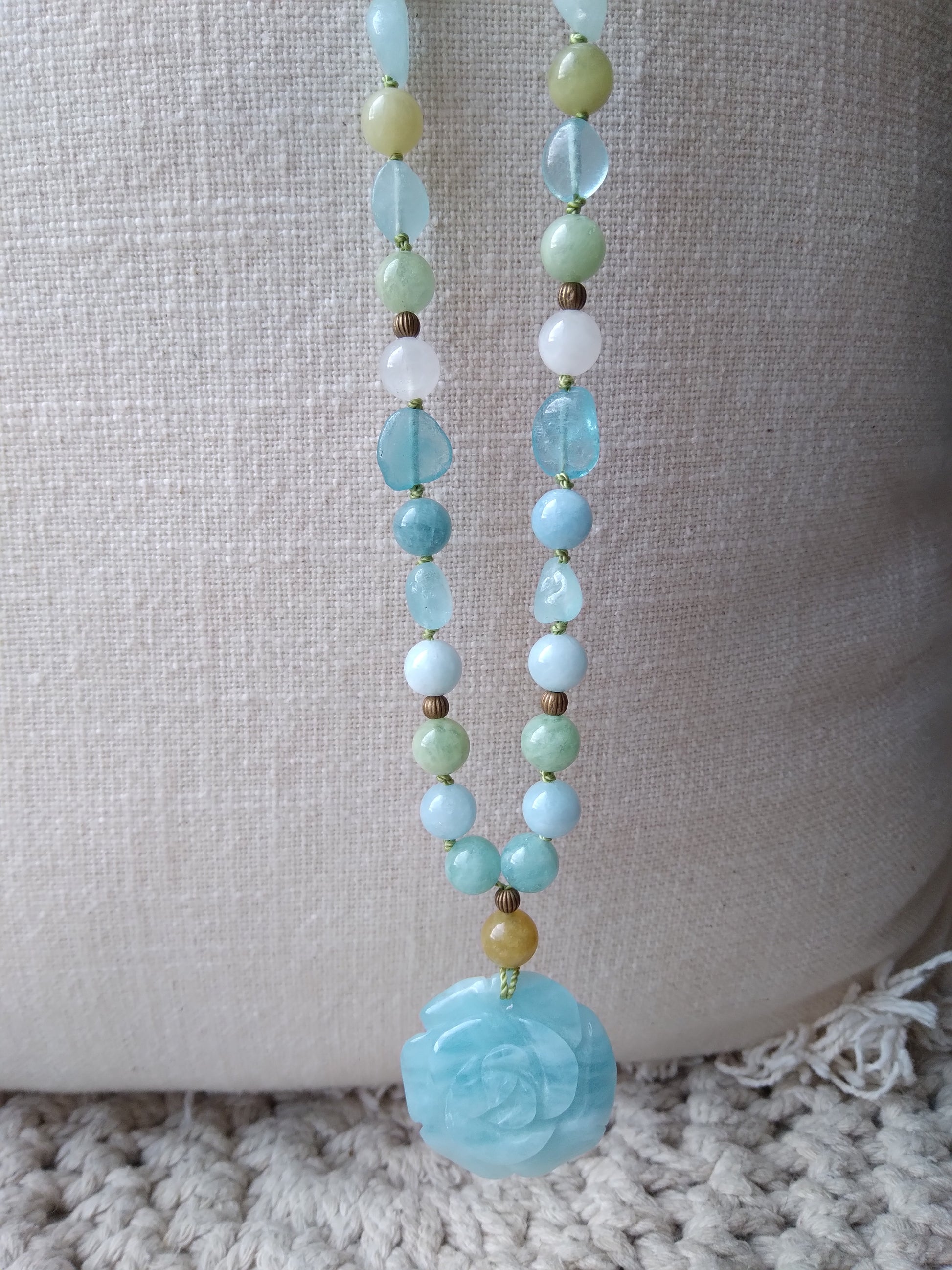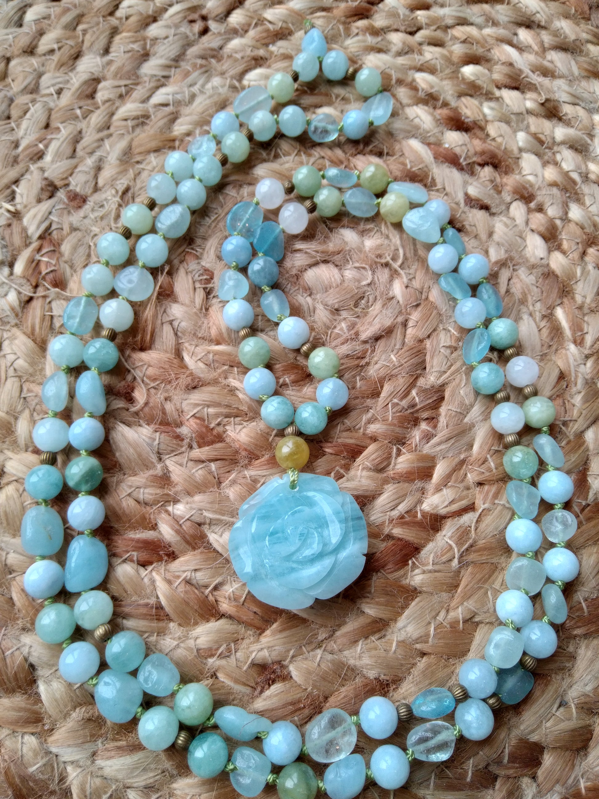 Les perles sont associées à un pendentif en aigue-marine en forme de rose, ce qui donne à cette pièce unique une personnalité à la fois délicate et atypique.