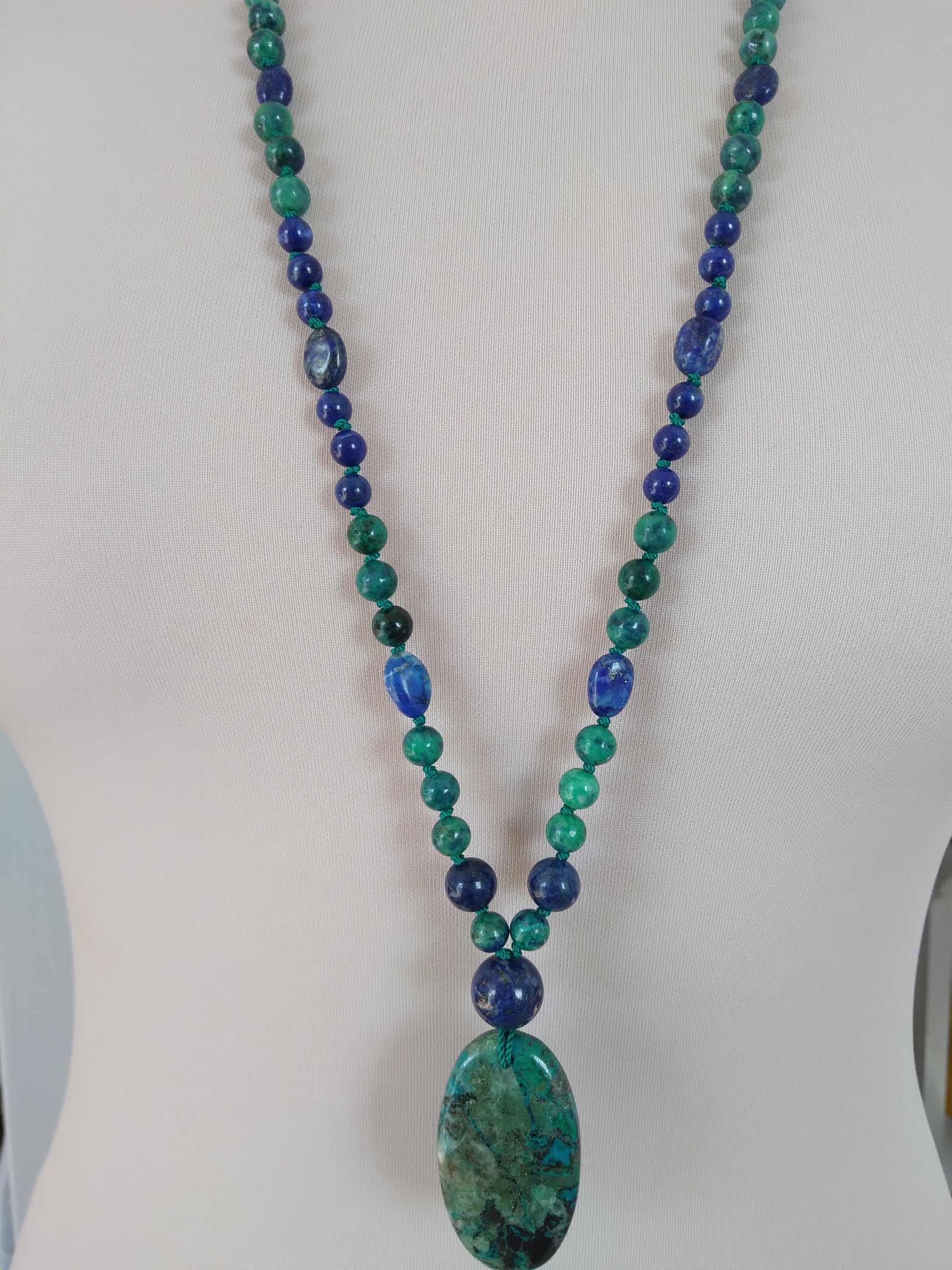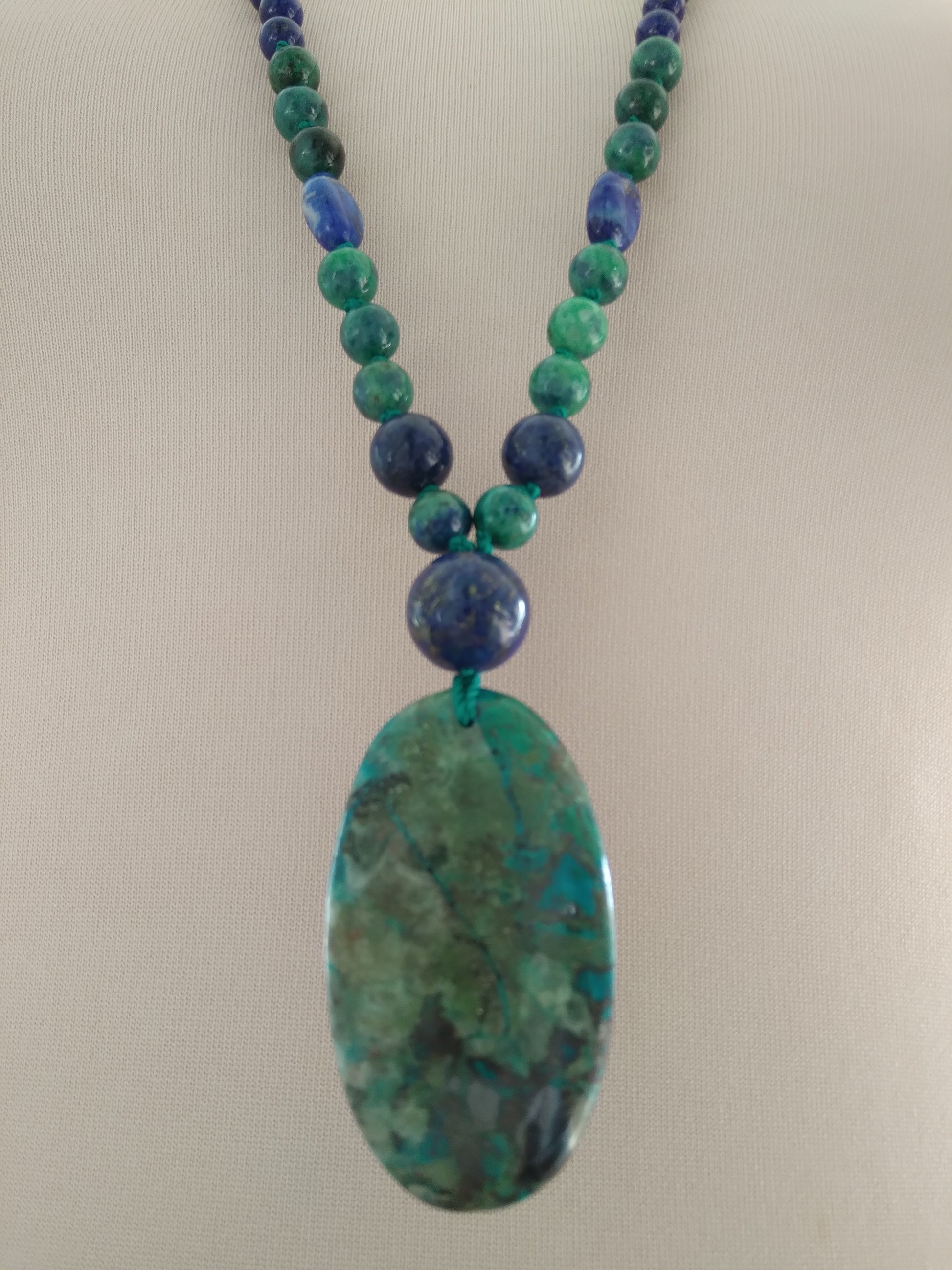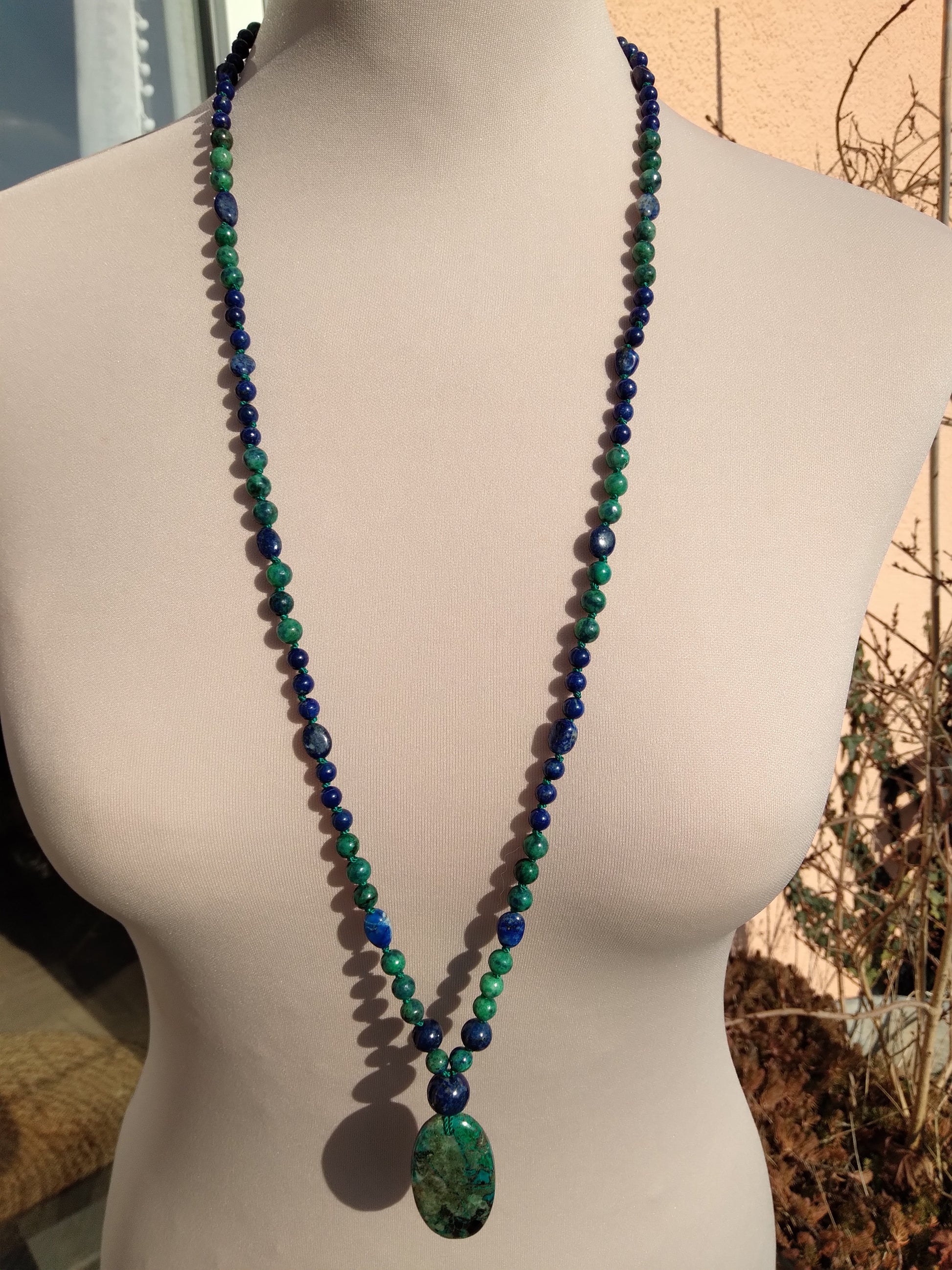 Mala en azurite malachite et en lapis-lazuli, pendentif en chrysocolle malachite