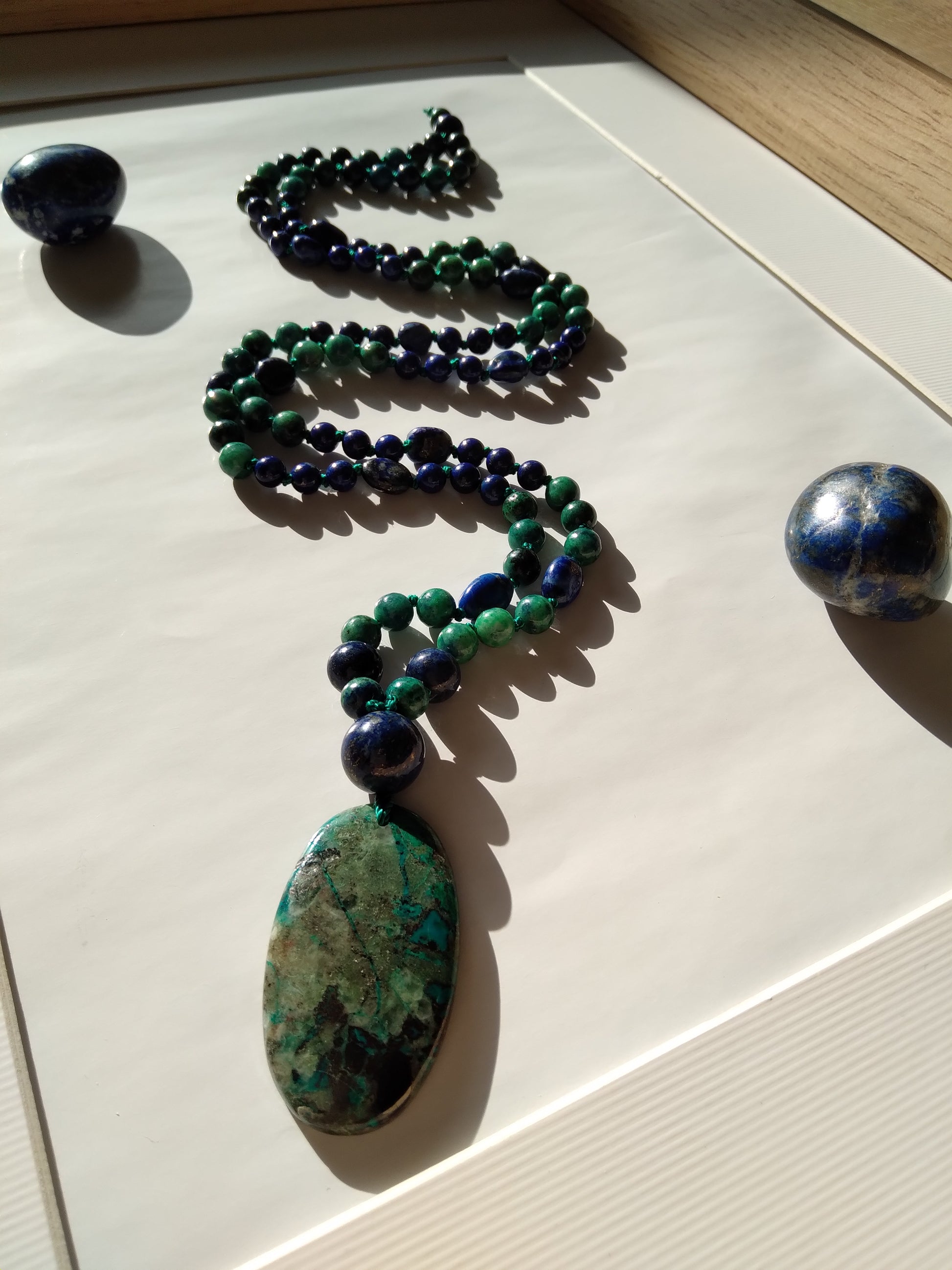 Mala en azurite malachite et en lapis-lazuli, pendentif en chrysocolle malachite "Connexion"