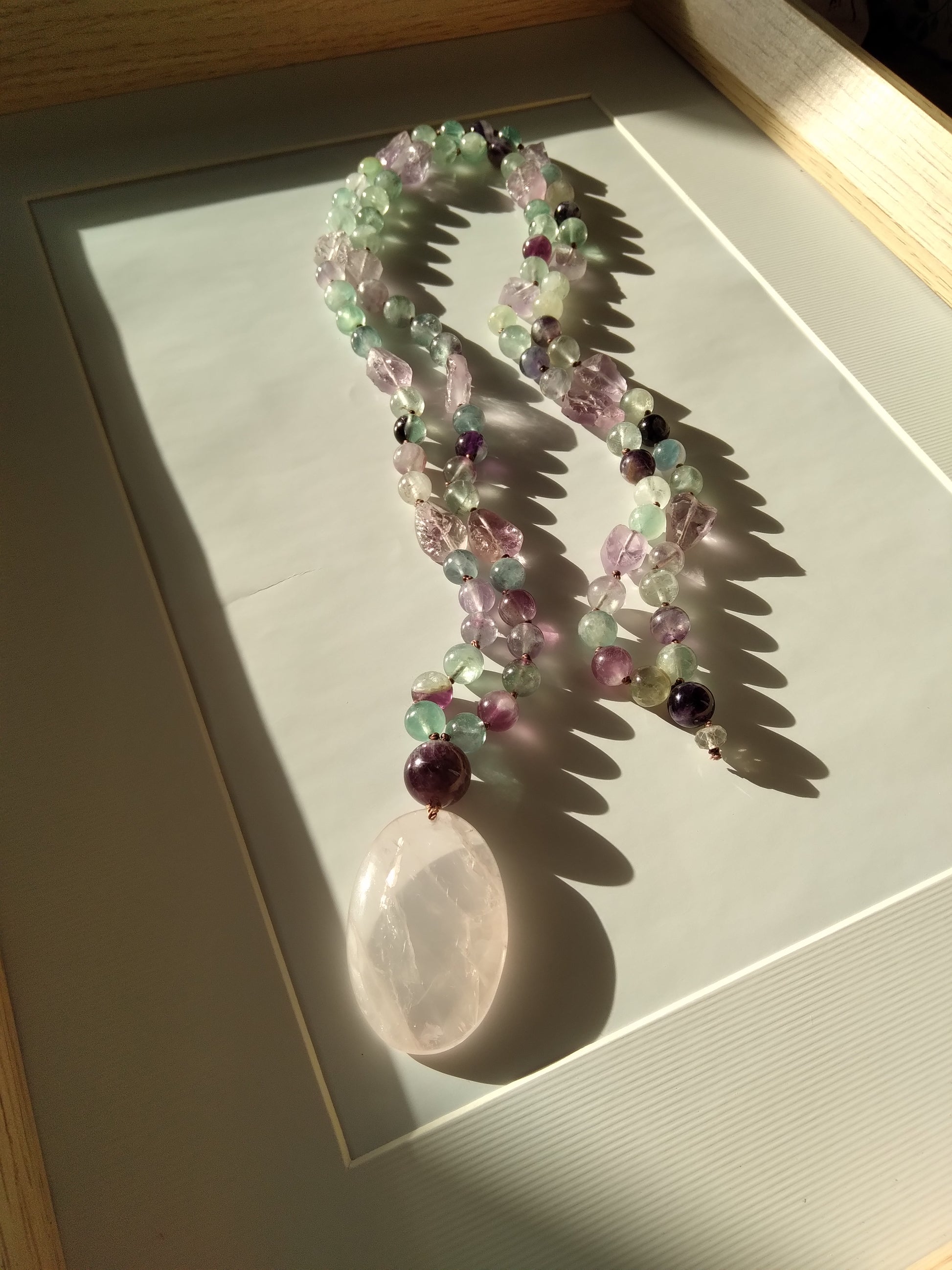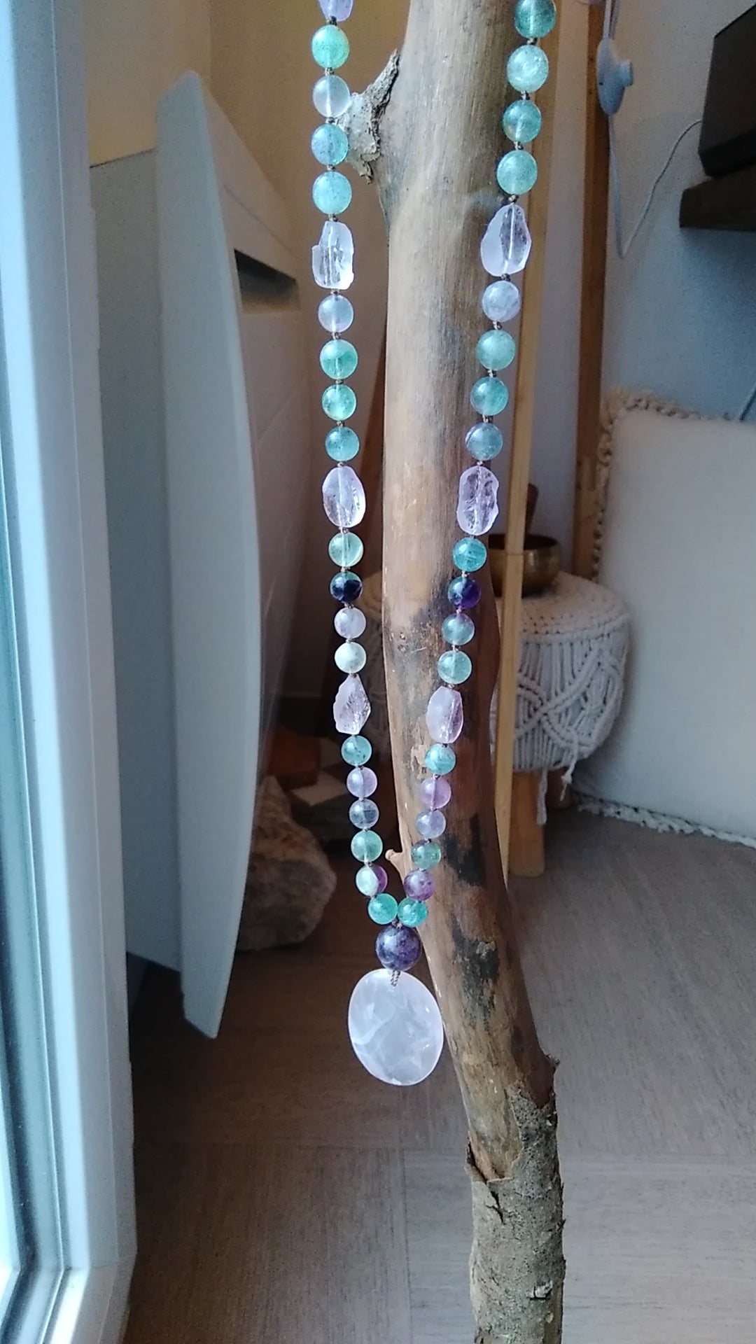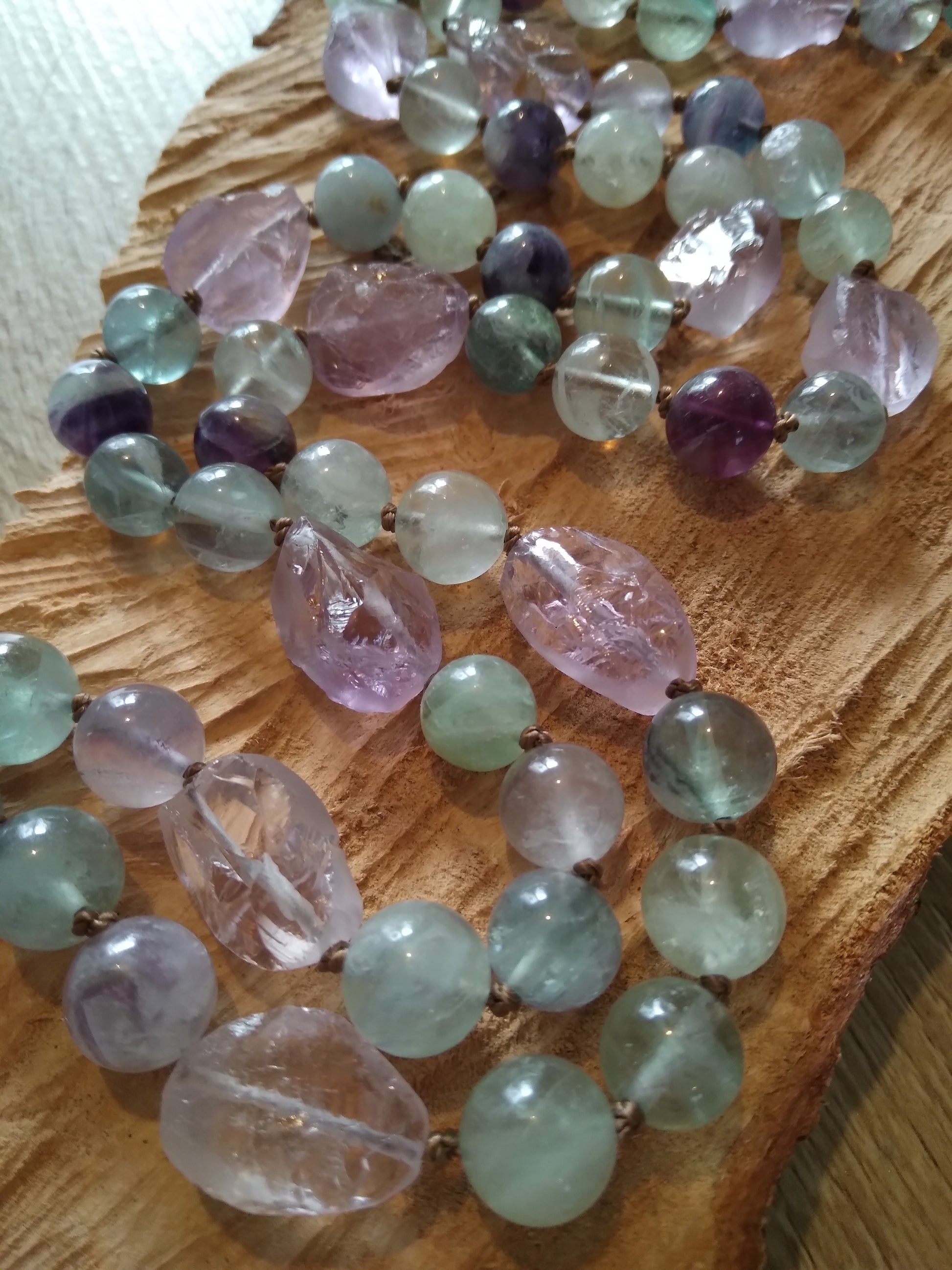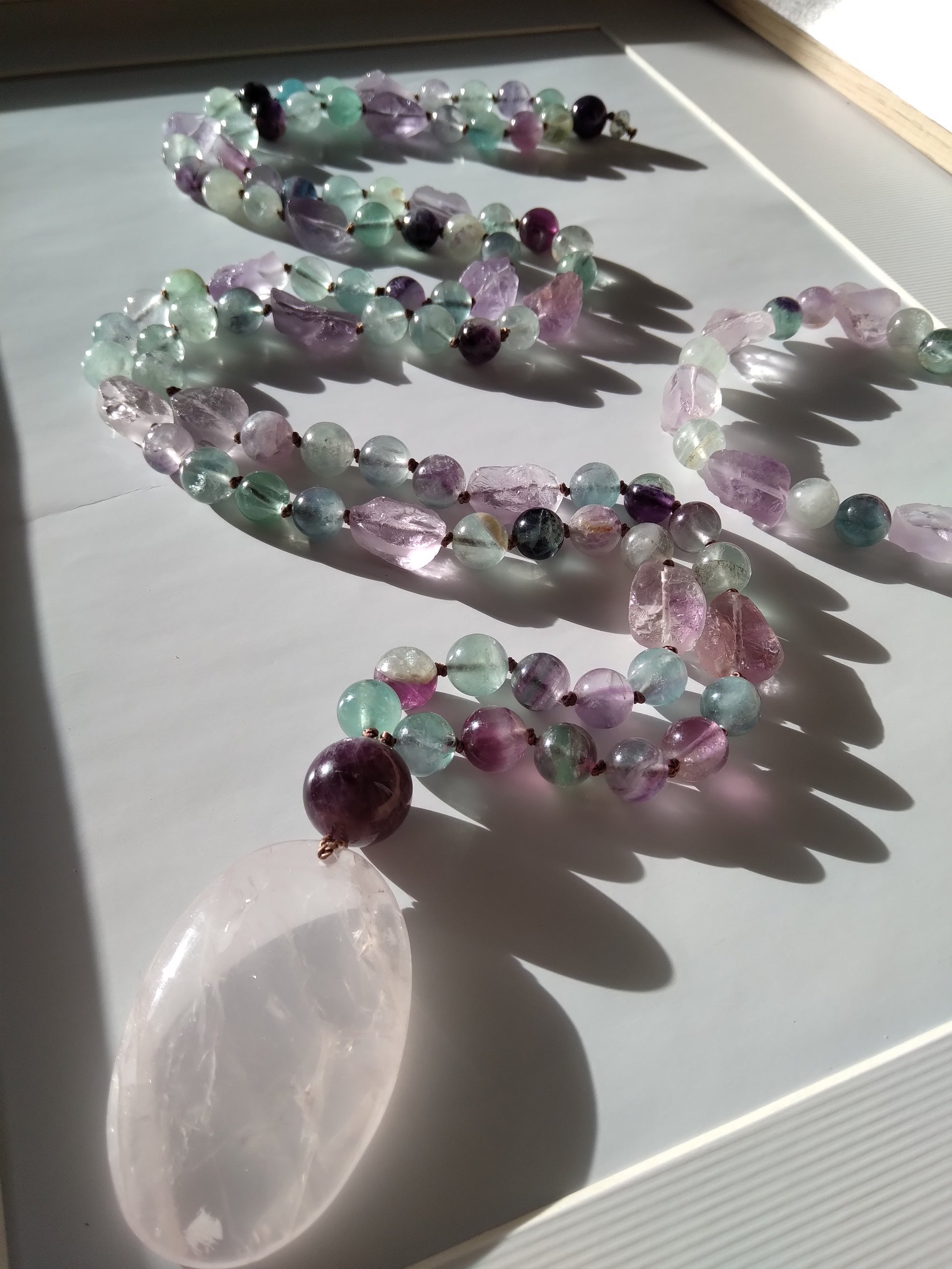 Ce mala se compose de 76 perles de 8 mm en fluorite verte, violette et rose, de 16 pépites d'améthyste brute, de 2 perles rondes d'améthyste (8 et 14 mm) et d'un beau pendentif ovale en quartz rose.