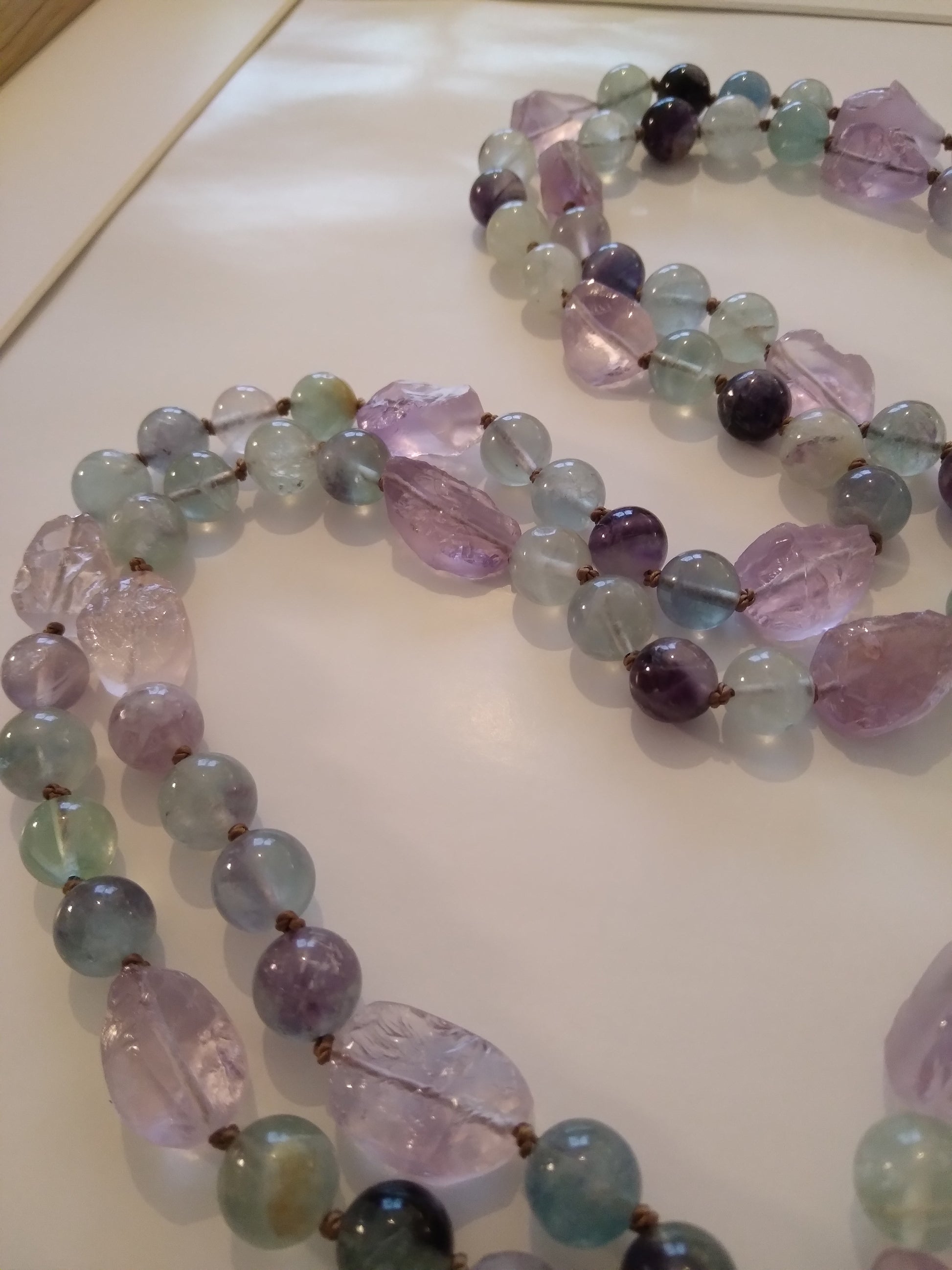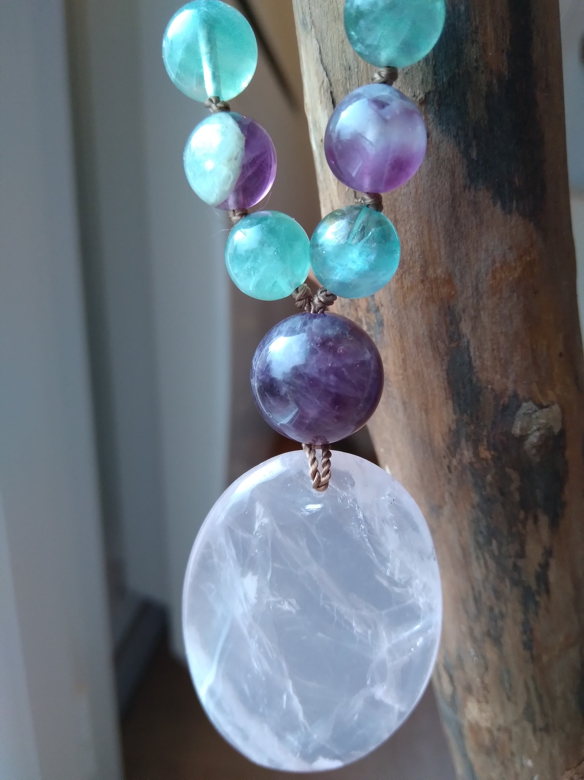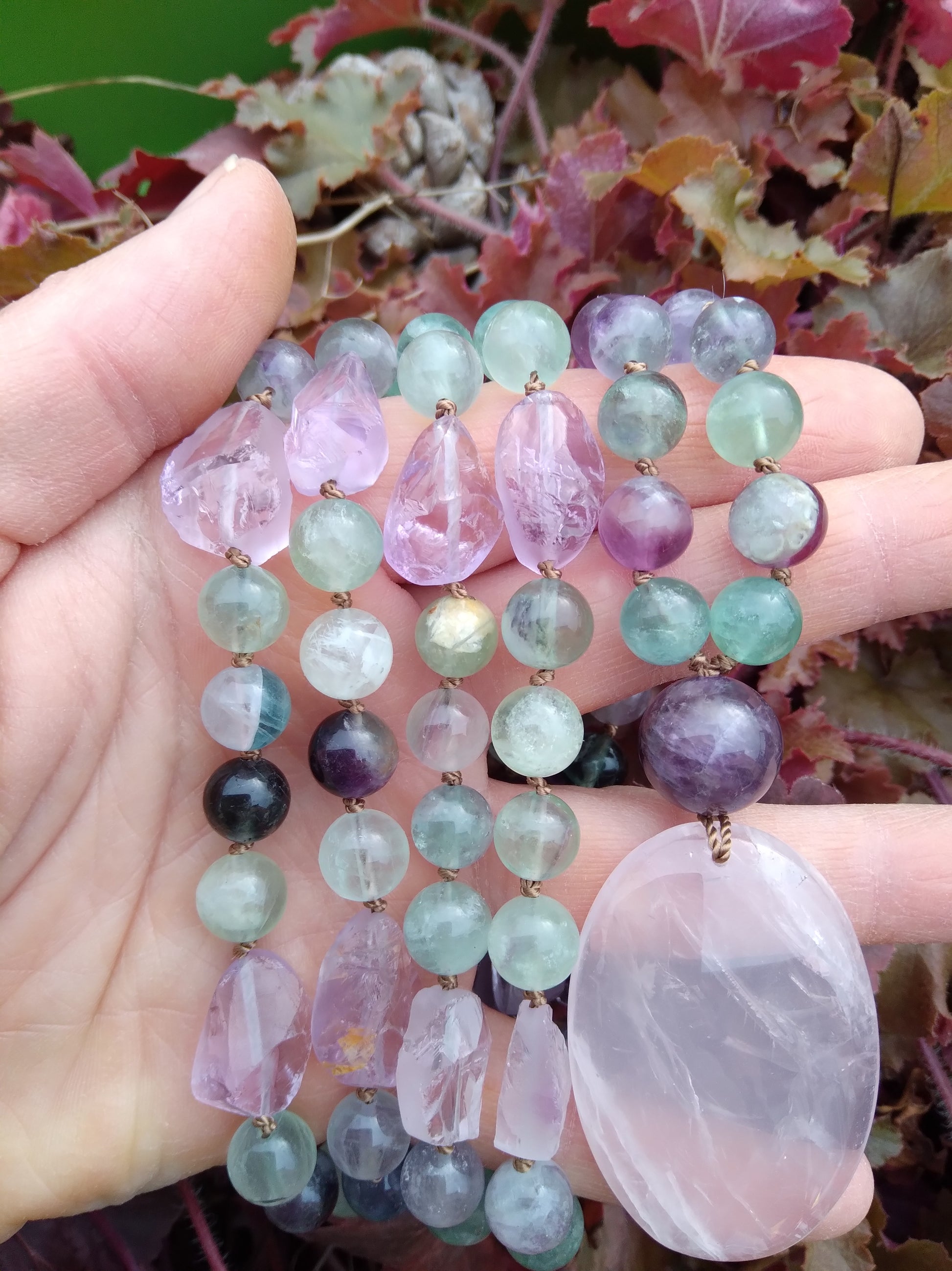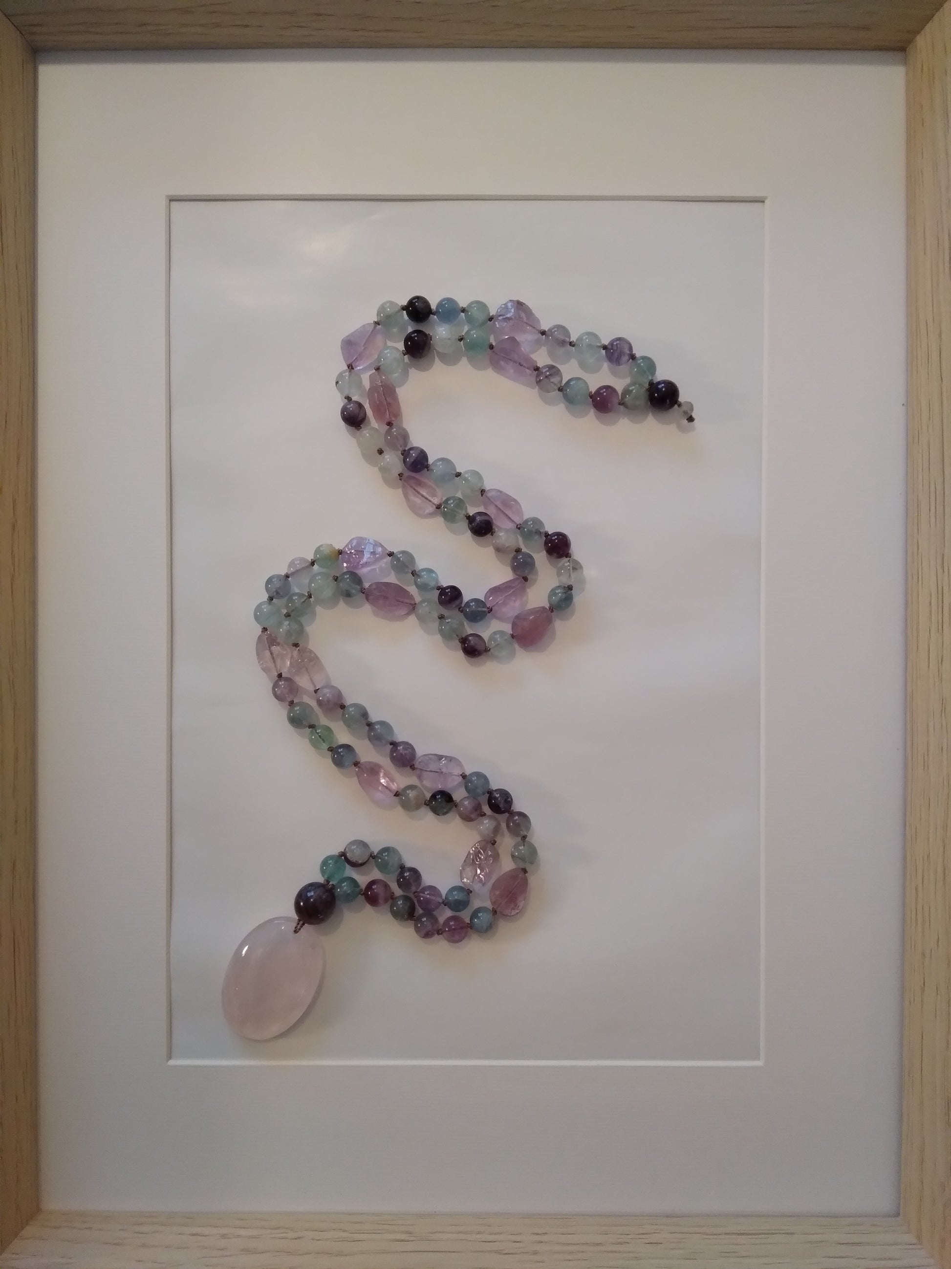 Ce mala se compose de 76 perles de 8 mm en fluorite verte, violette et rose, de 16 pépites d'améthyste brute, de 2 perles rondes d'améthyste (8 et 14 mm) et d'un beau pendentif ovale en quartz rose.