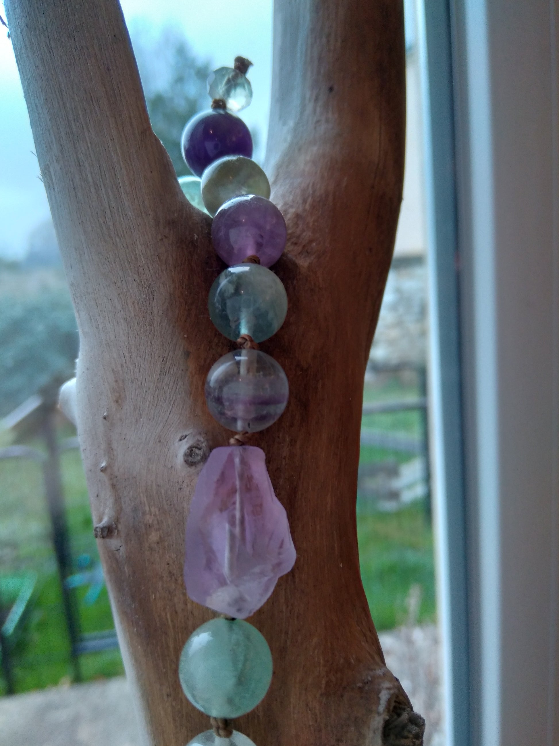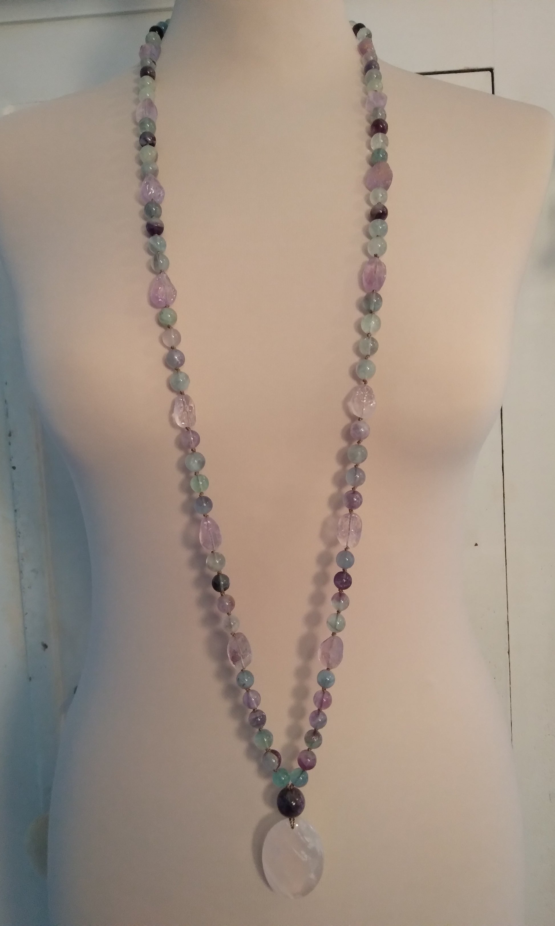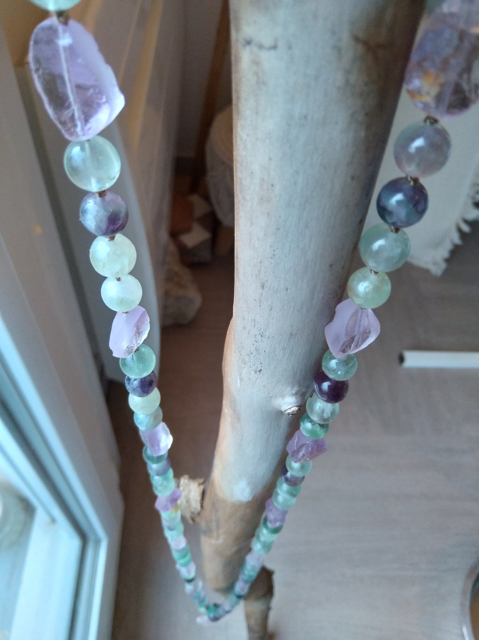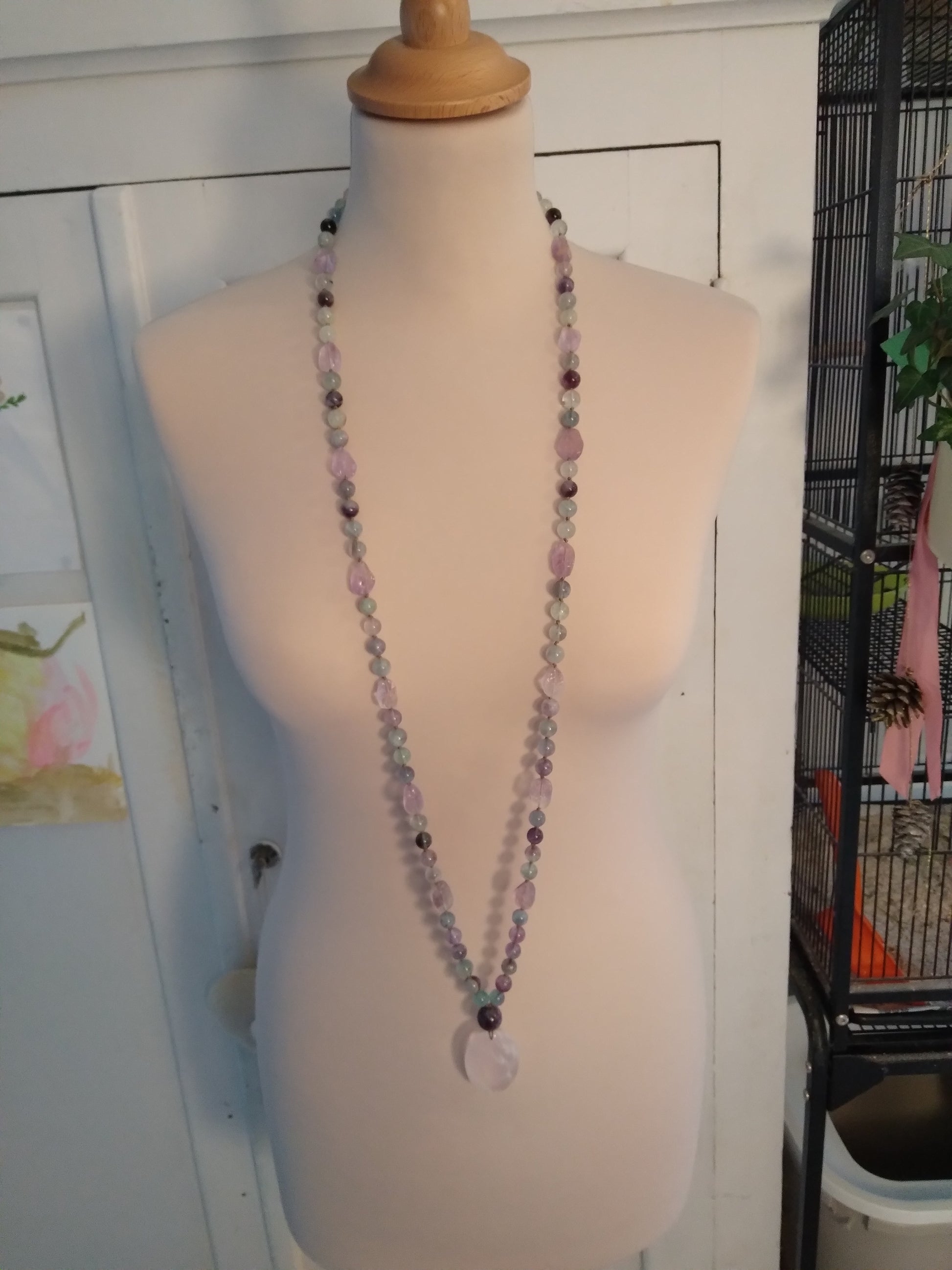Ce mala se compose de 76 perles de 8 mm en fluorite verte, violette et rose, de 16 pépites d'améthyste brute, de 2 perles rondes d'améthyste (8 et 14 mm) et d'un beau pendentif ovale en quartz rose.