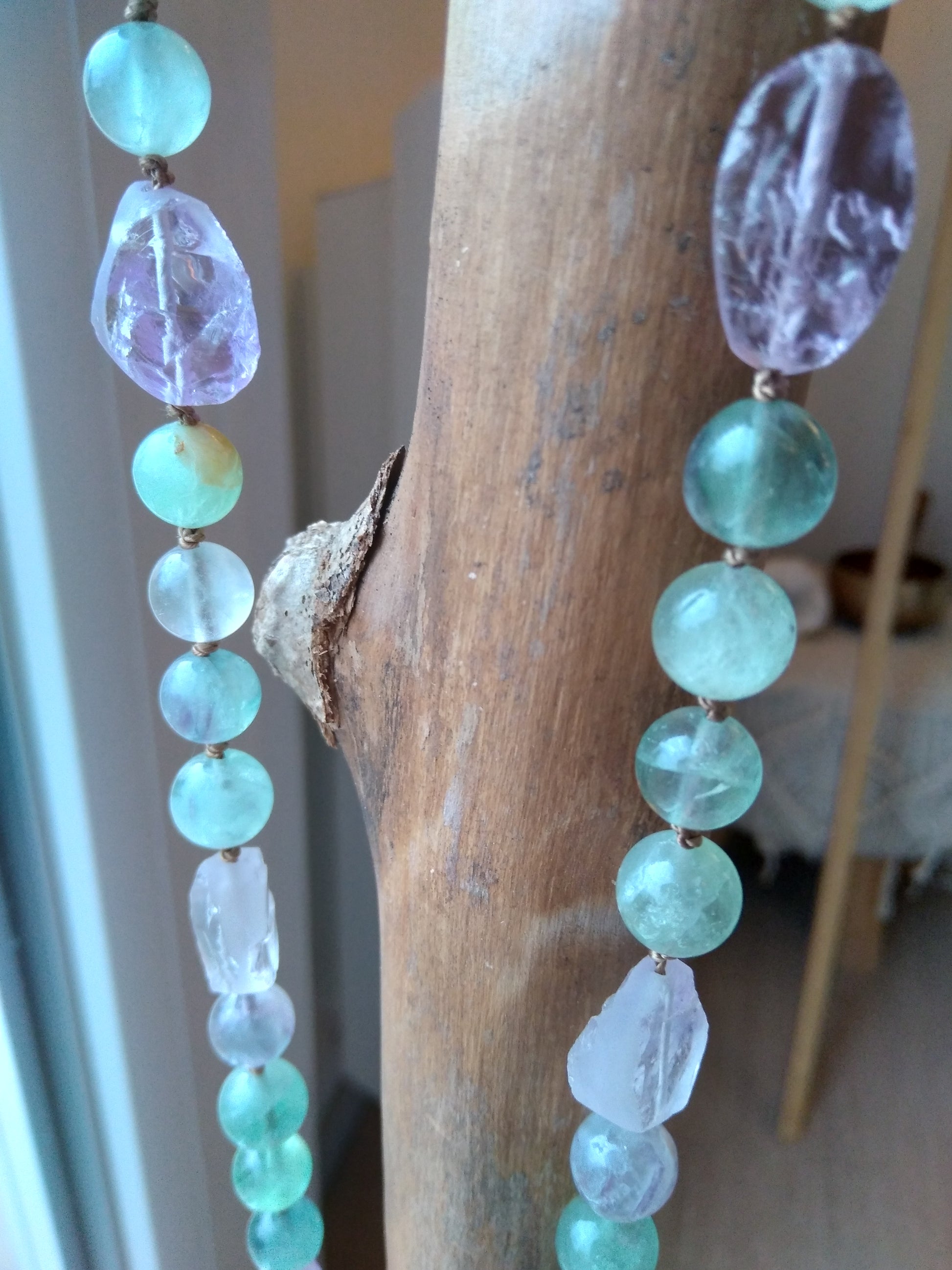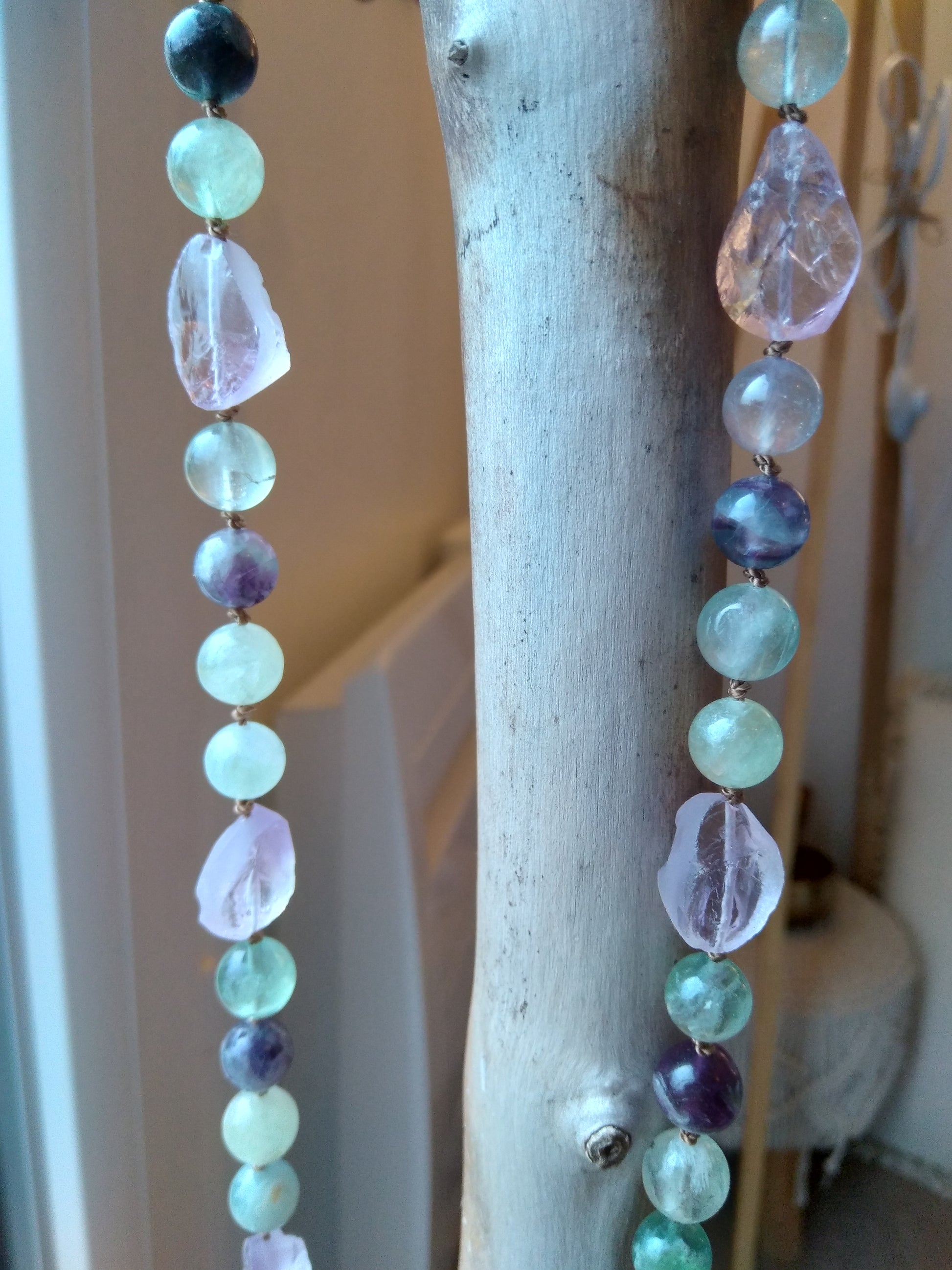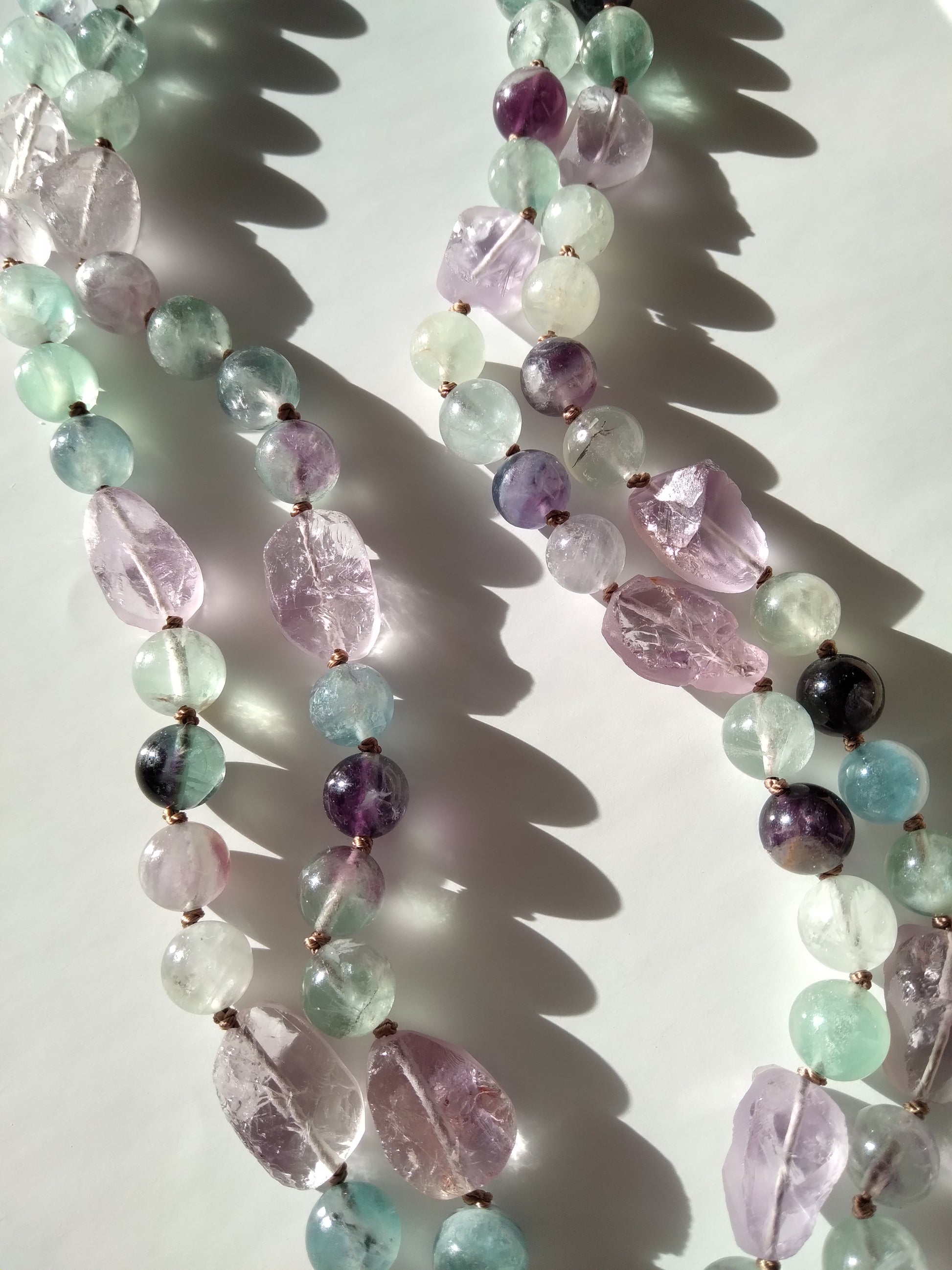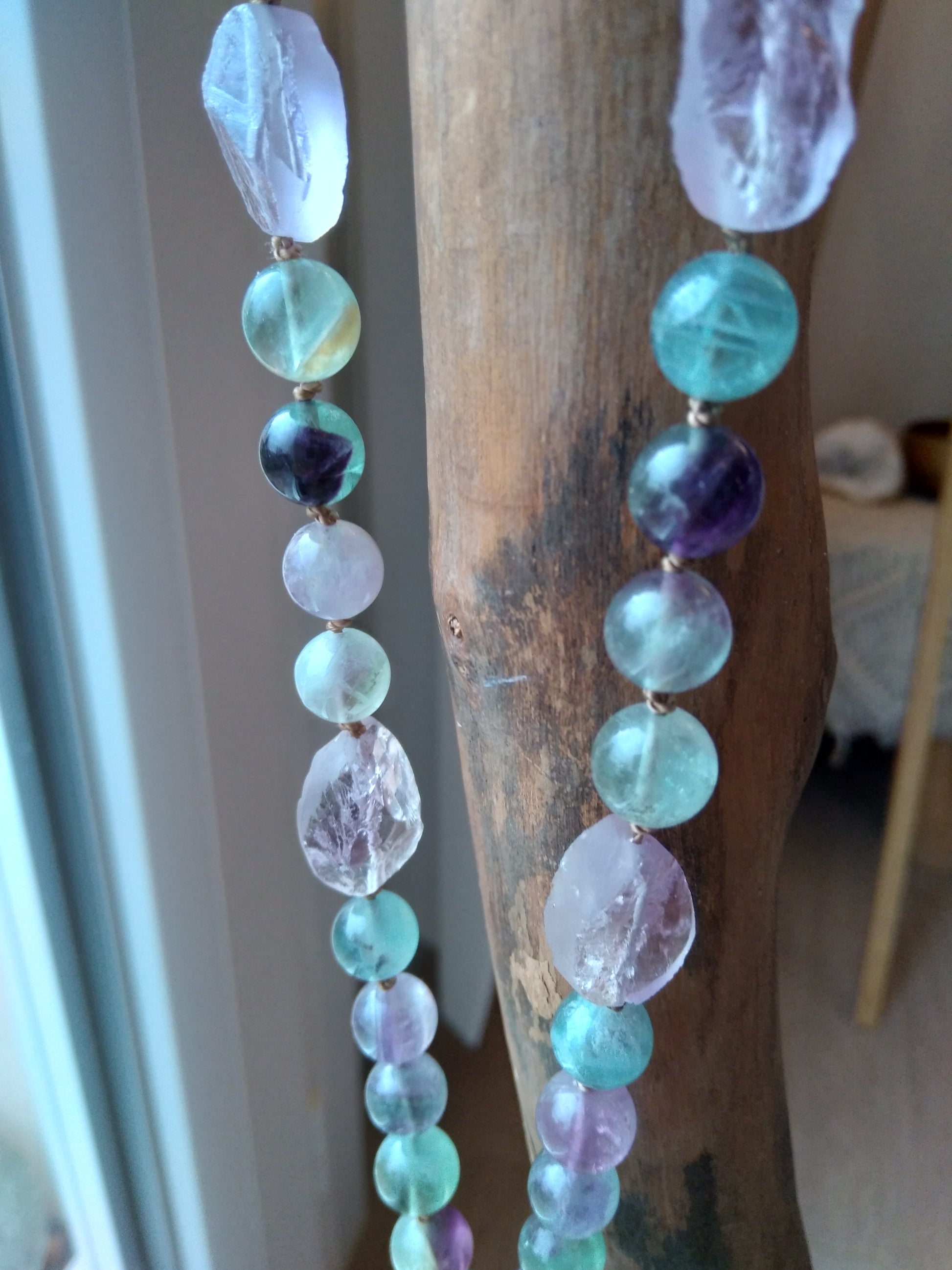 Ce mala se compose de 76 perles de 8 mm en fluorite verte, violette et rose, de 16 pépites d'améthyste brute, de 2 perles rondes d'améthyste (8 et 14 mm) et d'un beau pendentif ovale en quartz rose.