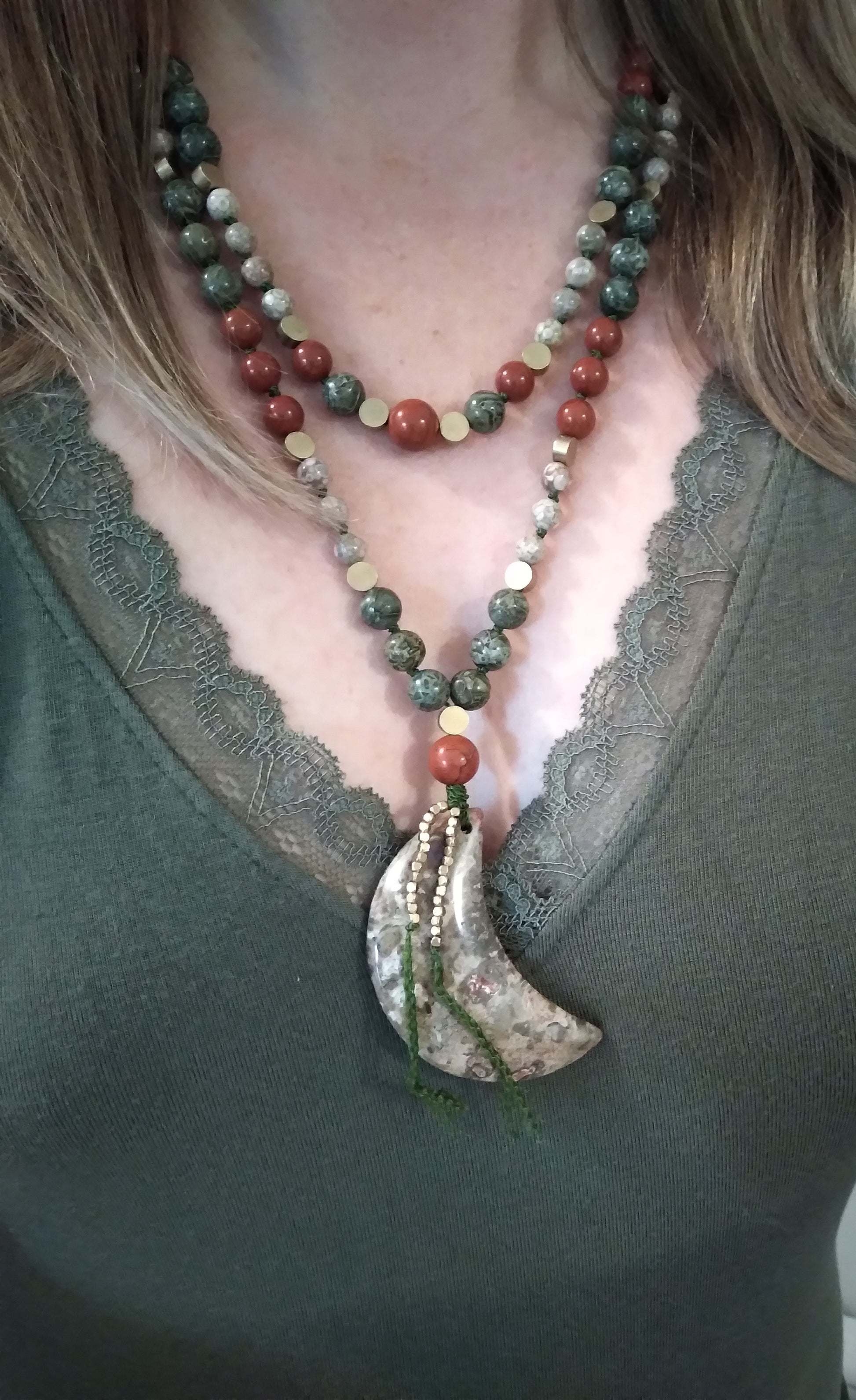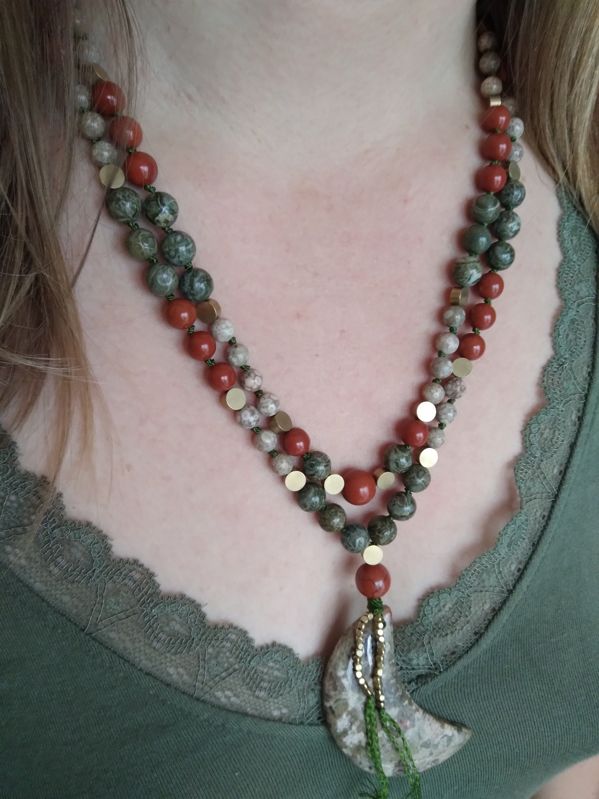 Mala en jaspe bréchique vert, jaspe rouge et maïfanite "Ancrage et connexion"