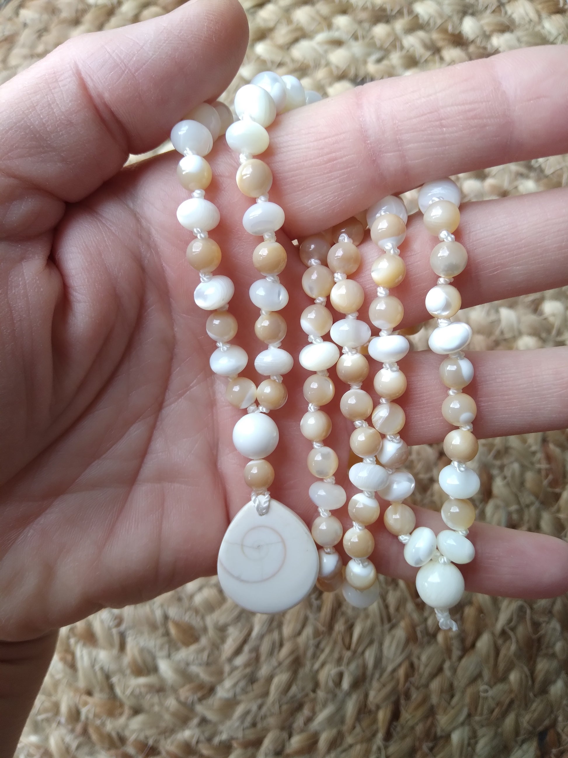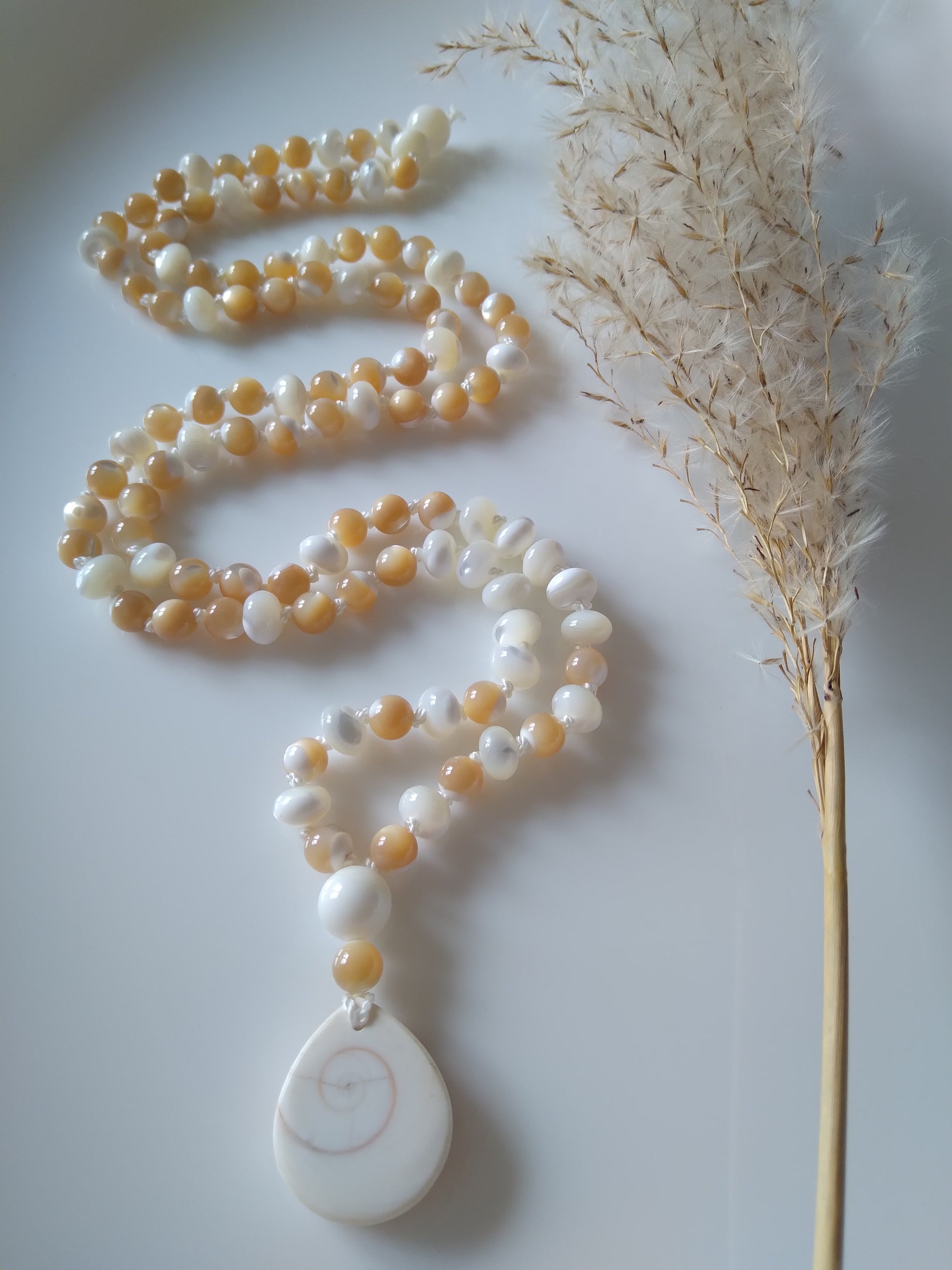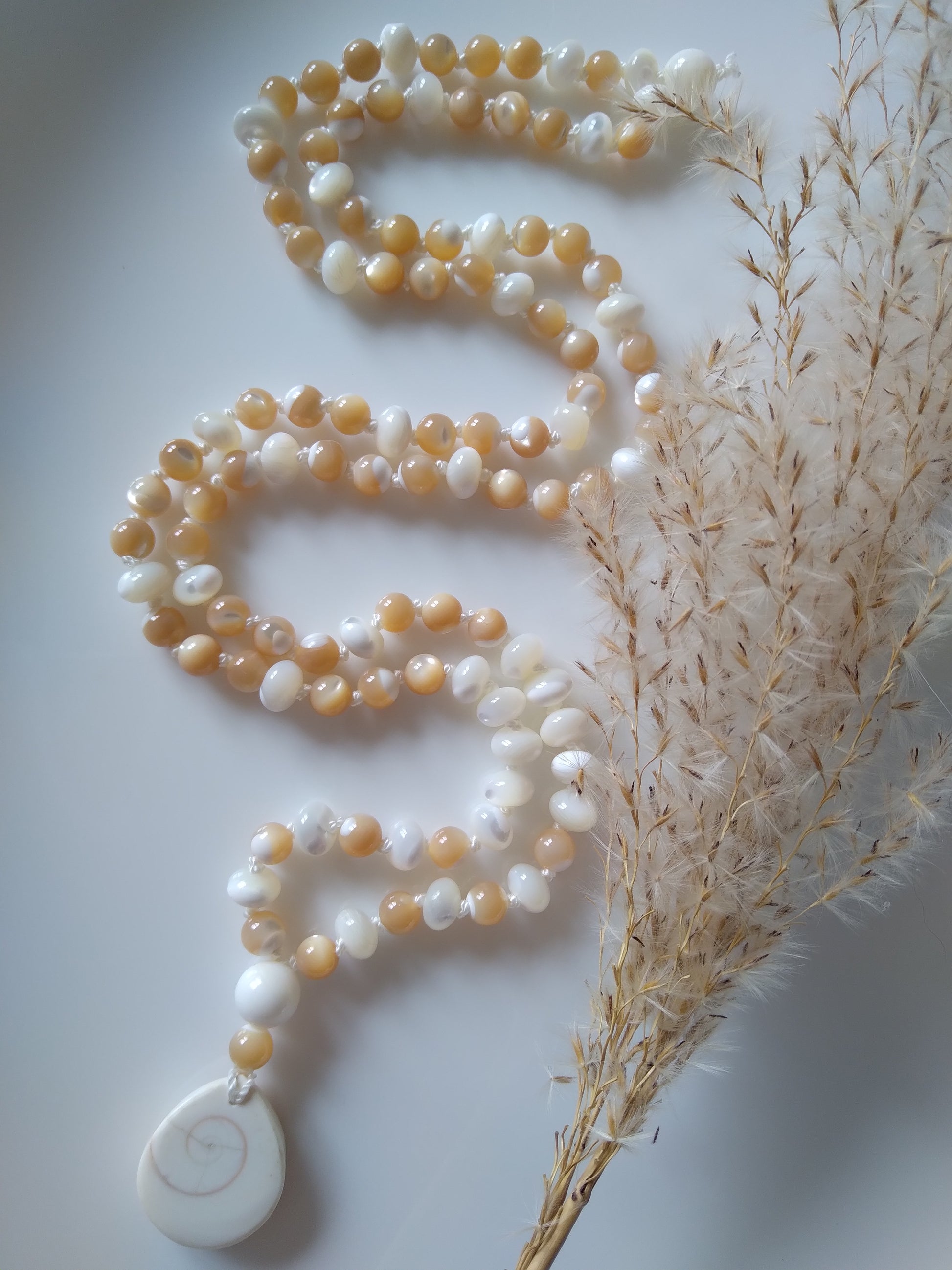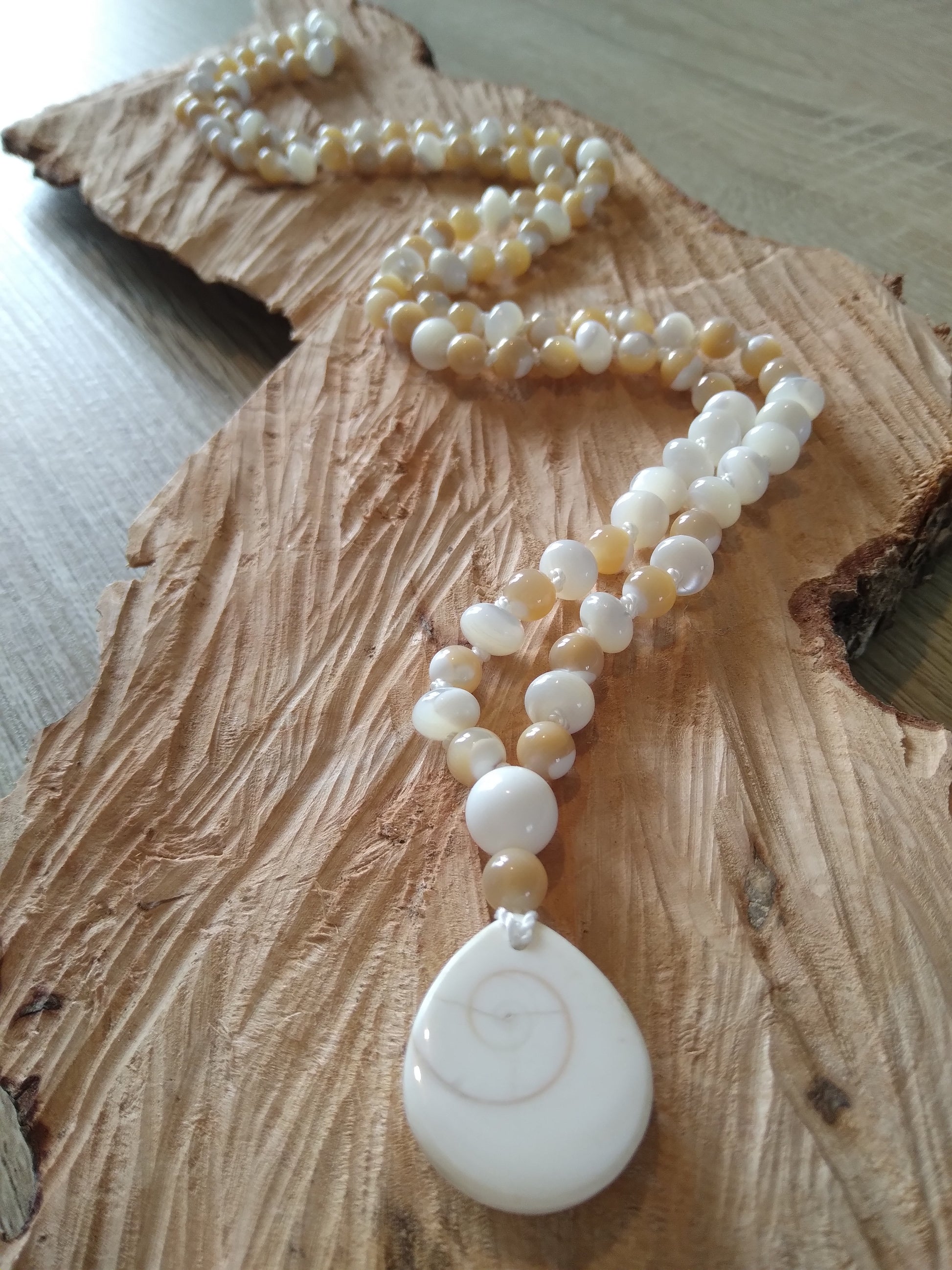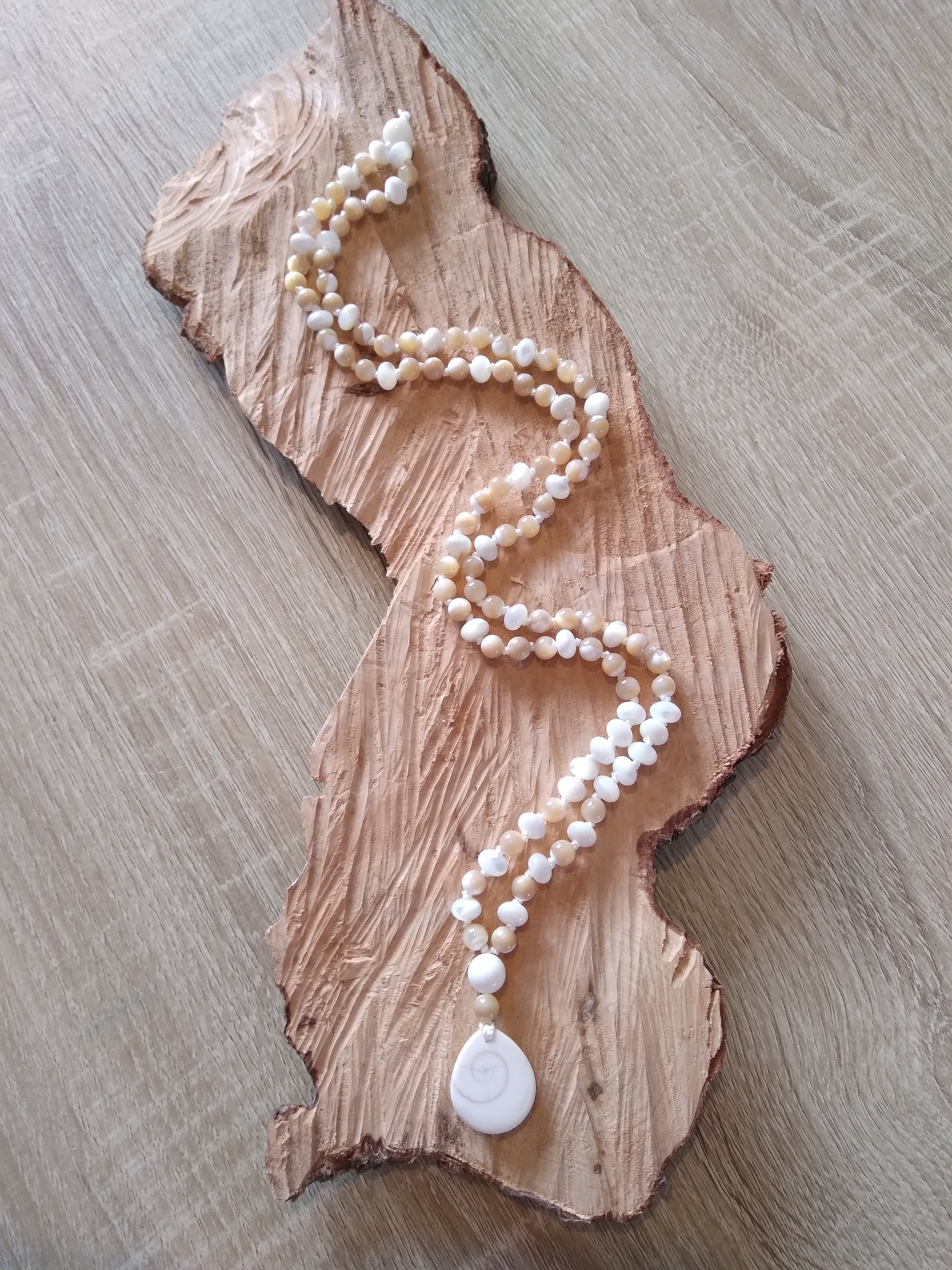 On accueille ici la pureté avec des perles en nacre beige et blanche, des perles de bénitier et un œil de Shiva, autrement appelé œil de Sainte Lucie