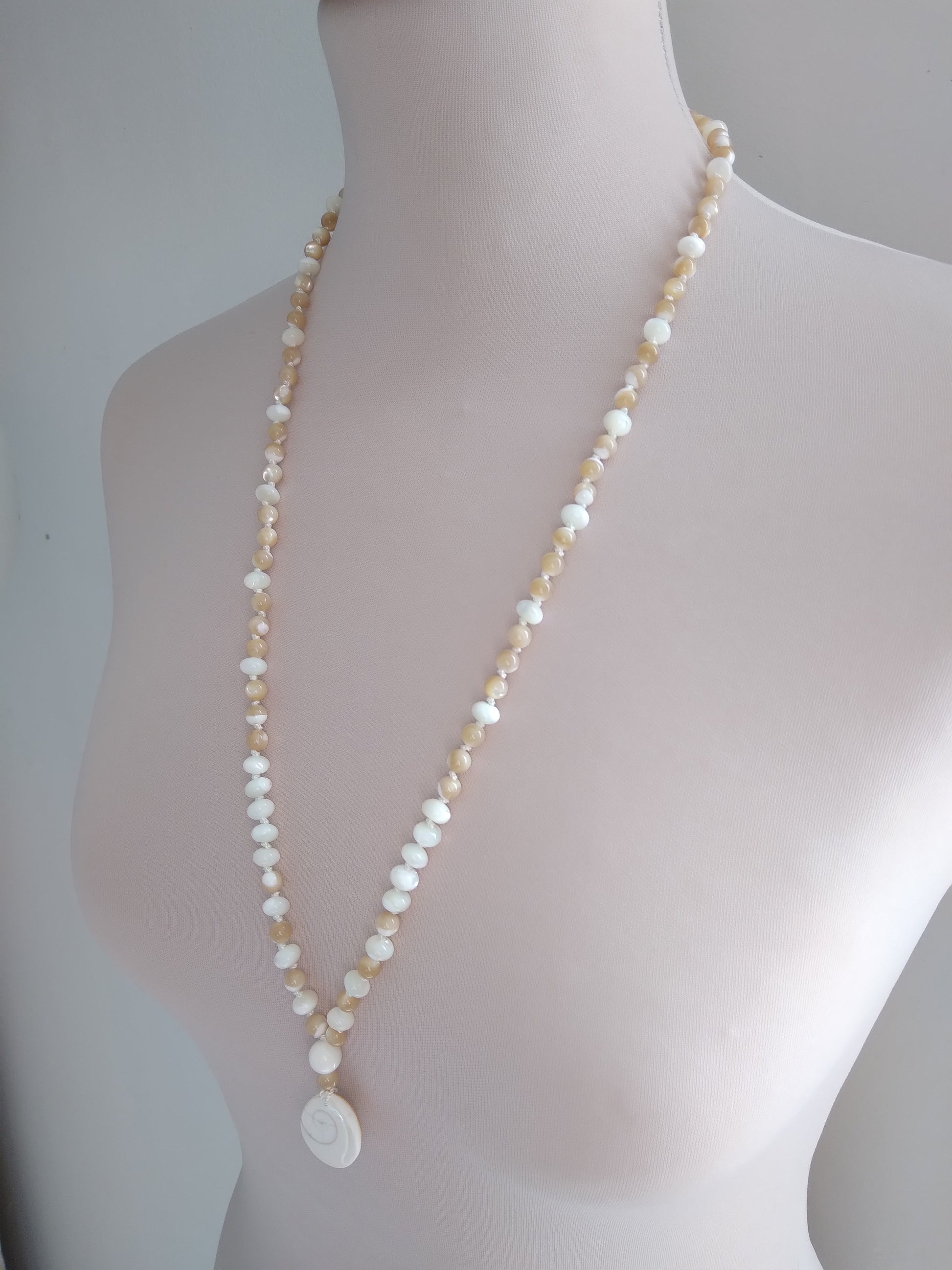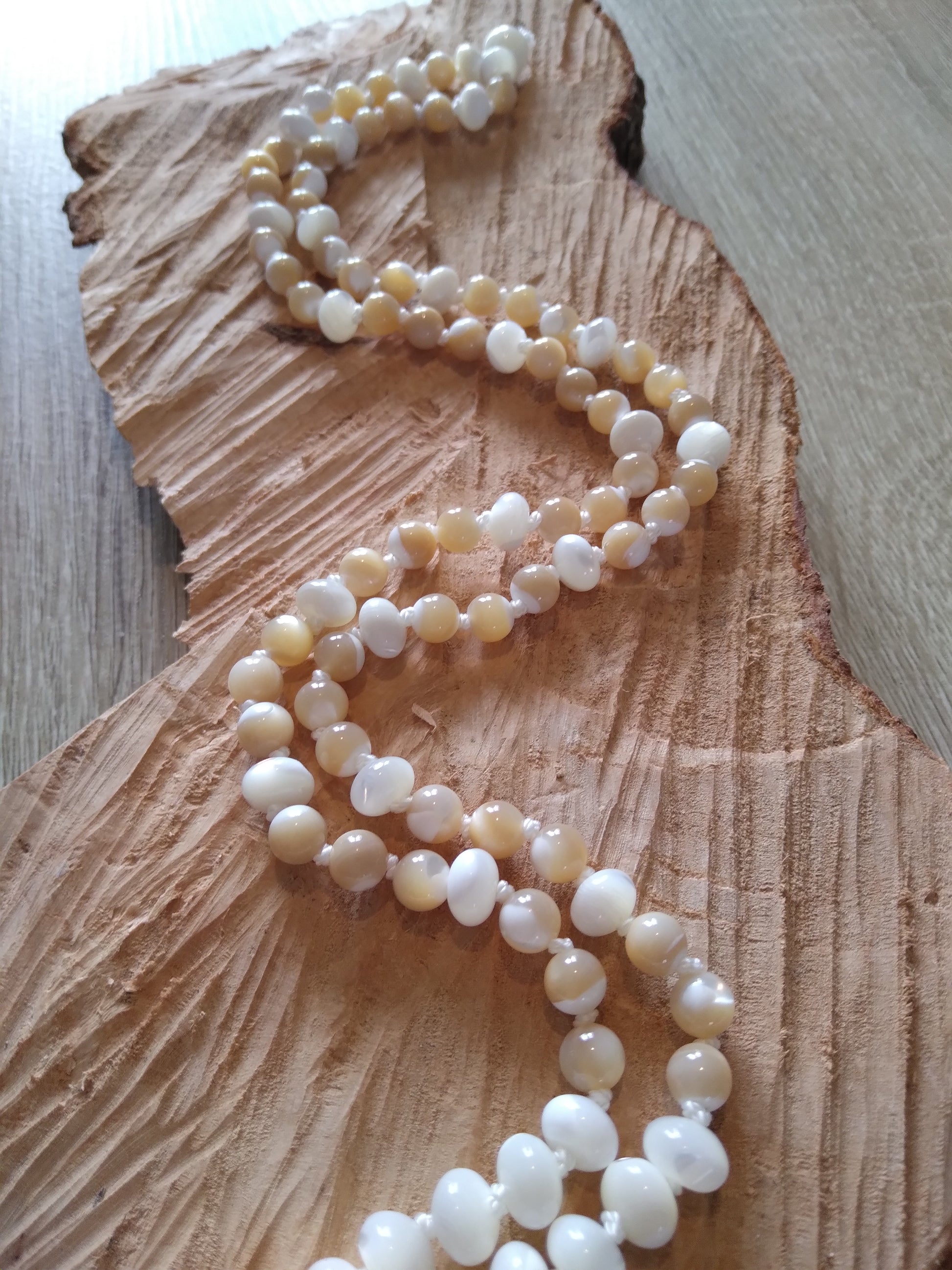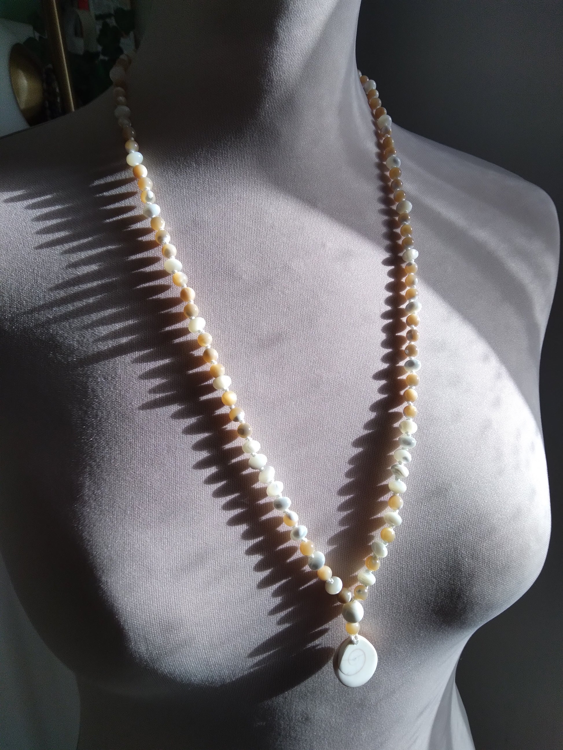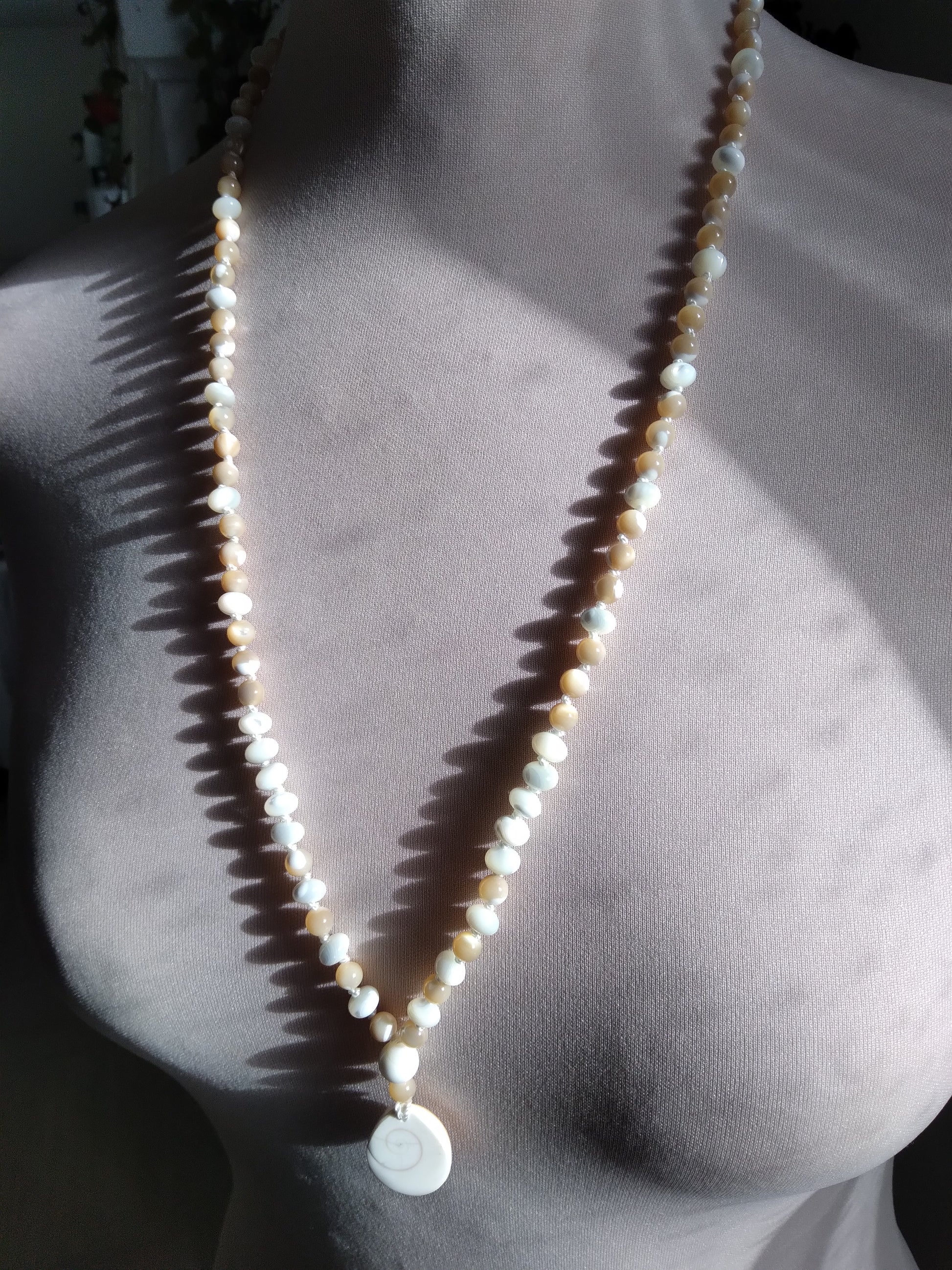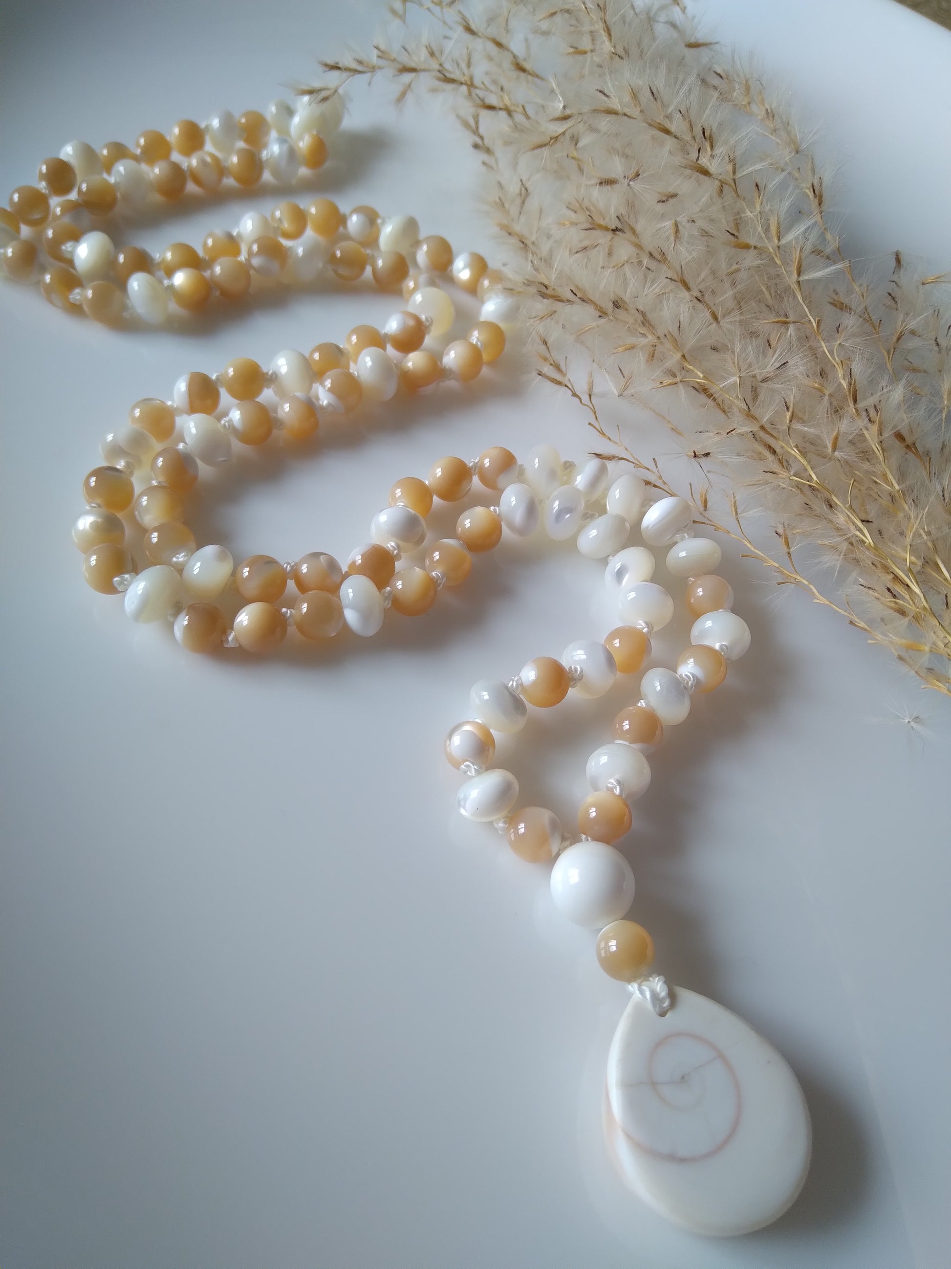 On accueille ici la pureté avec des perles en nacre beige et blanche, des perles de bénitier et un œil de Shiva, autrement appelé œil de Sainte Lucie