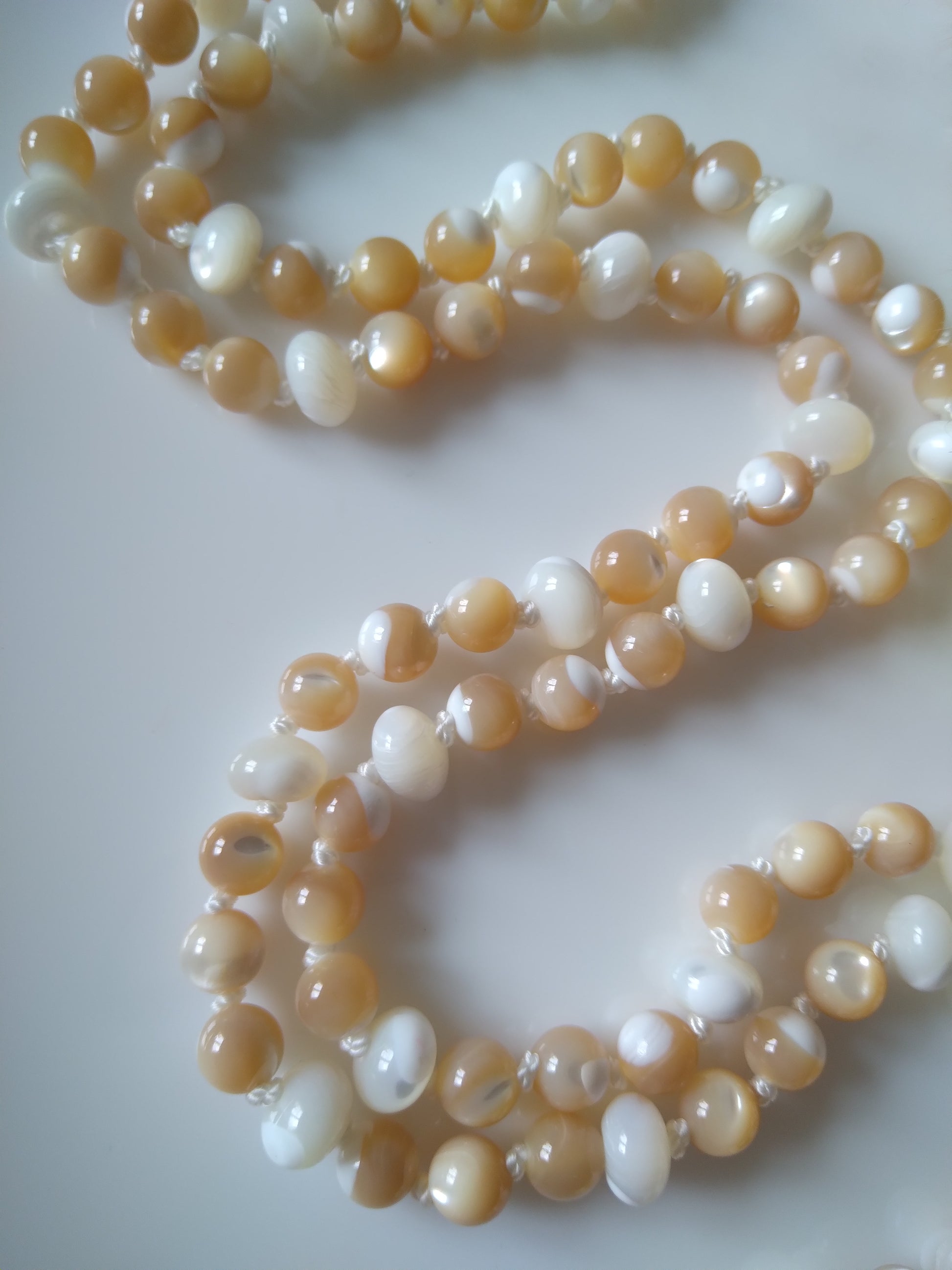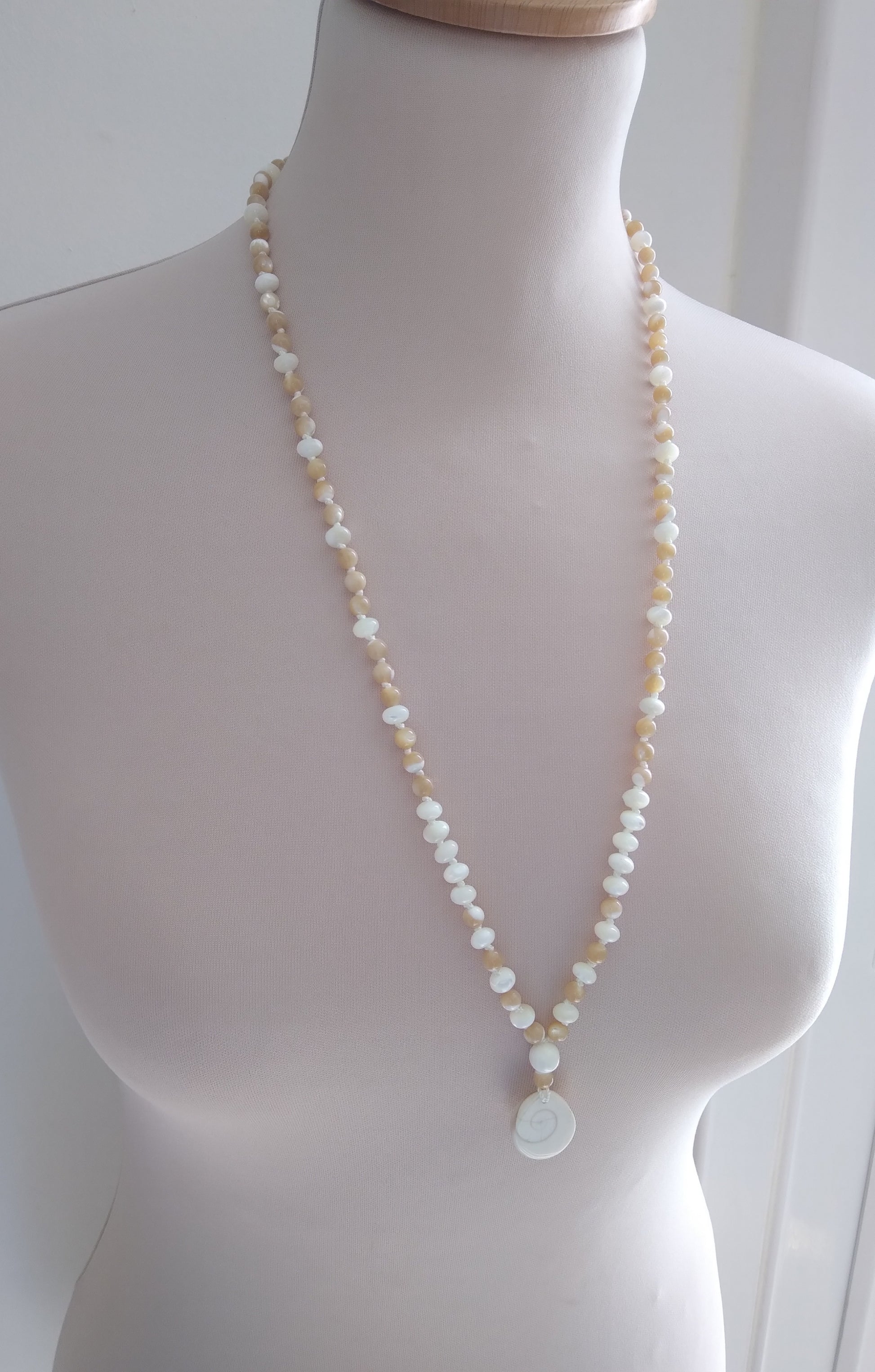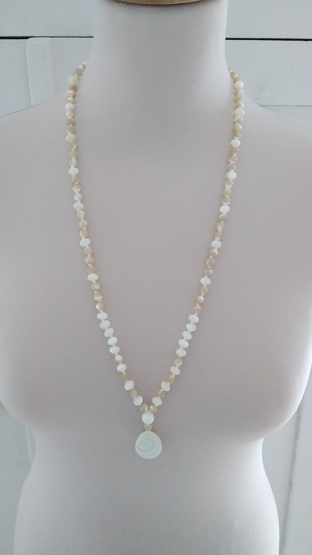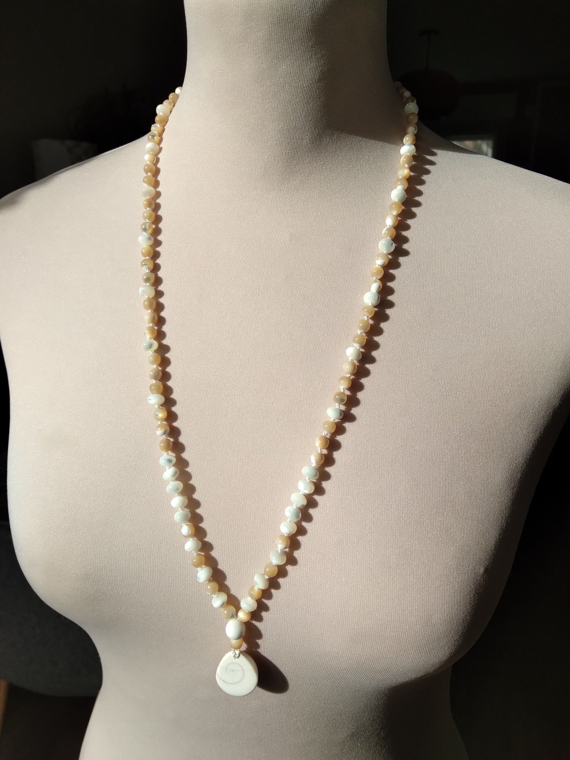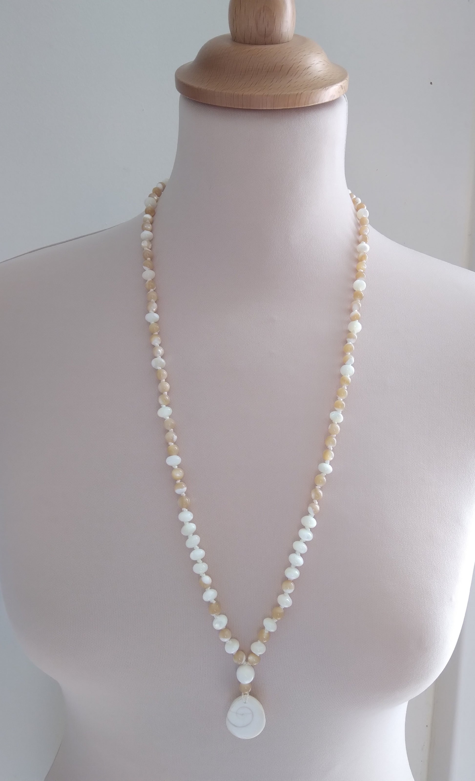 On accueille ici la pureté avec des perles en nacre beige et blanche, des perles de bénitier et un œil de Shiva, autrement appelé œil de Sainte Lucie