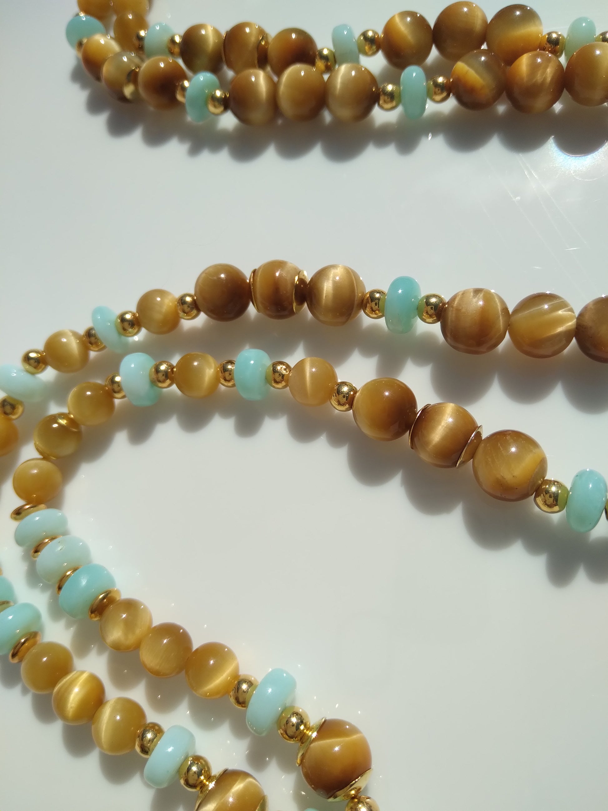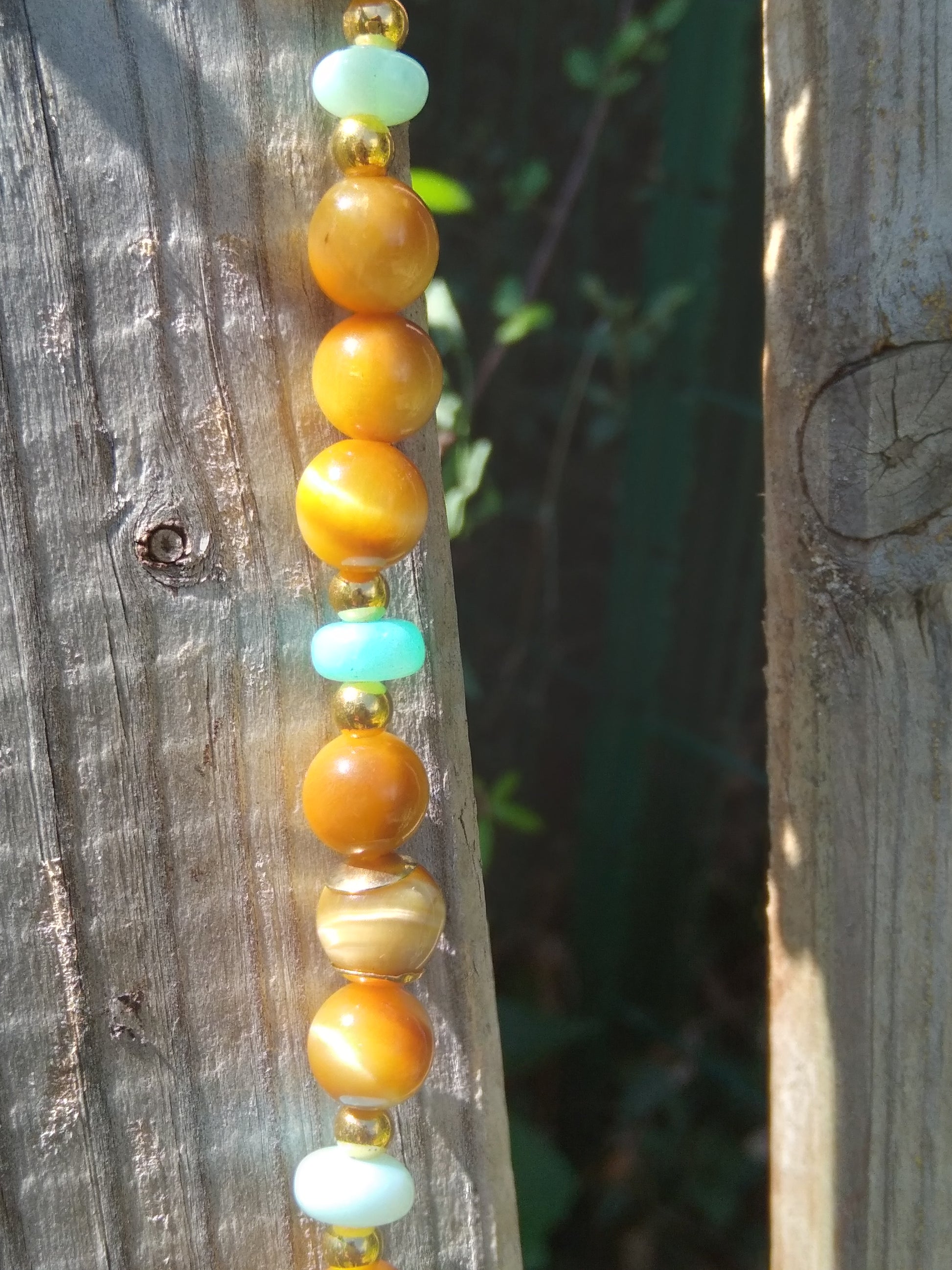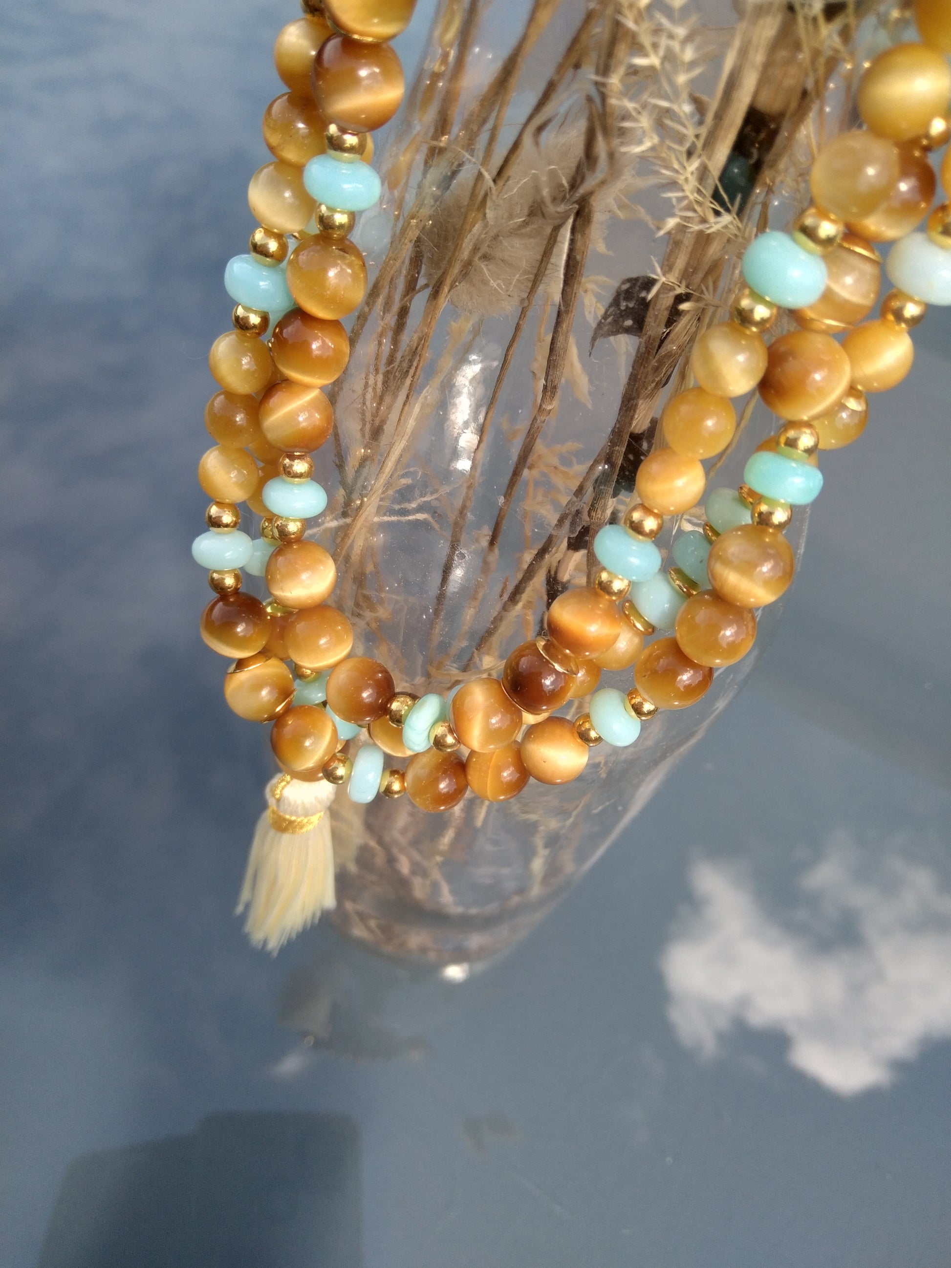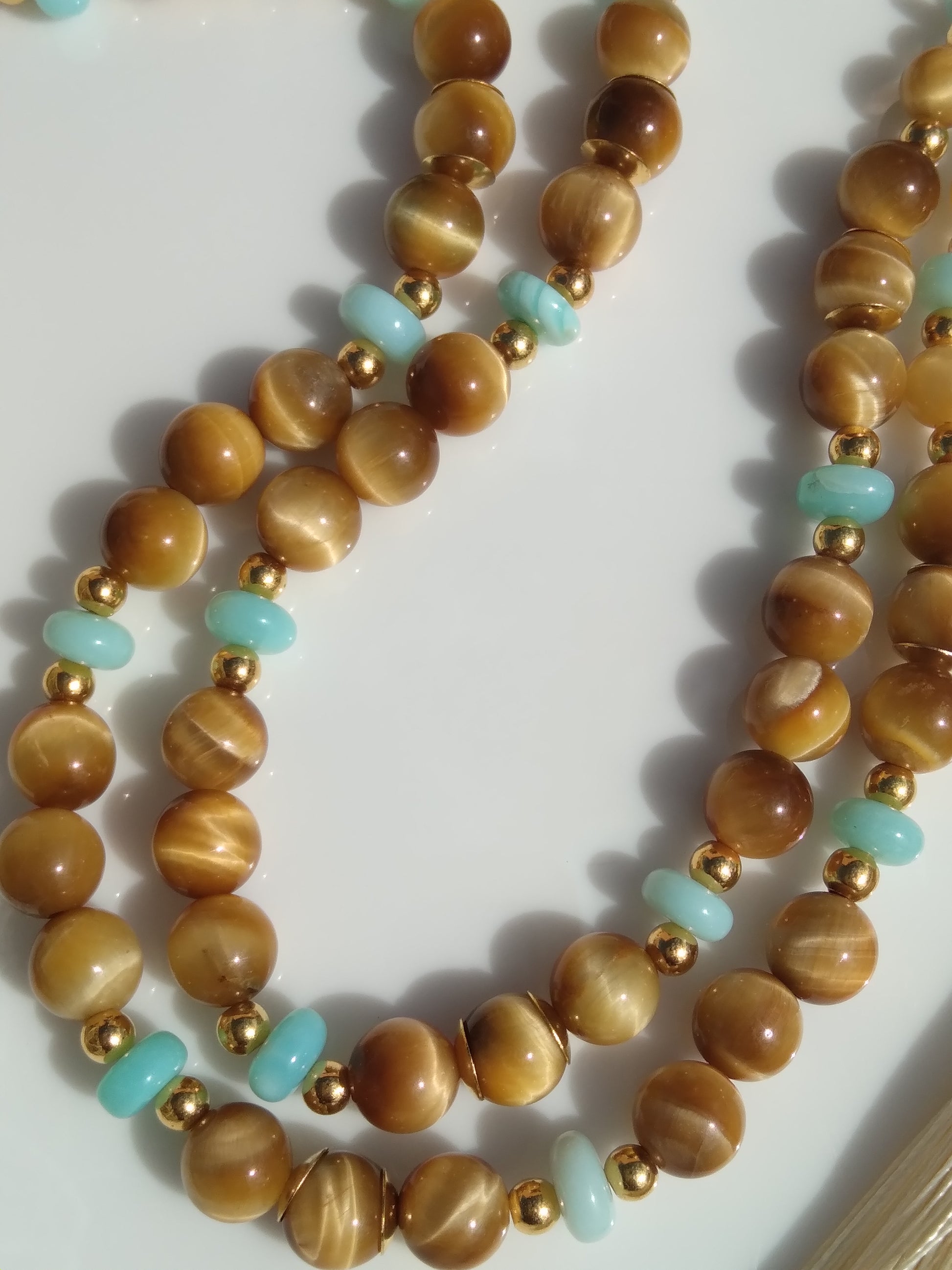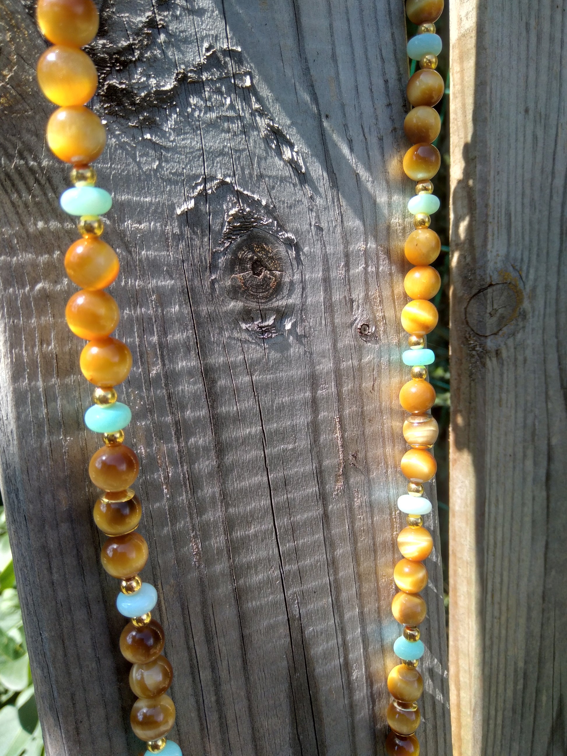Perles en œil de tigre doré (œil de tigre camel en 8 mm et 6 mm) et perles en opale bleue rondelles.