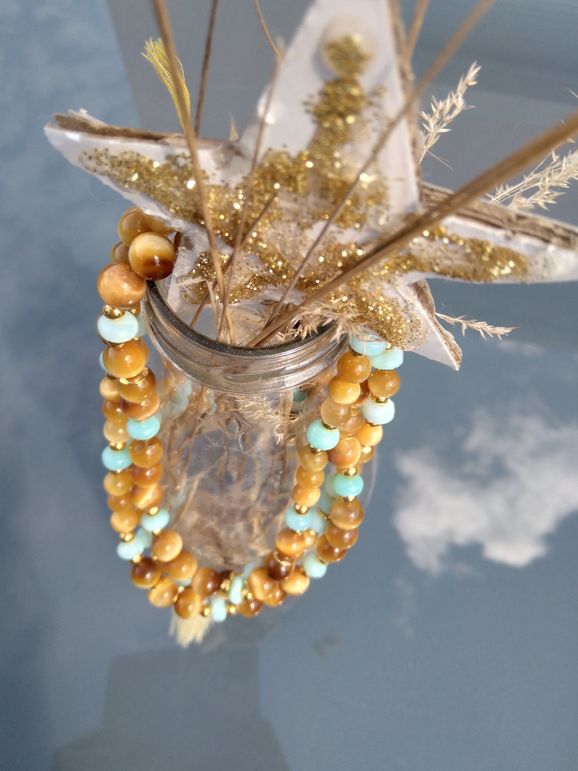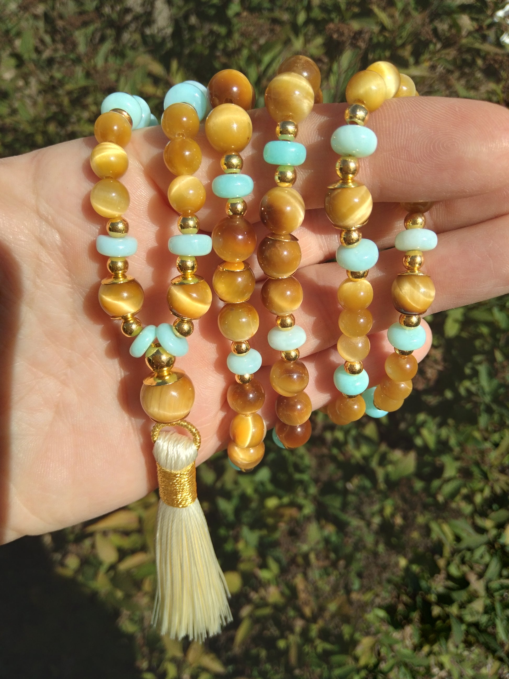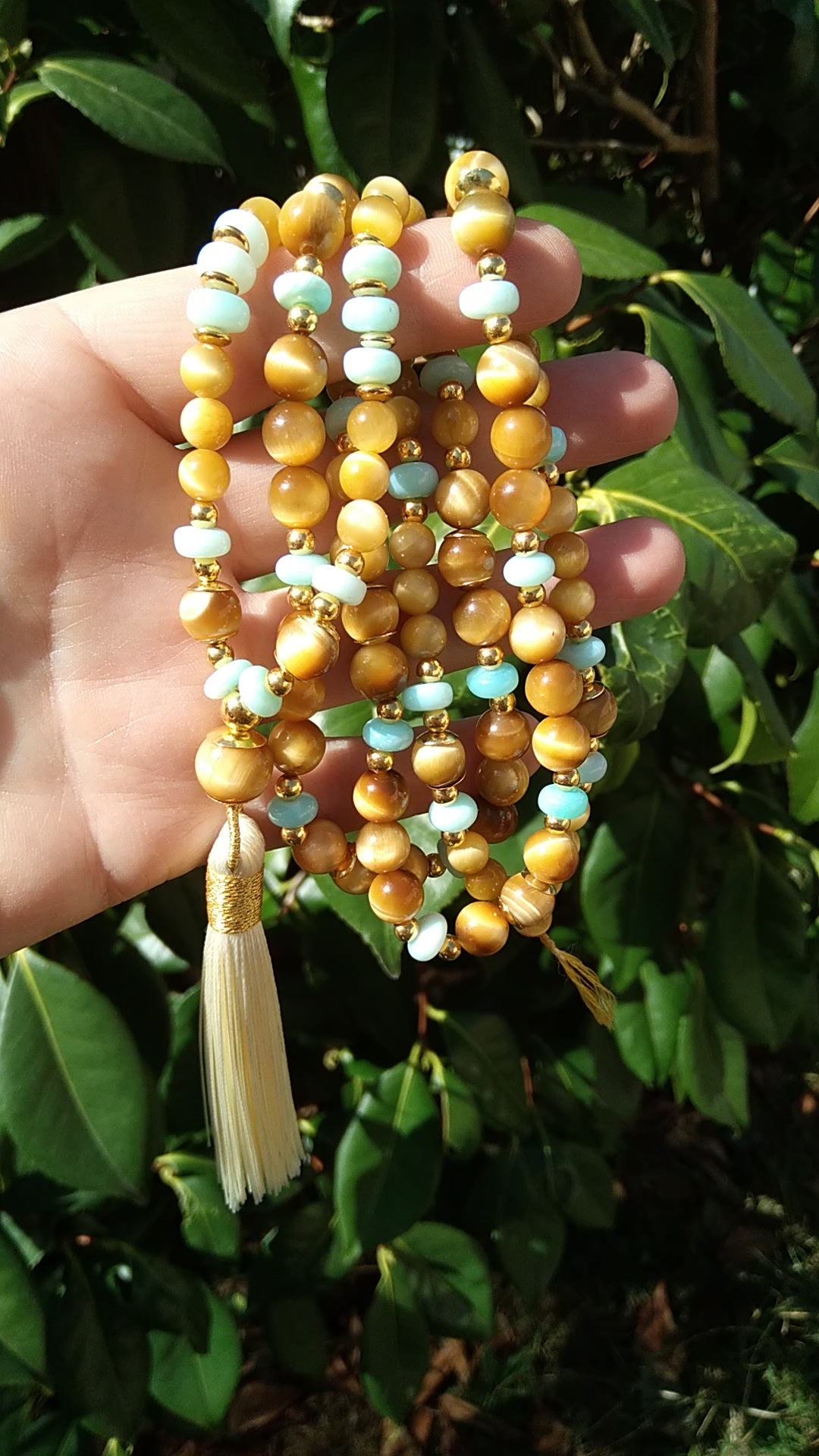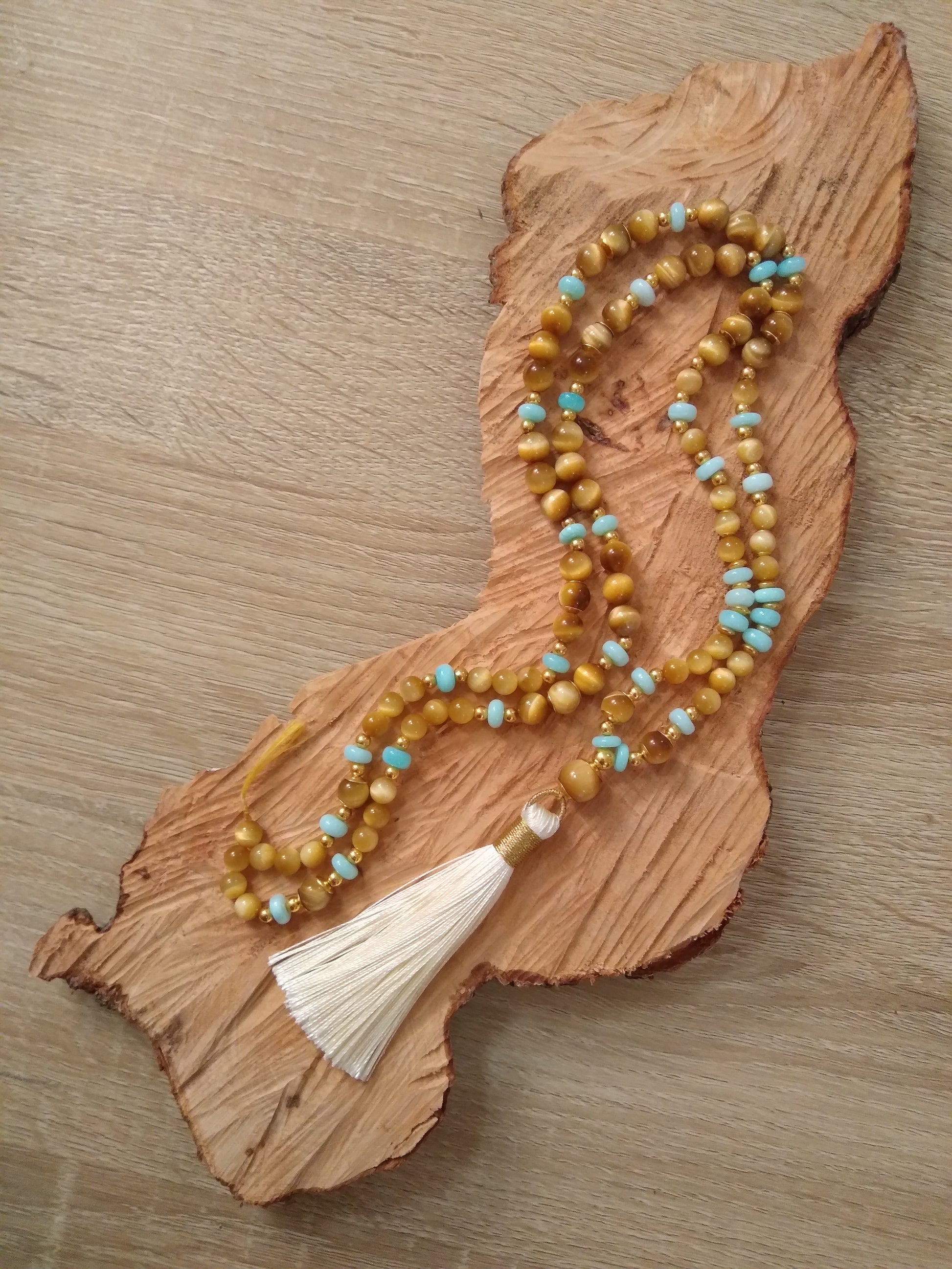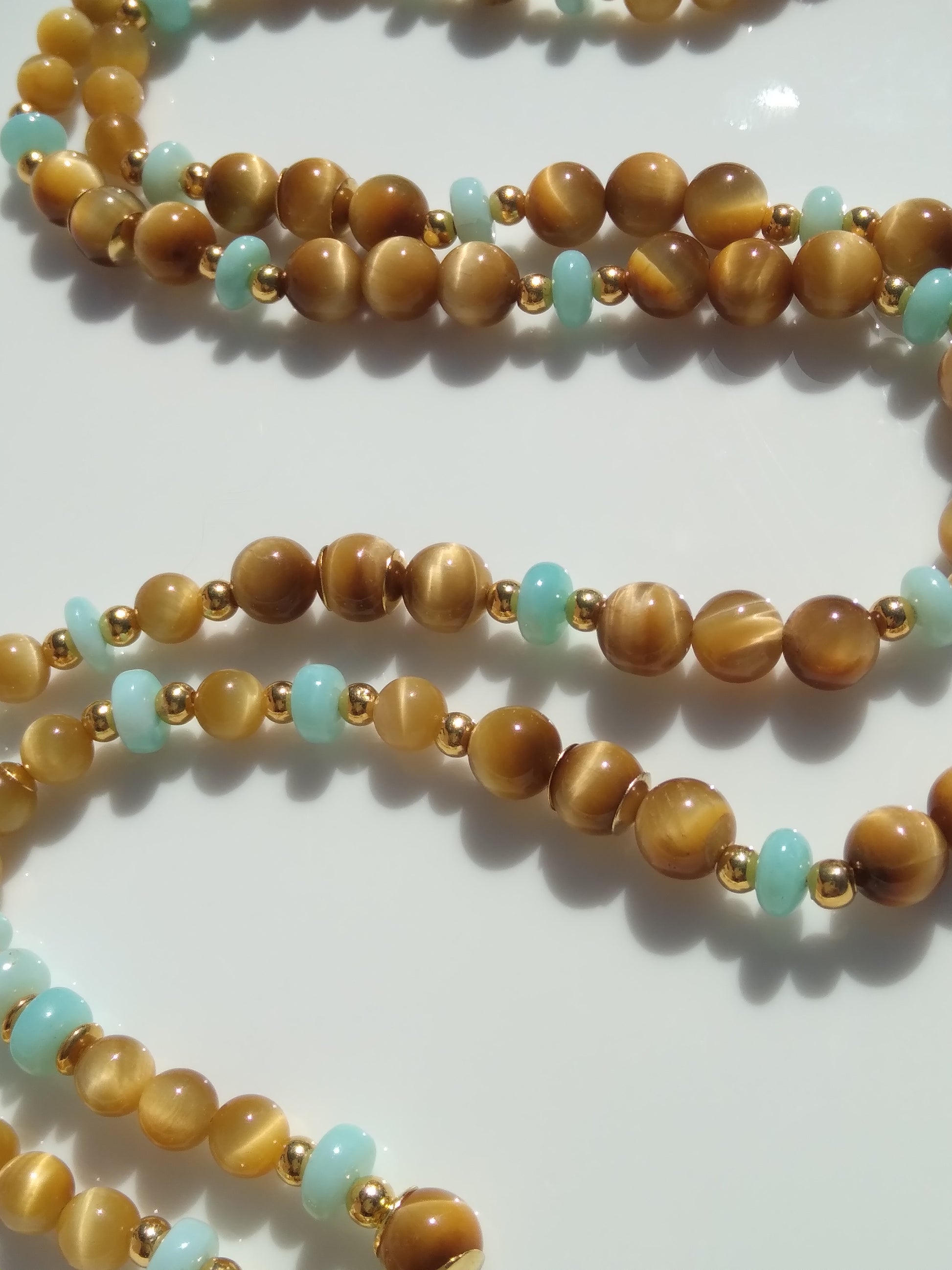 Perles en œil de tigre doré (œil de tigre camel en 8 mm et 6 mm) et perles en opale bleue rondelles.