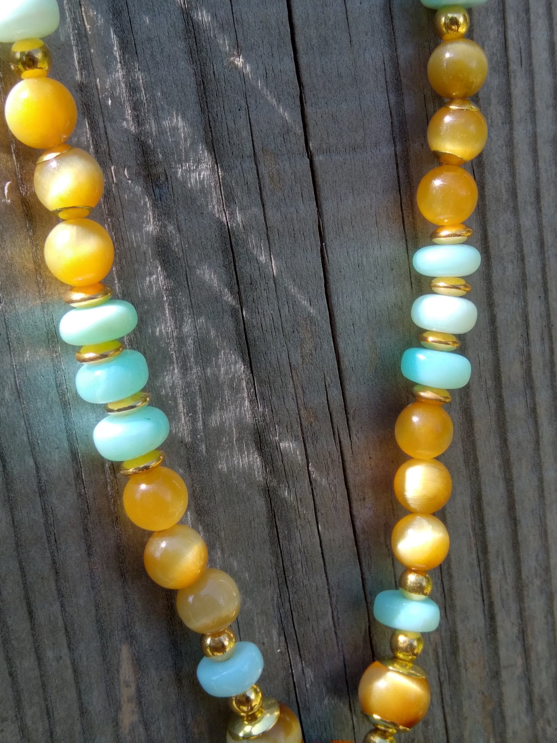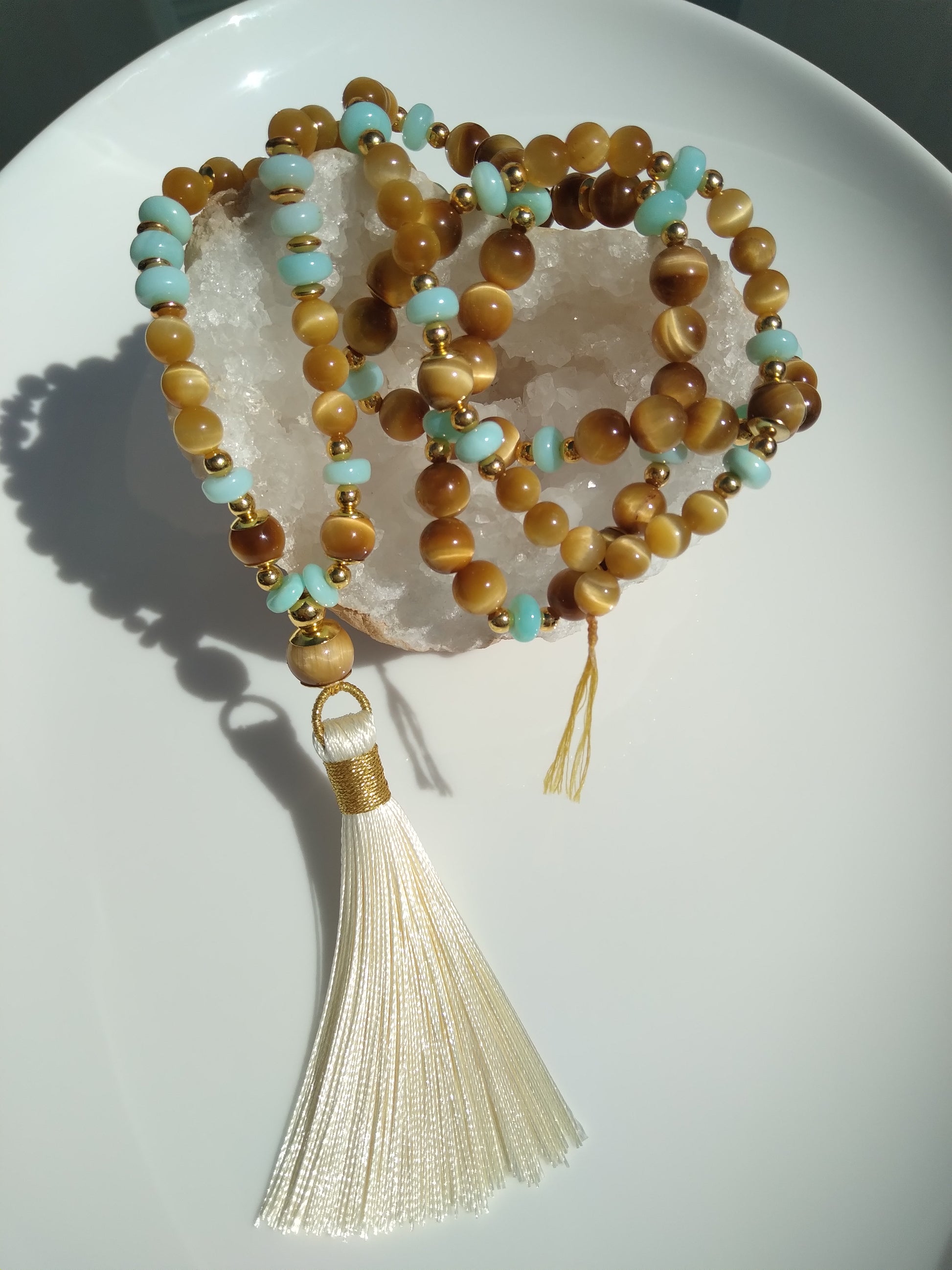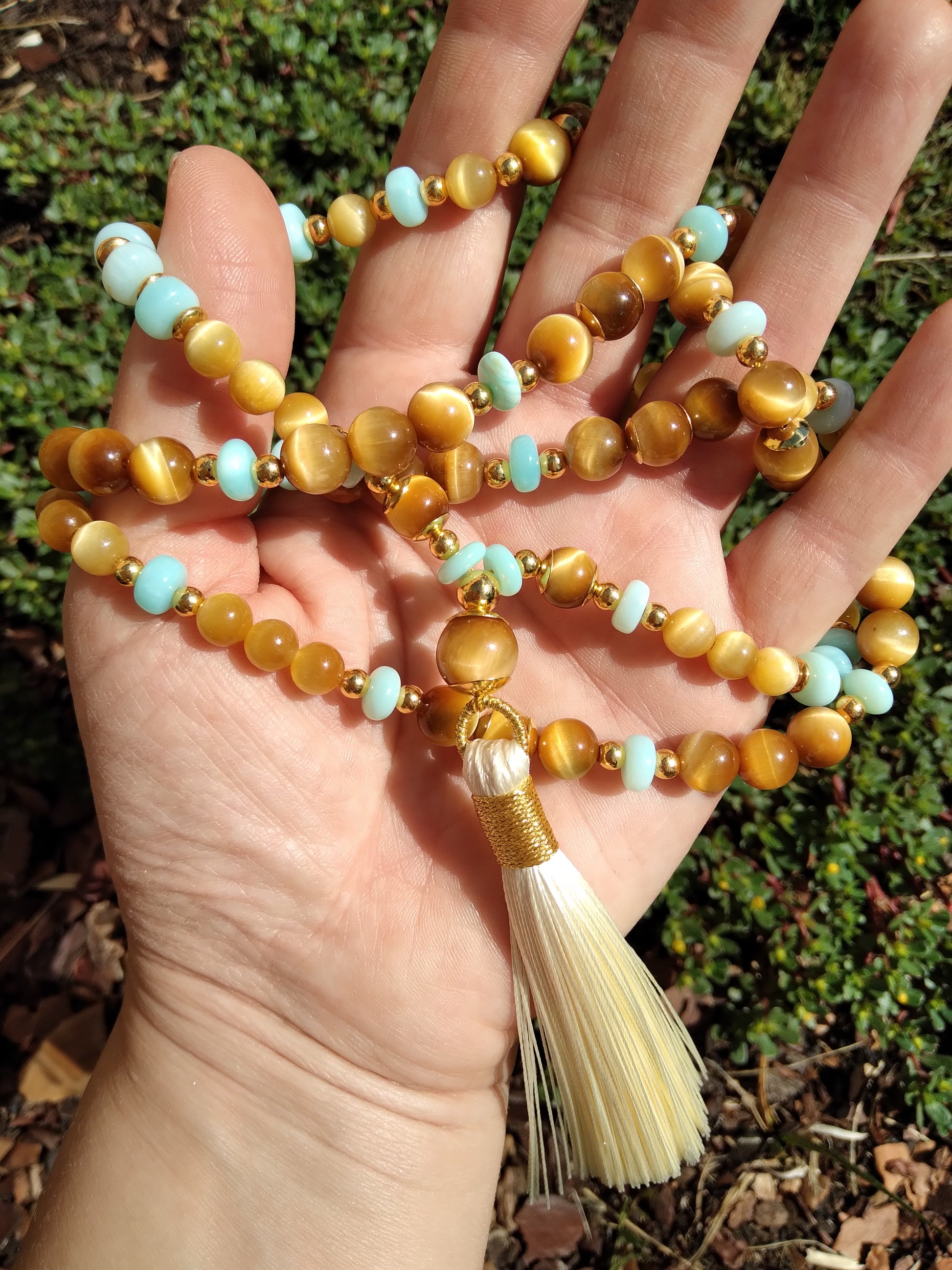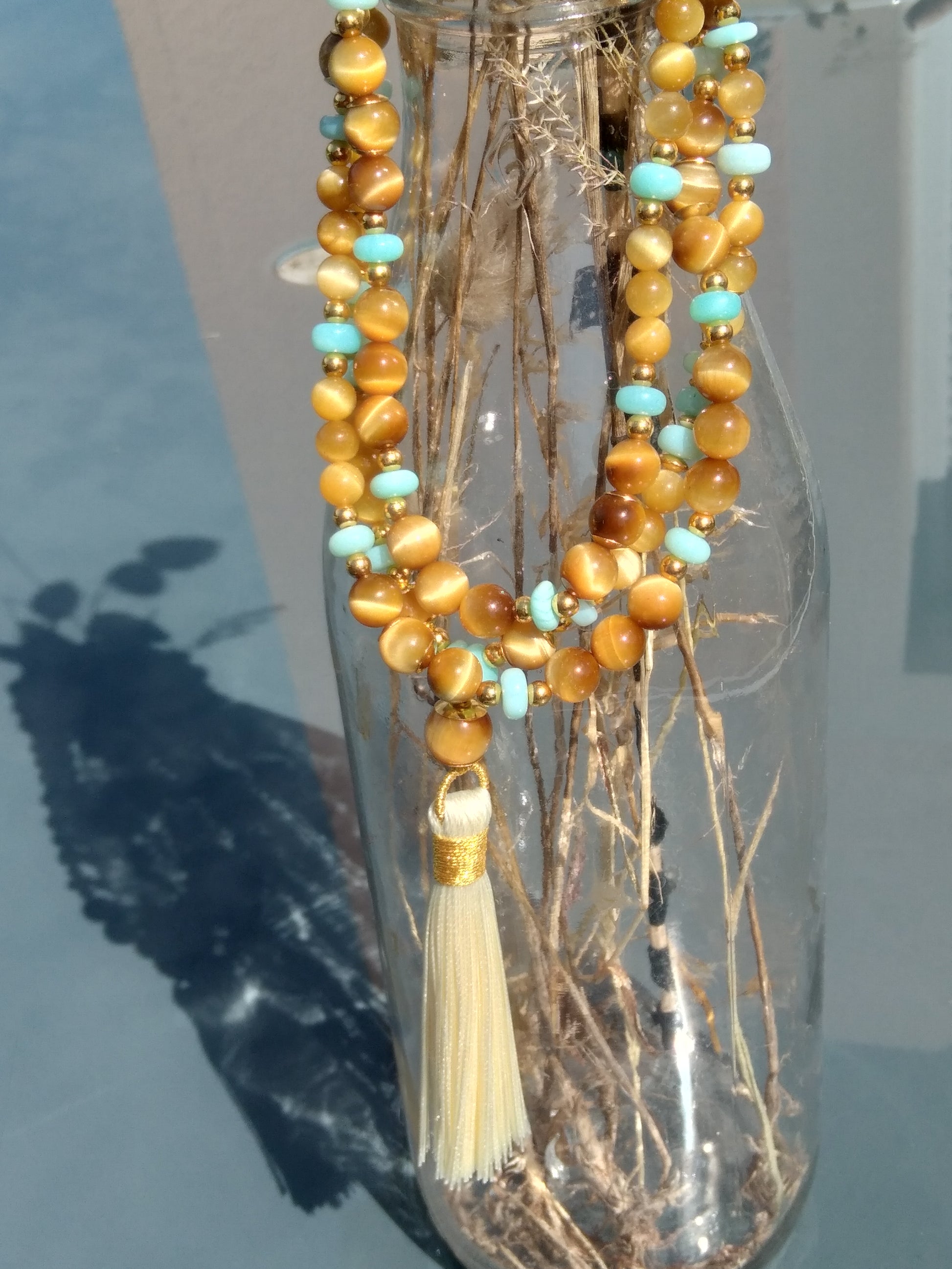 Perles en œil de tigre doré (œil de tigre camel en 8 mm et 6 mm) et perles en opale bleue rondelles.