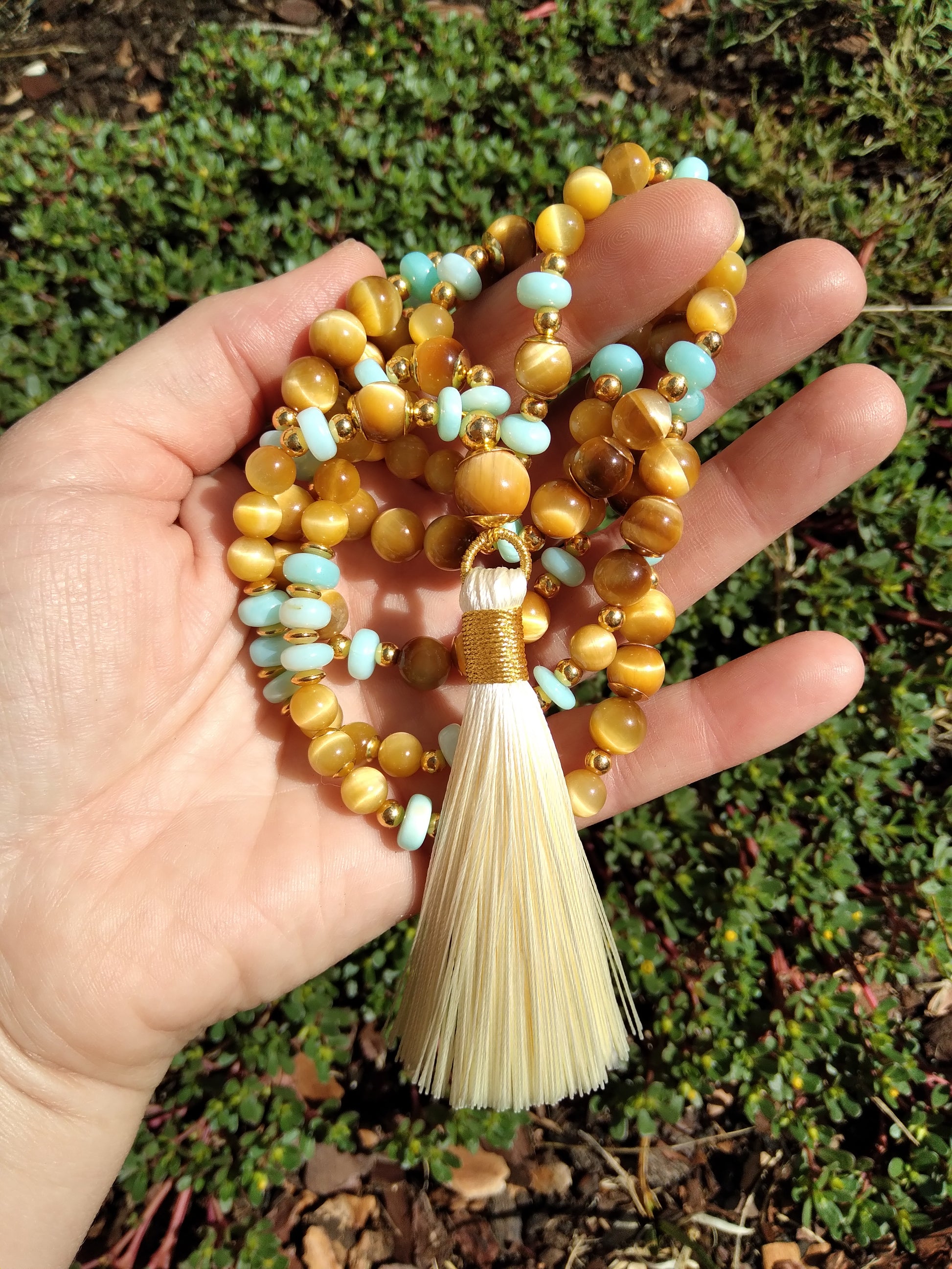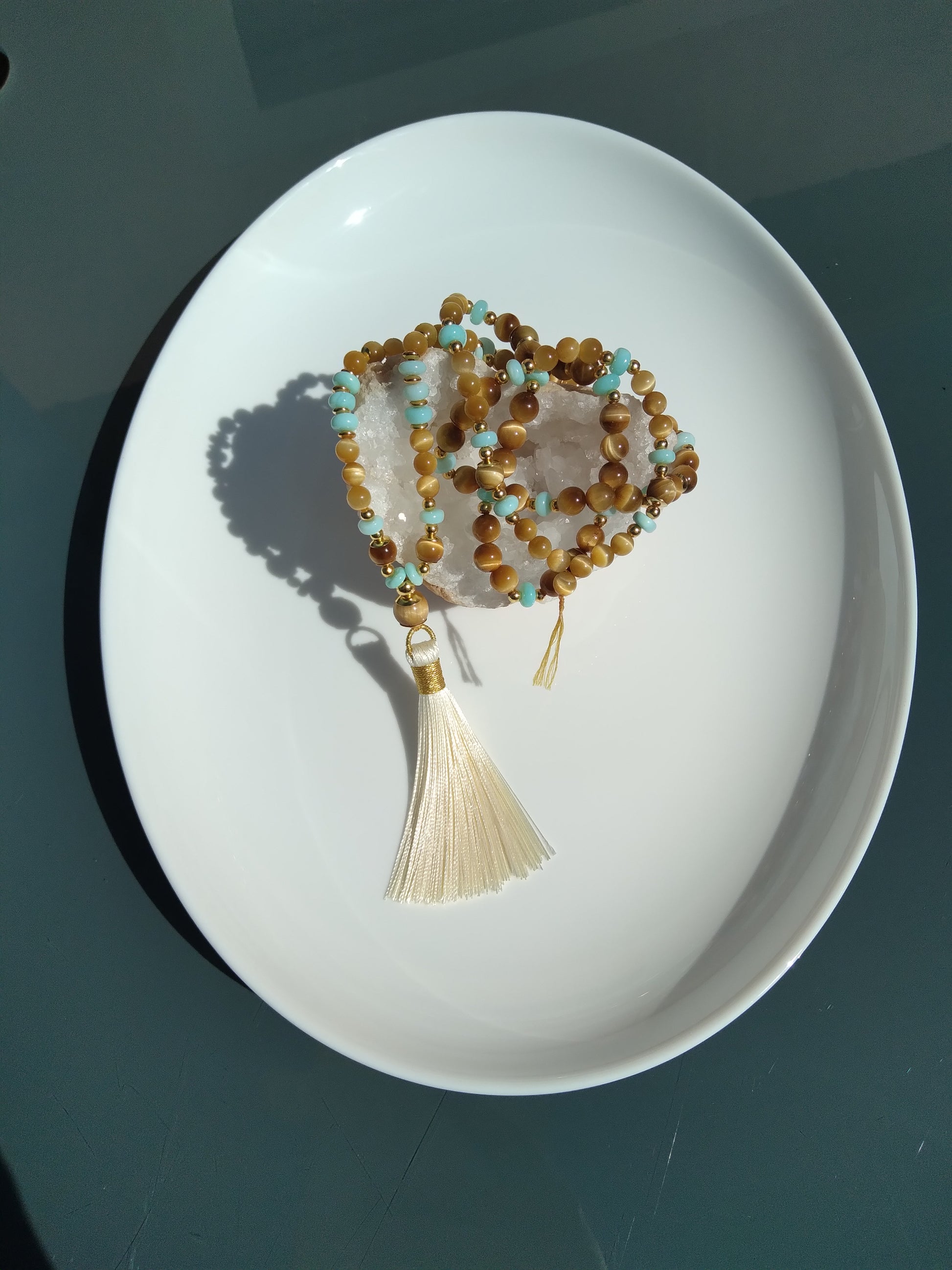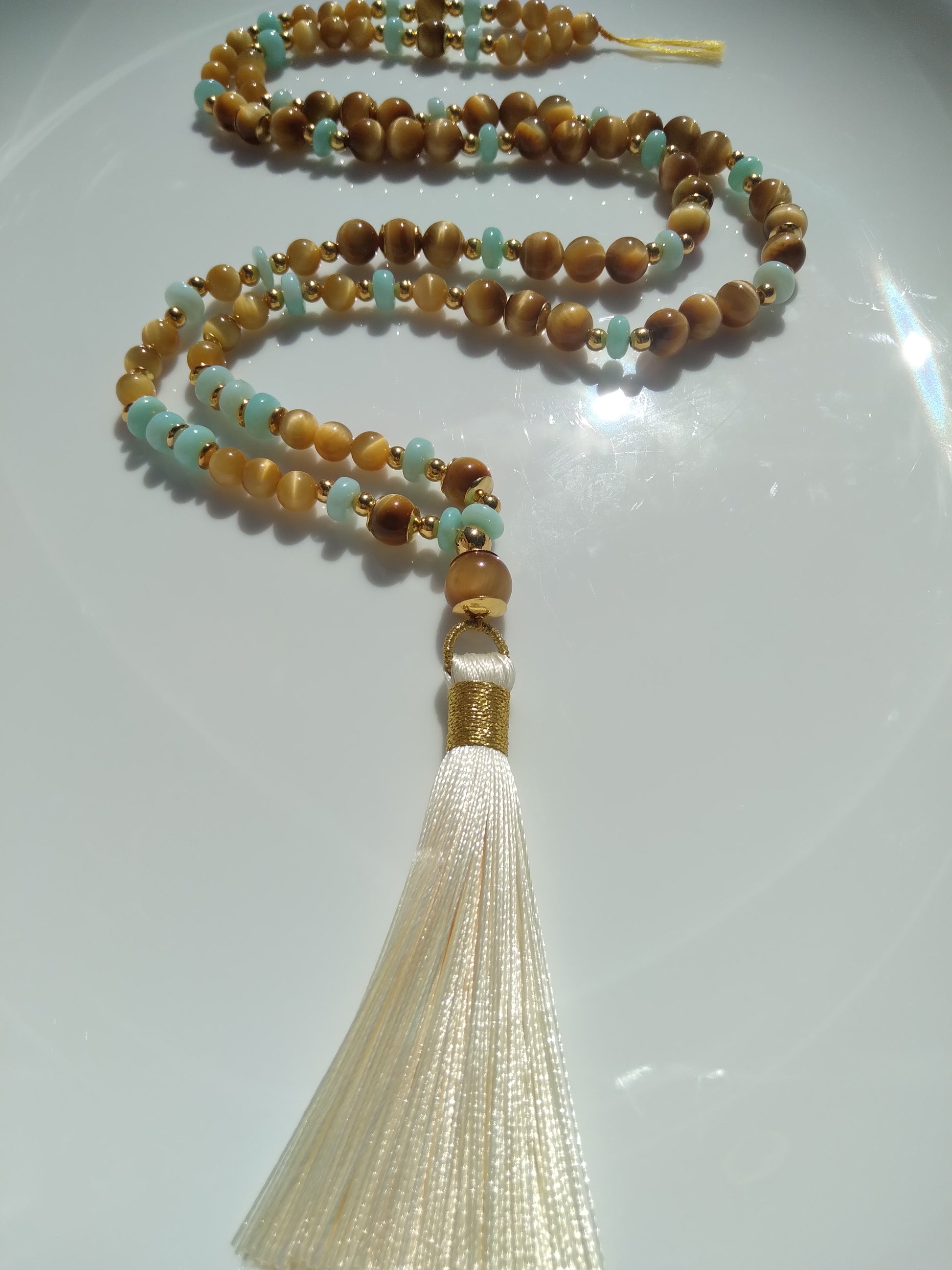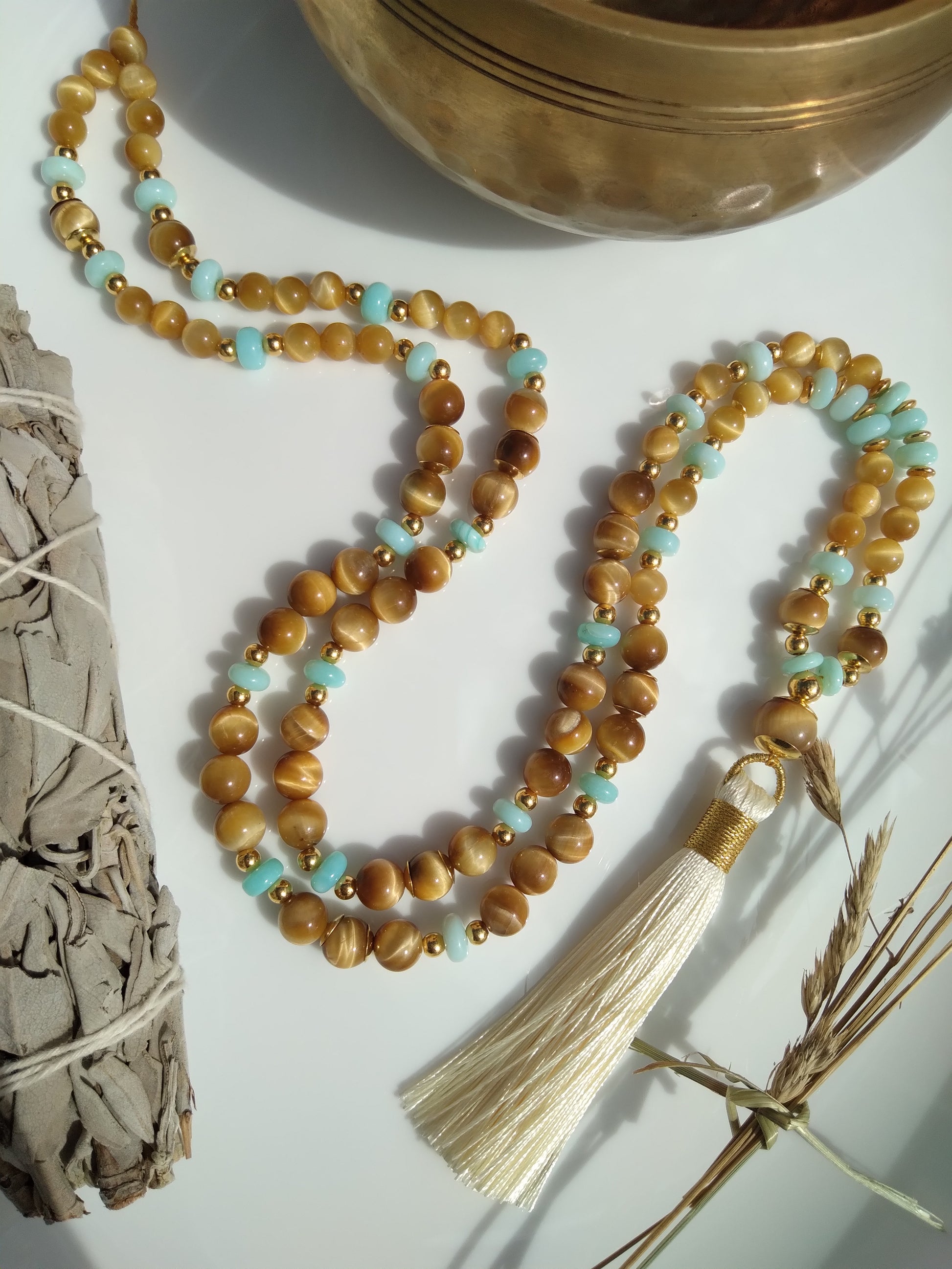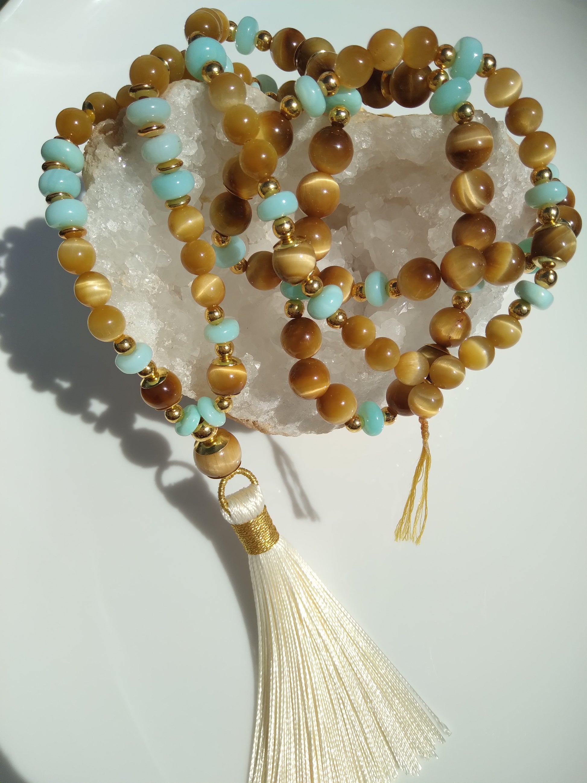 Perles en œil de tigre doré (œil de tigre camel en 8 mm et 6 mm) et perles en opale bleue rondelles.