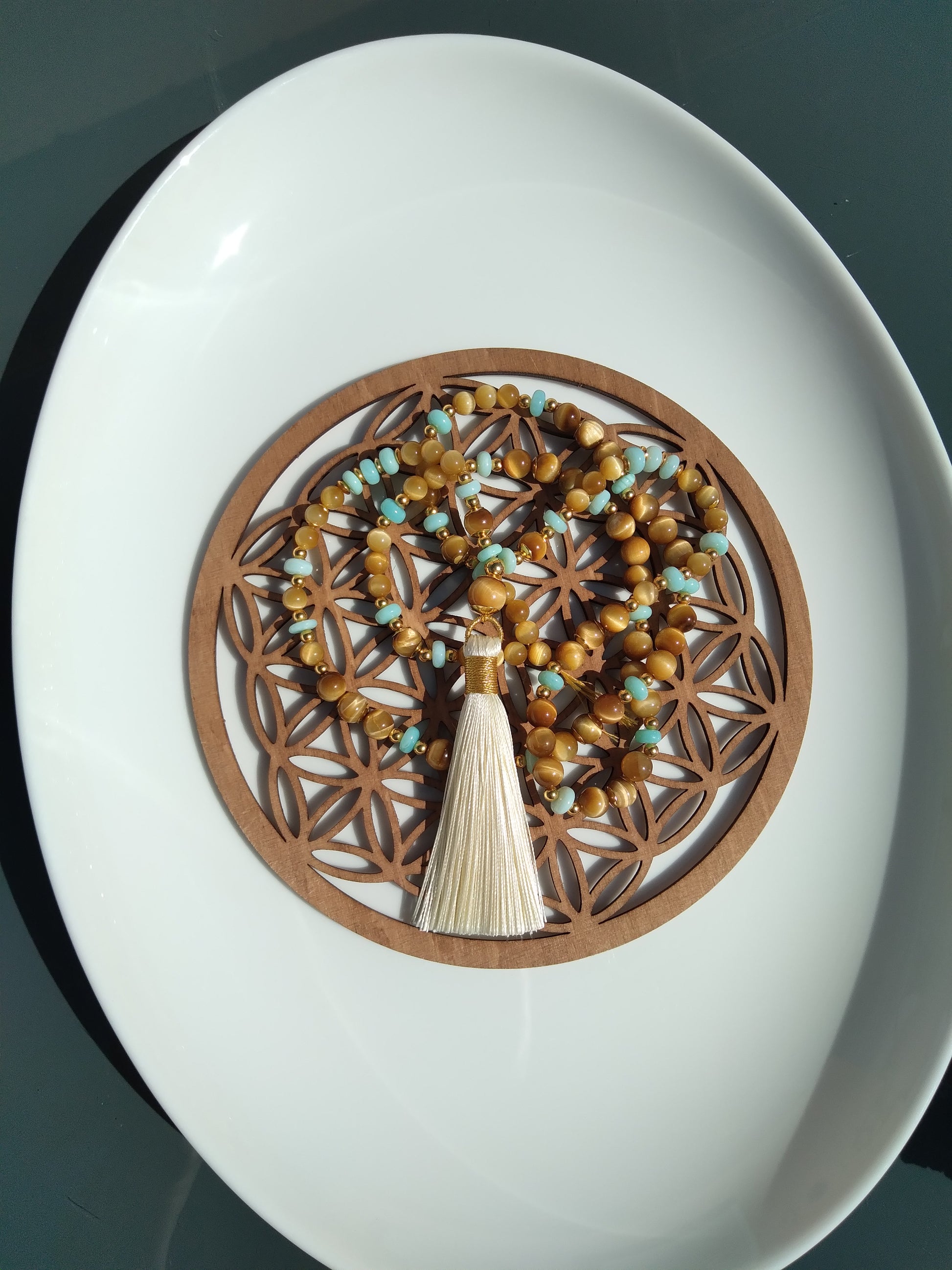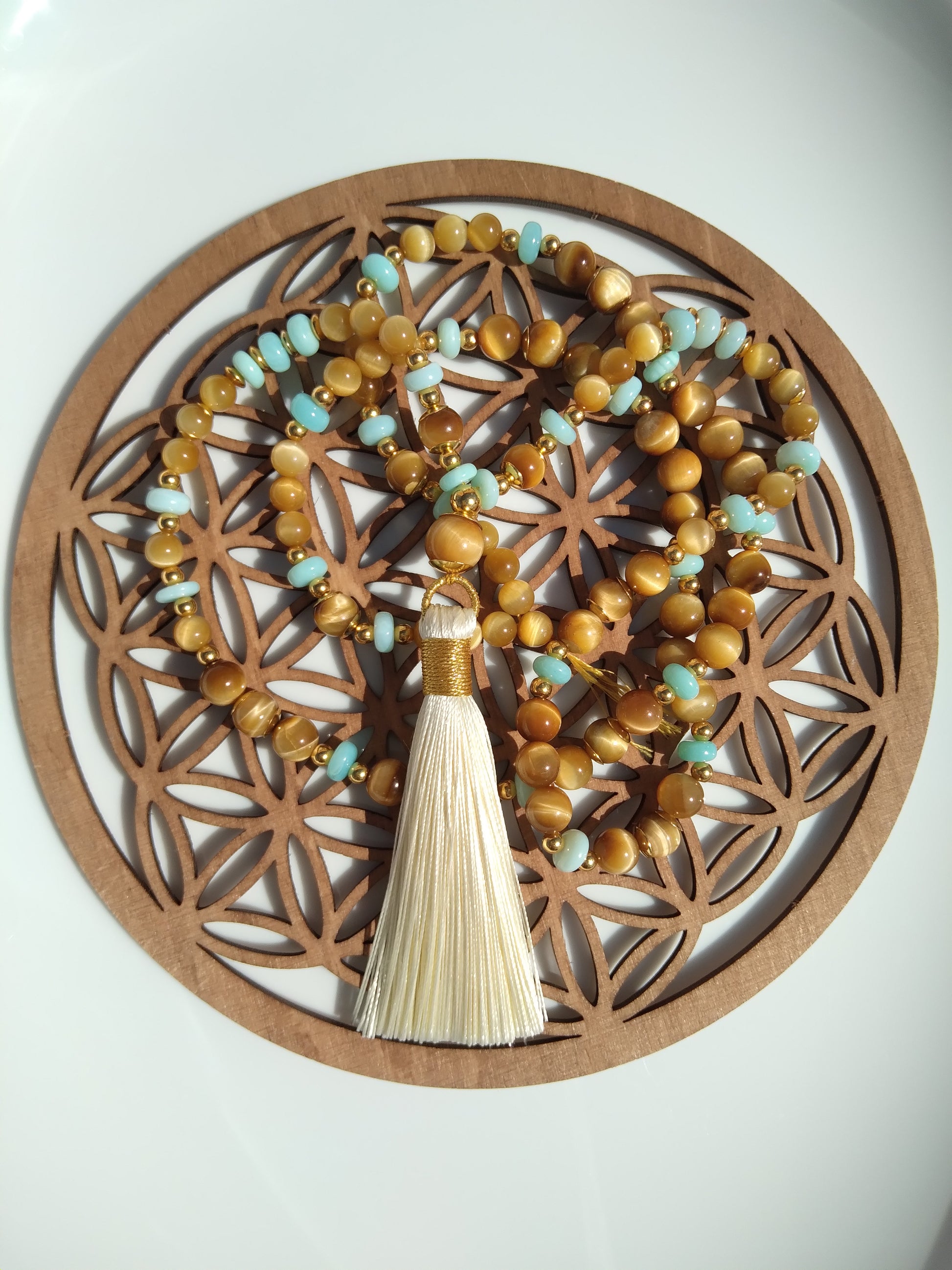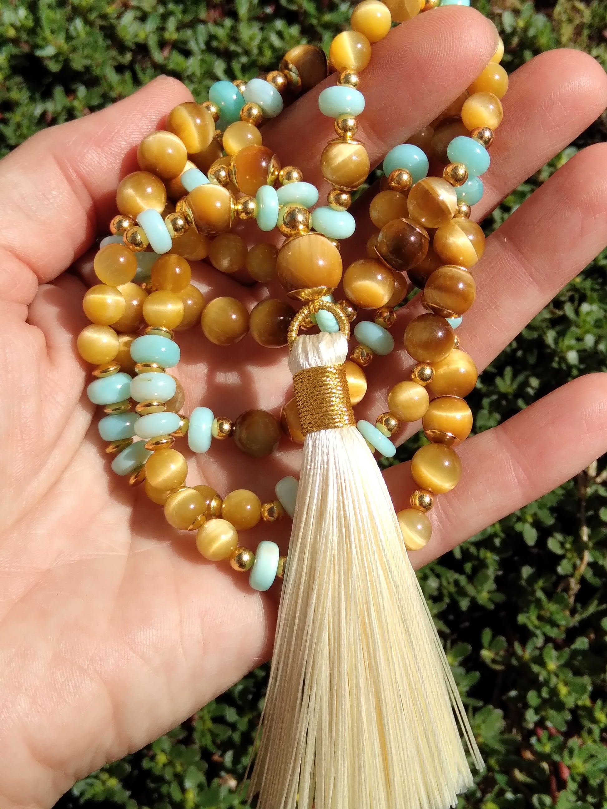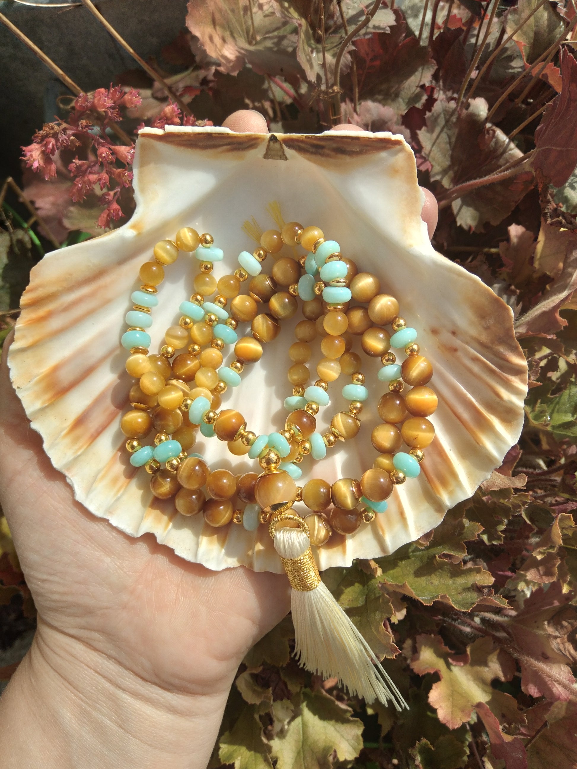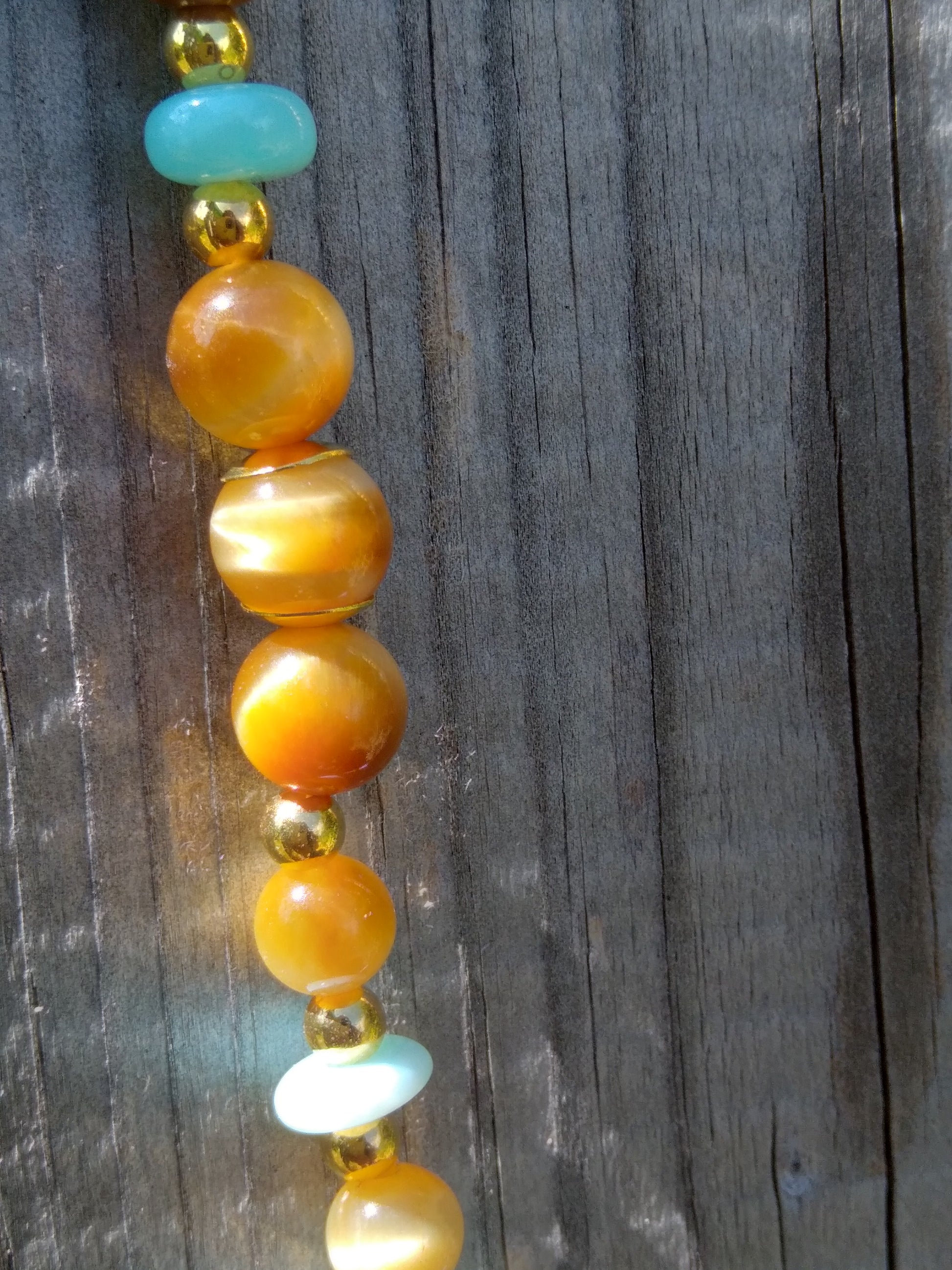 Perles en œil de tigre doré (œil de tigre camel en 8 mm et 6 mm) et perles en opale bleue rondelles.
