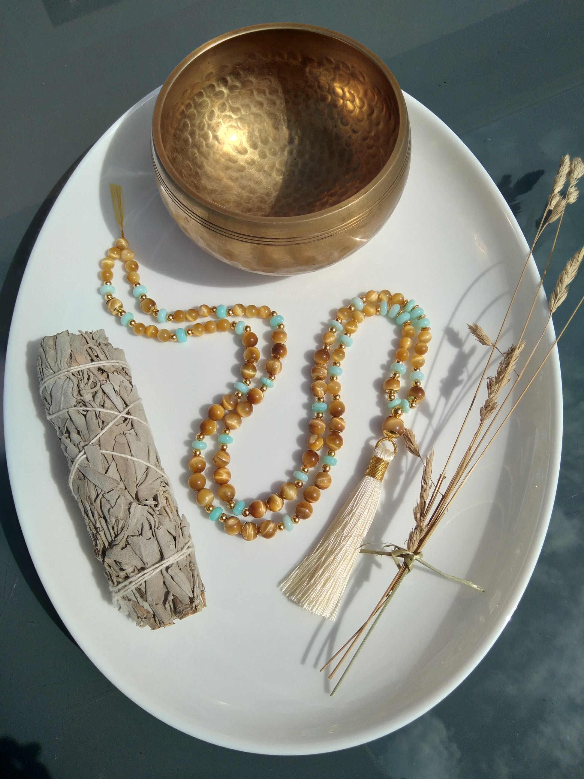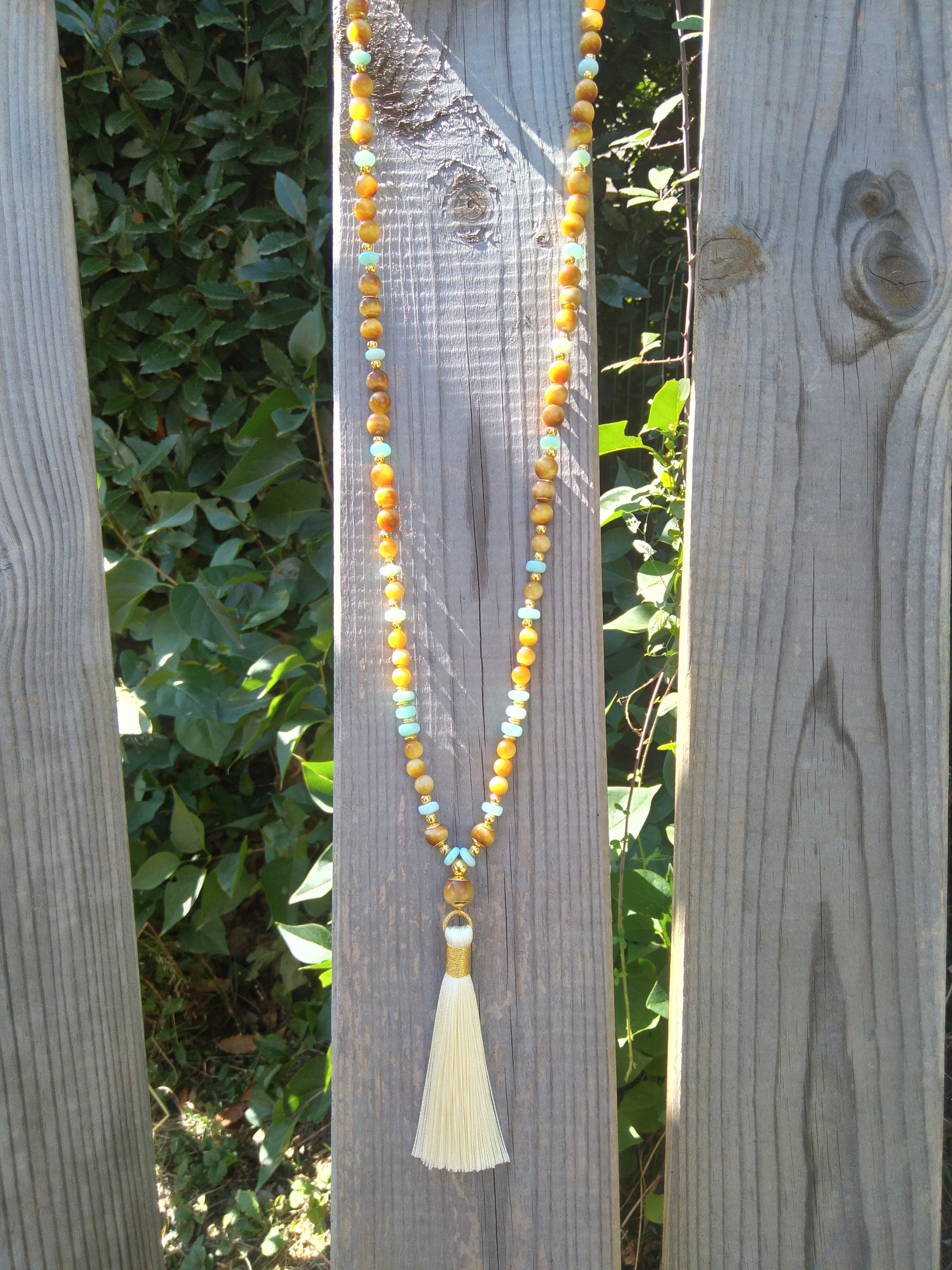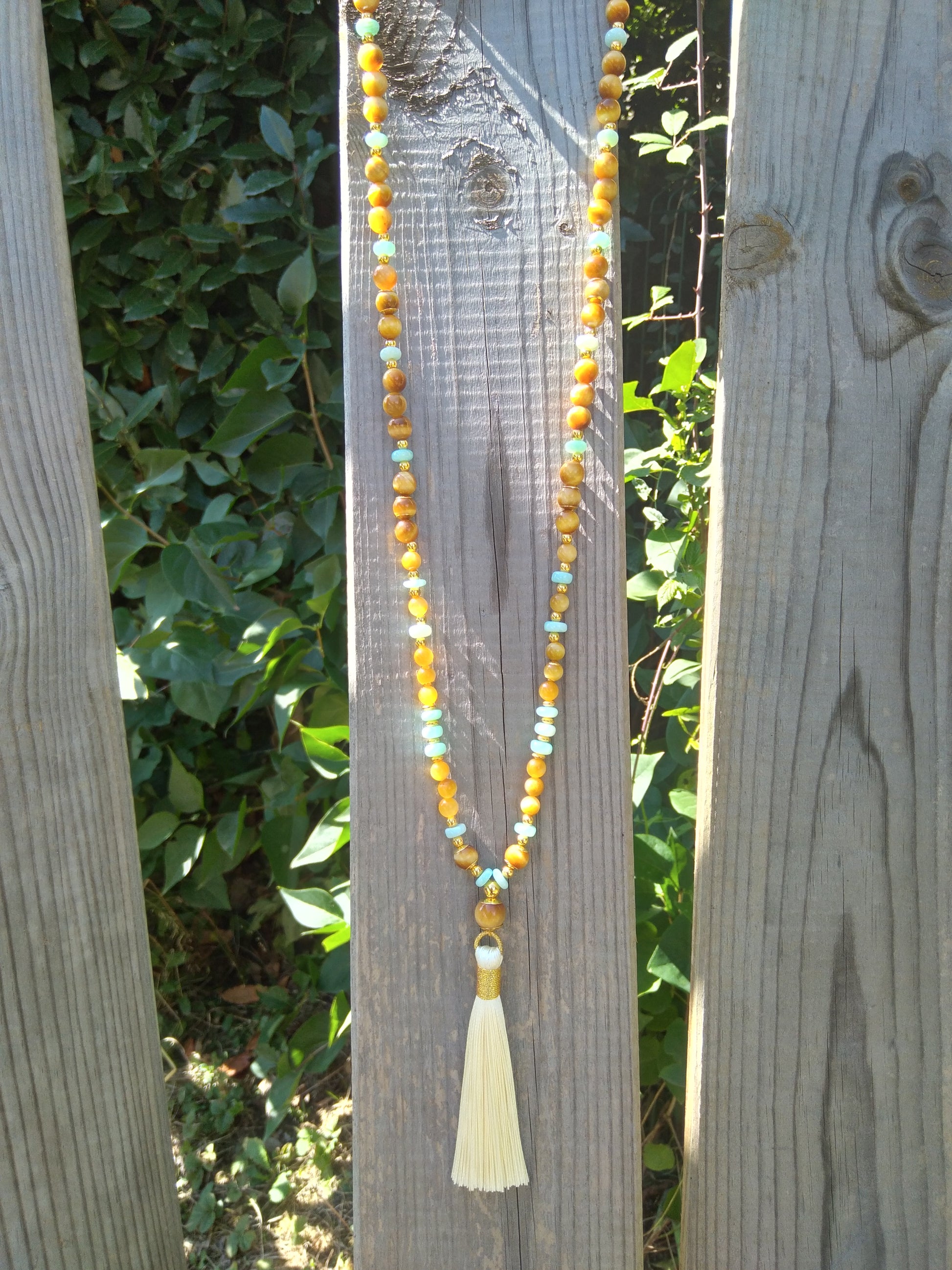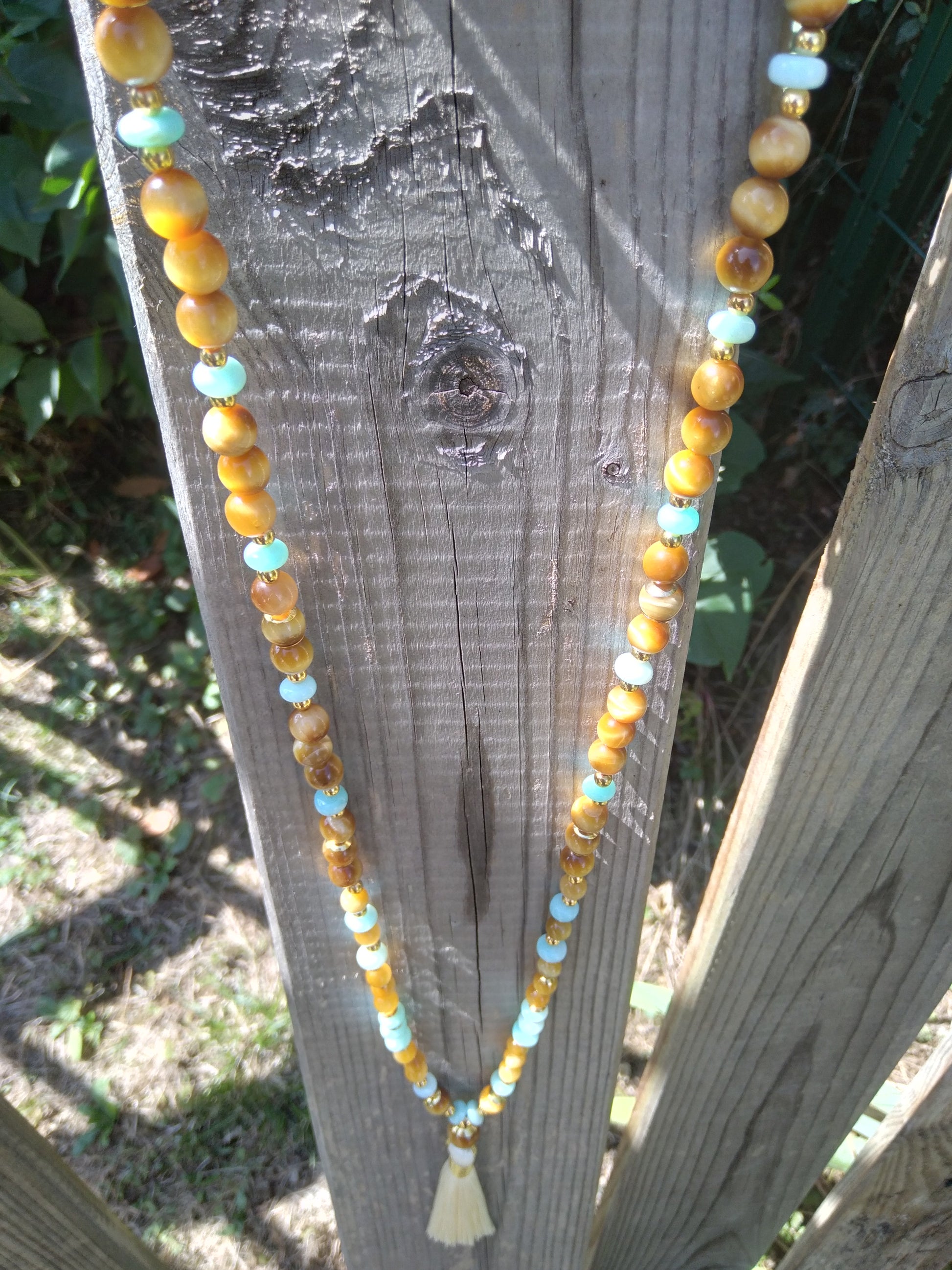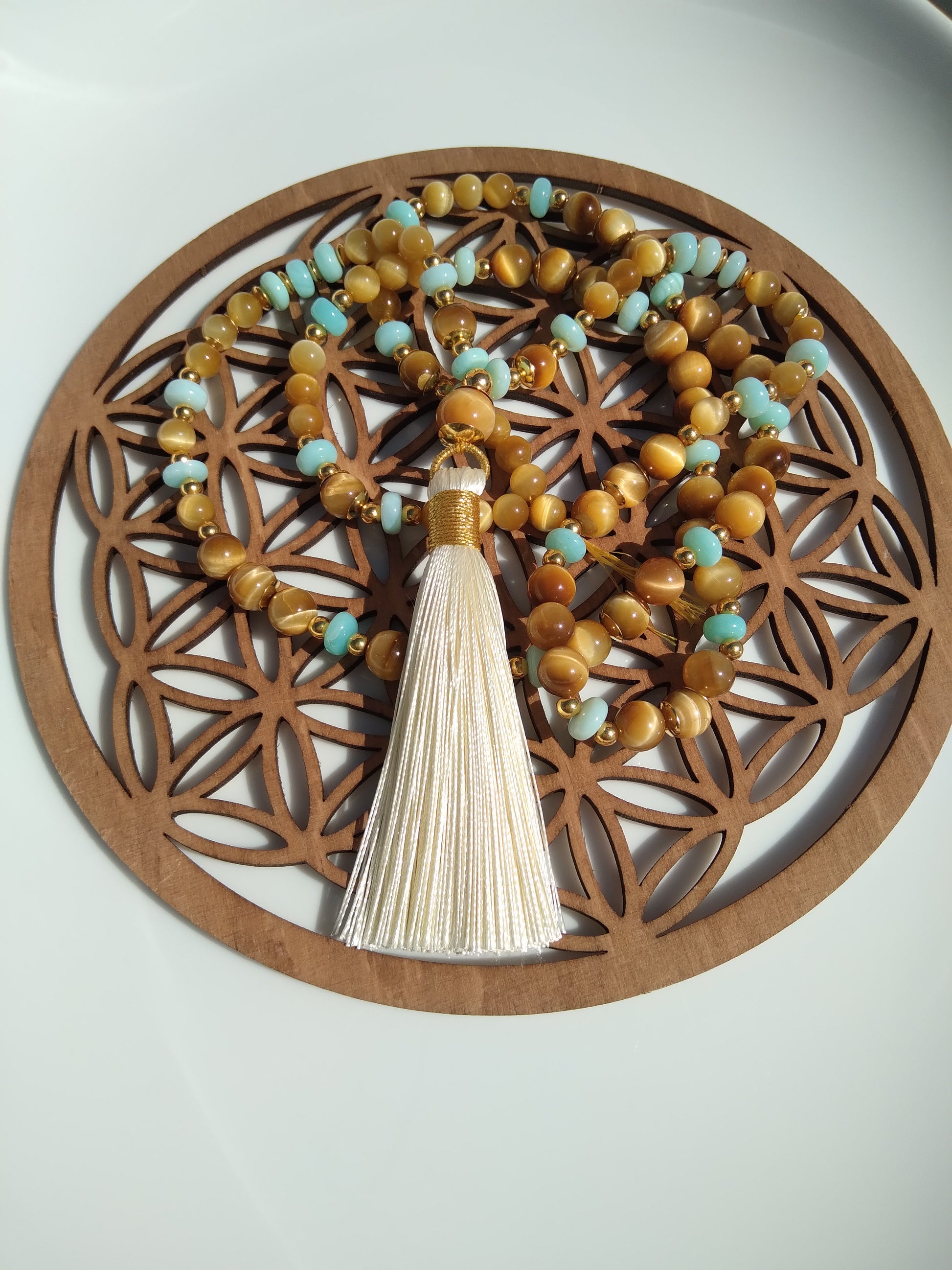 Perles en œil de tigre doré (œil de tigre camel en 8 mm et 6 mm) et perles en opale bleue rondelles.