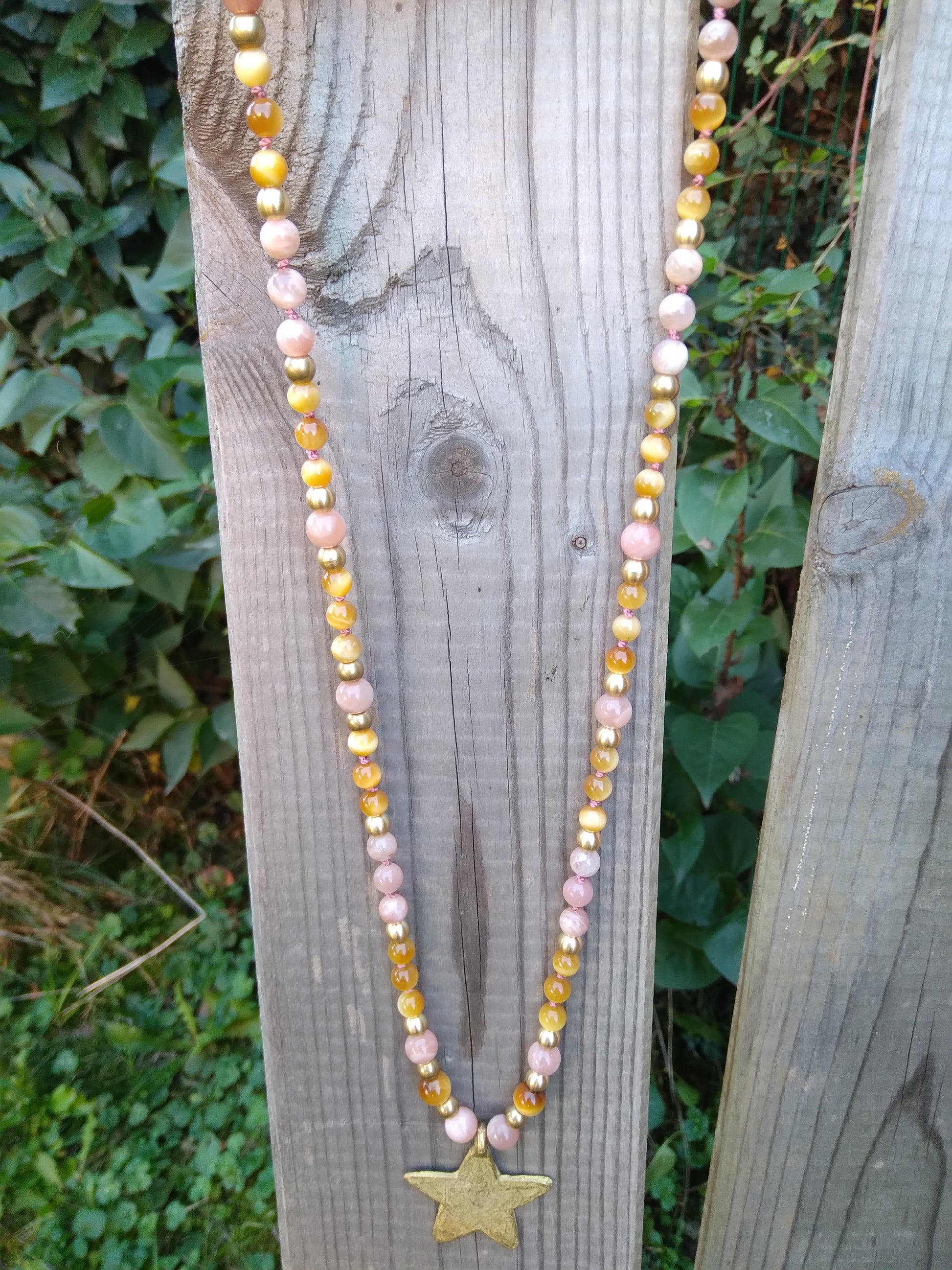 Ces belles pierres sont associées à des perles en laiton brut et à une étoile en bronze africain fabriquée à la main selon la technique de la cire perdue ♥