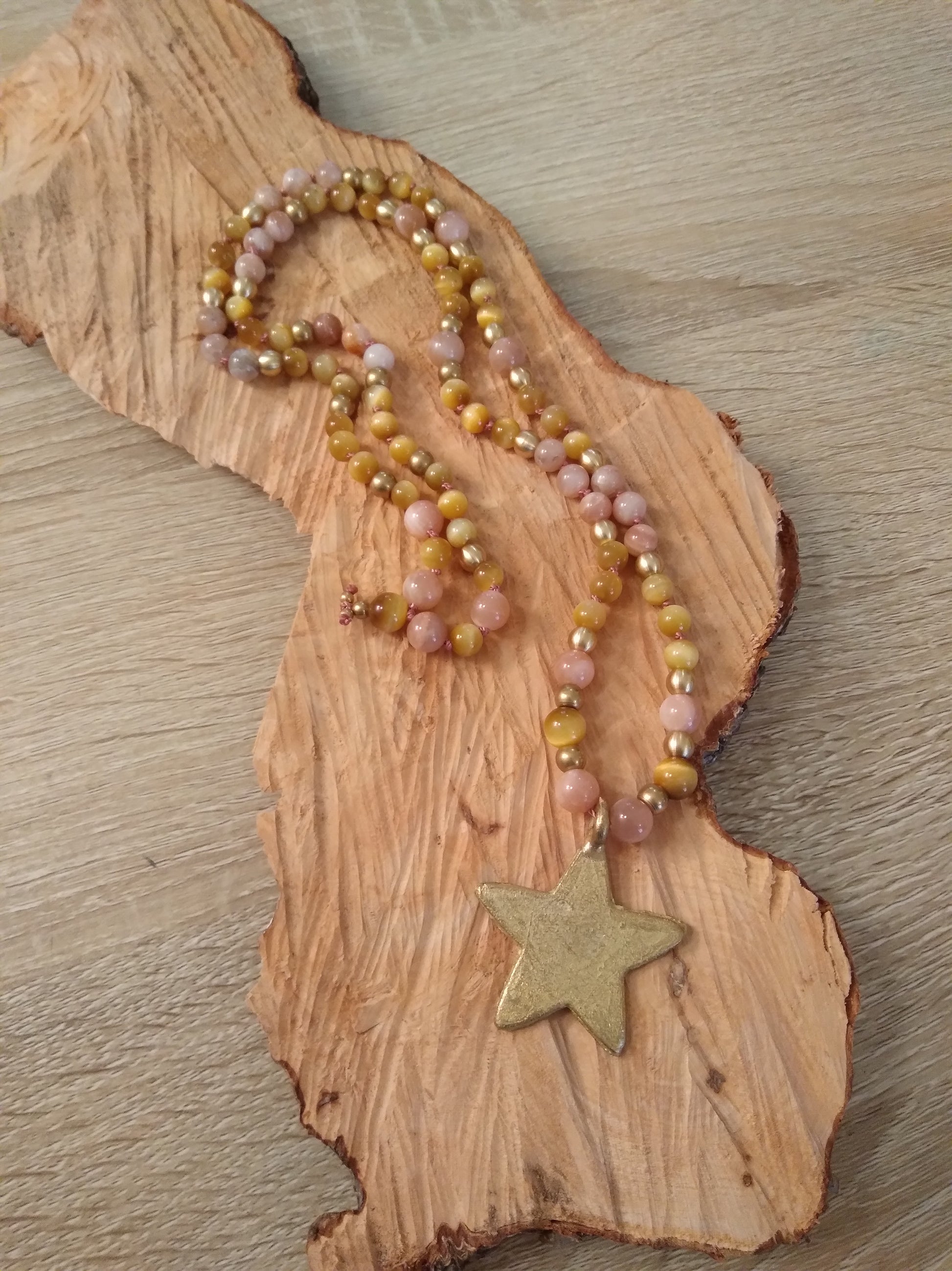 Mala en œil de tigre et pierre de lune rose "Bonne étoile"