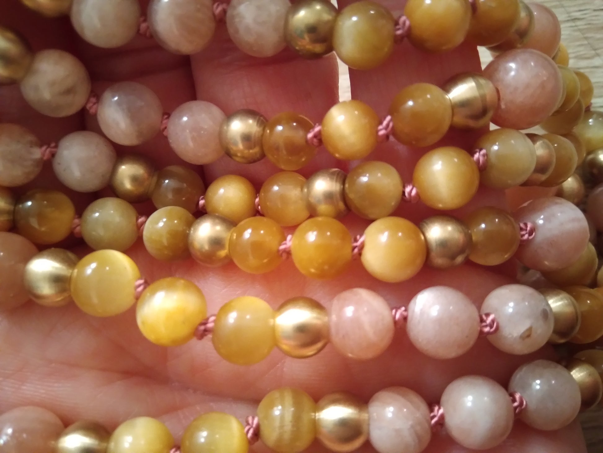 Mala necklace in tiger eye and pink moonstone composed of 108 natural stone beads