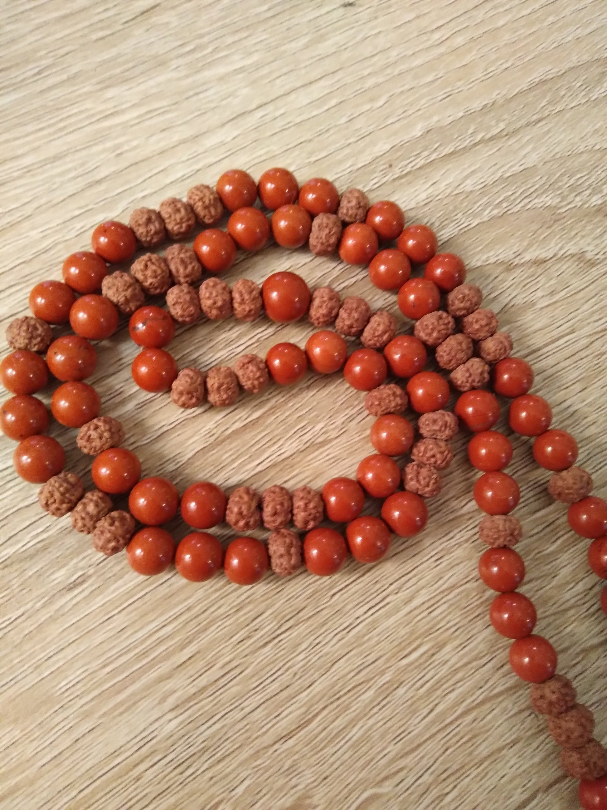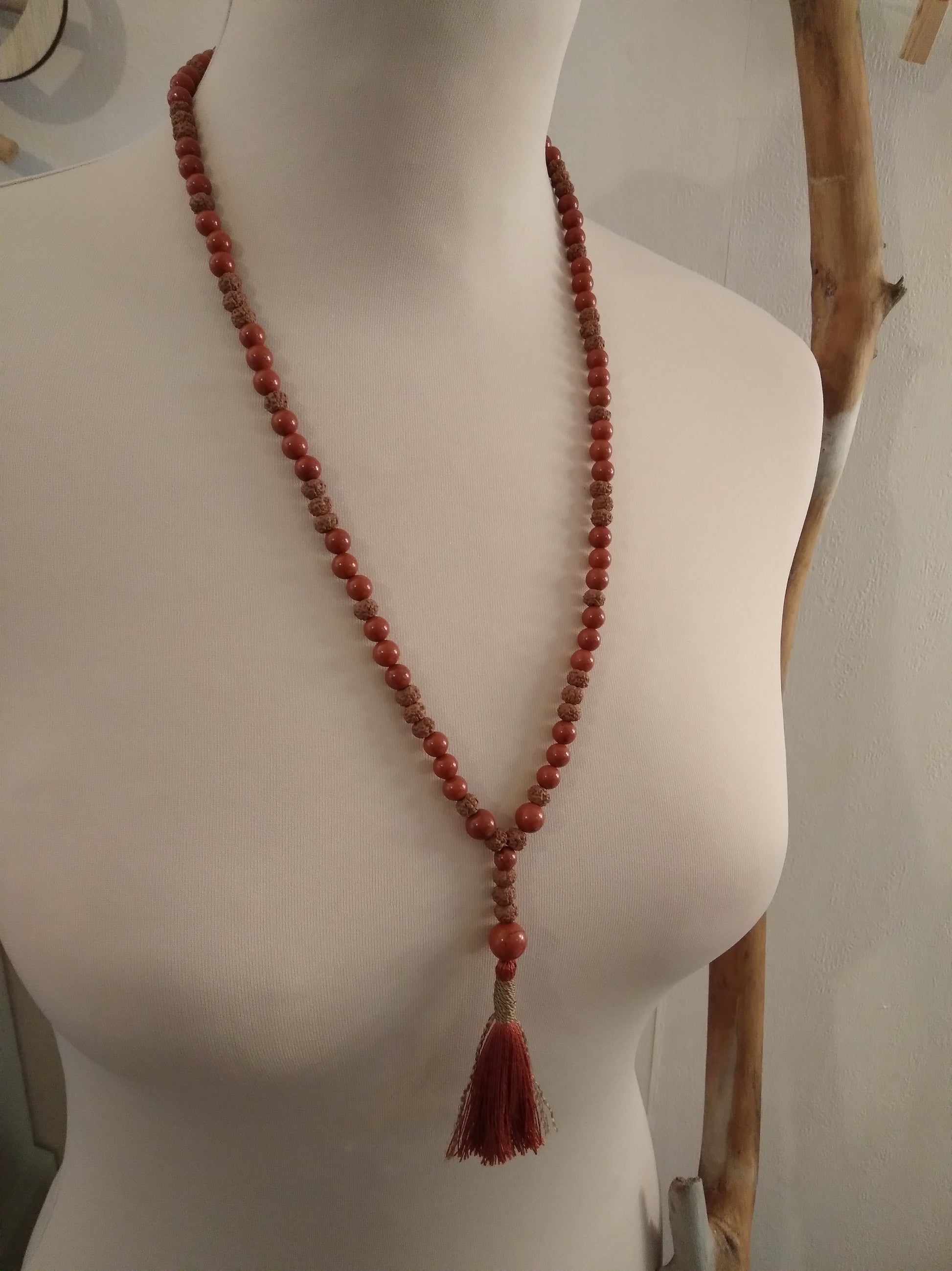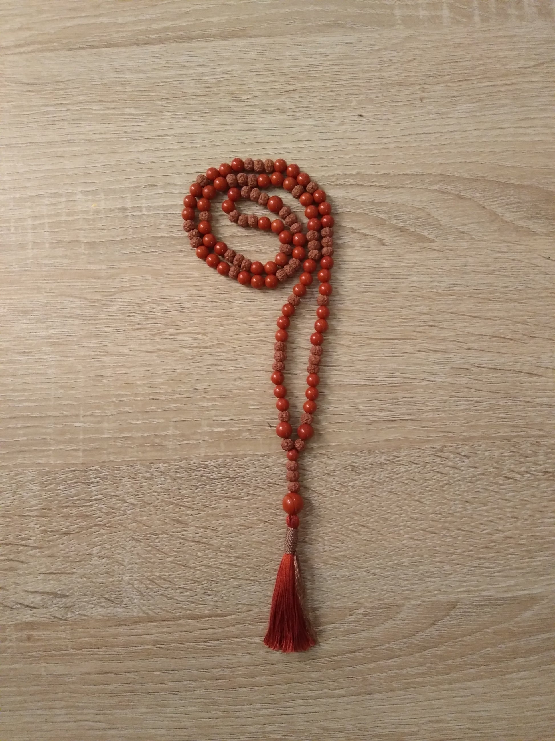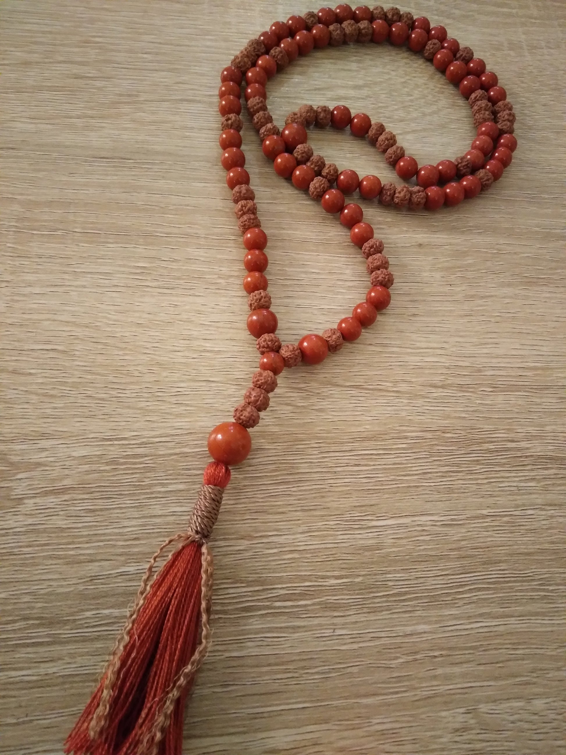Ce mala comprend des perles en jaspe rouge et des graines de rudraksha.